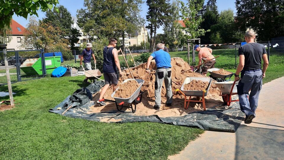 Ein großer LKW brachte am Morgen 12 Tonnen Sand für unsere Kita „Villa Kunterbunt“ in Freiberg.