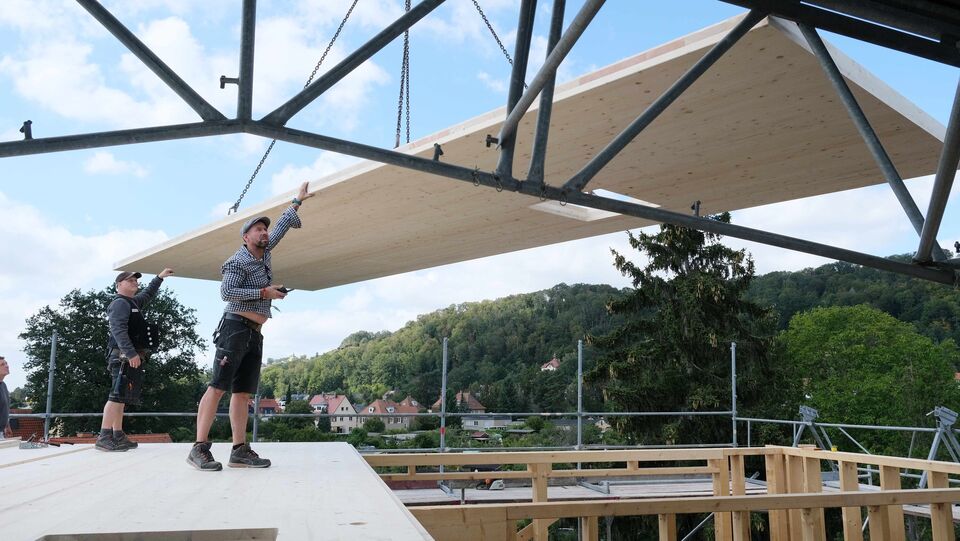 Ein riesiger Kran hat jetzt fünf Massivholz-Deckenplatten für das neue Dach unserer Kita auf der