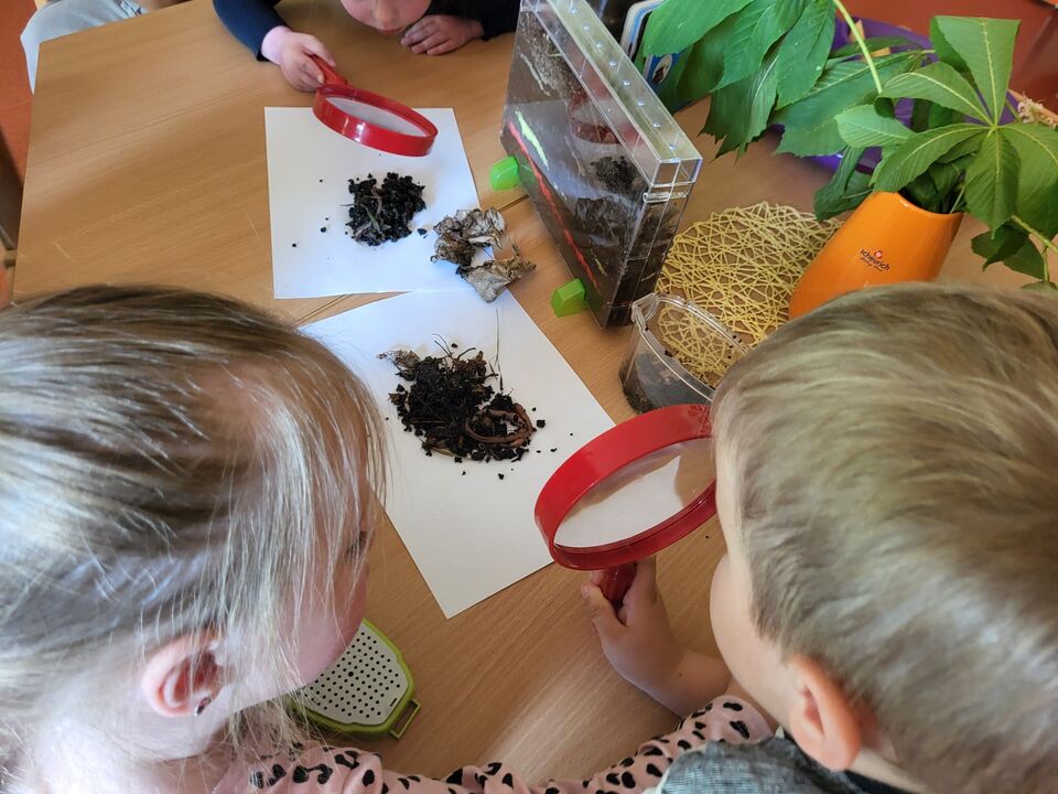 Kinder des roten Bereiches nehmen den Regenwurm genauer unter die Lupe.
