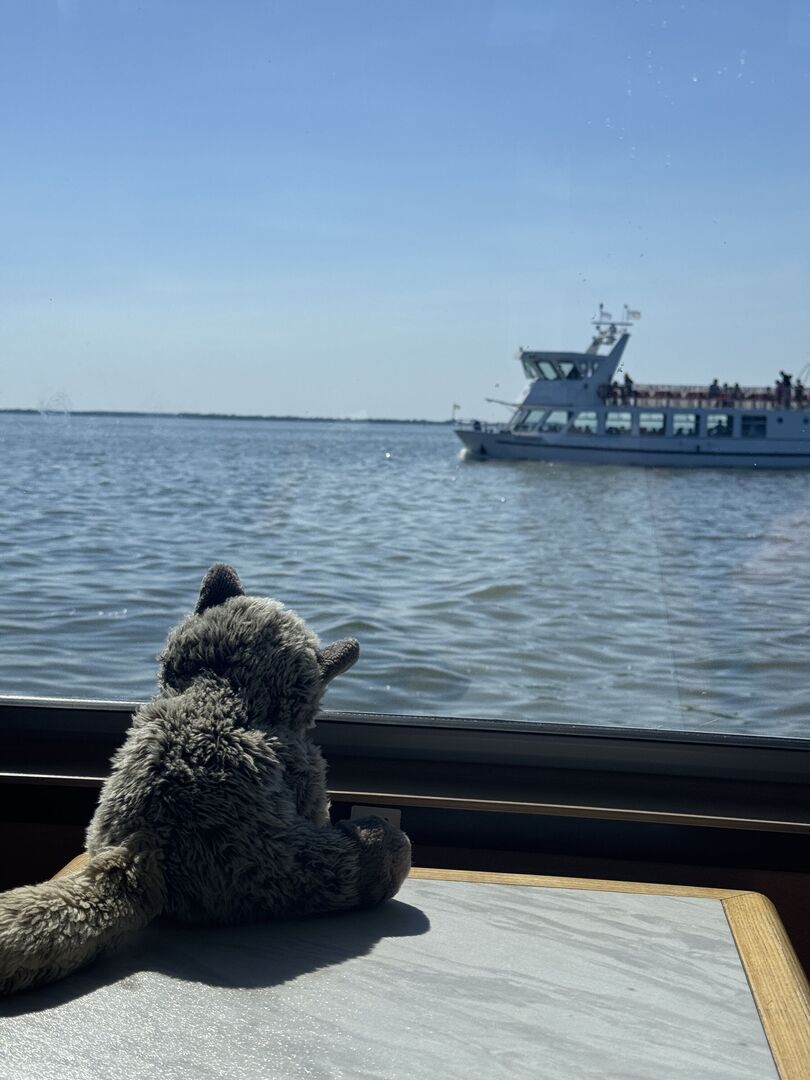 Am nächsten Tag wartete das nächste Highlight: Banana-Boot fahren! Während die Kinder und Jugendlichen mutig über die Wellen sausten, beobachtete der kleine Waschbär das bunte Treiben sicher vom Strand aus, denn er hat leider (noch) keine Schwimmstufe. Am Nachmittag ging es dafür auf große Schifffahrt, was er sichtlich genoss. Natürlich gab’s zwischendurch auch wieder ein Fischbrötchen – ein echter Favorit auf dieser Reise.