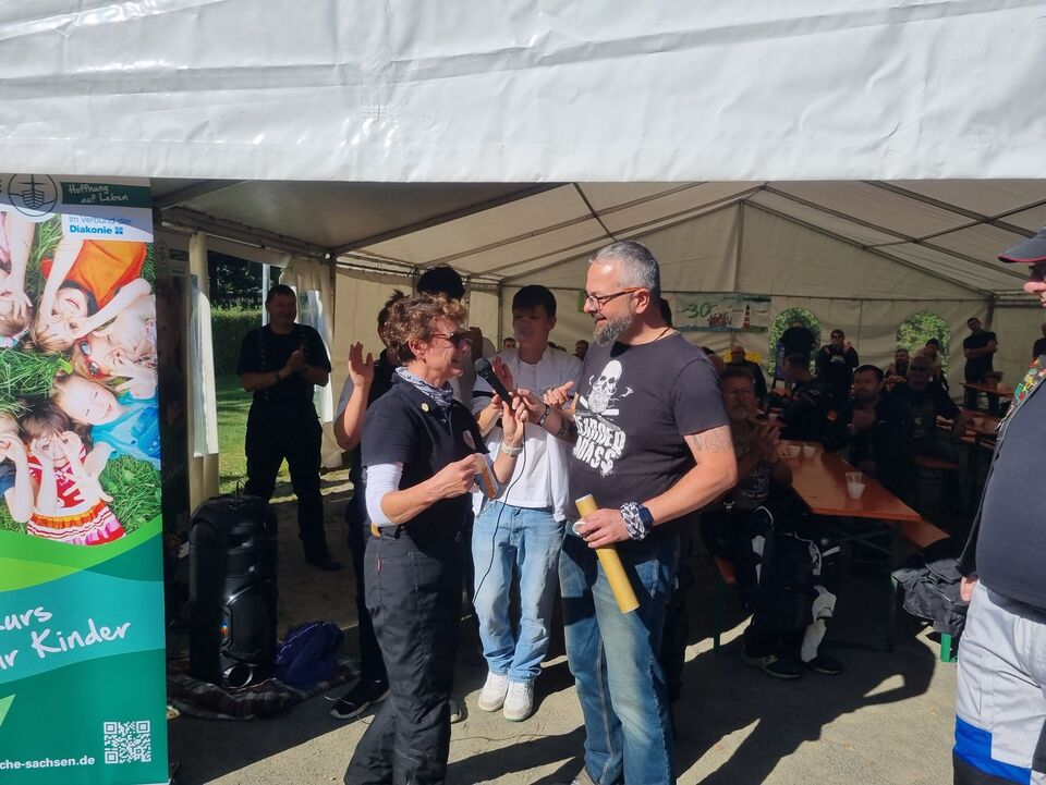Wir begrüßten die Biker bei herrlichstem Wetter mit einem kleinen Imbiss vor dem großen Zelt. Kinderarche-Vorstand Matthias Lang dankte herzlich allen Bikern: „Danke für Ihre Zeit und danke dafür, dass Sie unseren Kindern und Jugendlichen Jahr für Jahr dieses Abenteuer schenken!“ Einen besonderen Dank sprach er den Begleitern aus, die auch in diesem Jahr für die Sicherheit auf der Strecke sorgen: Polizei, Deutsches Rotes Kreuz, Johanniter-Unfall-Hilfe und zahlreiche Ordner.