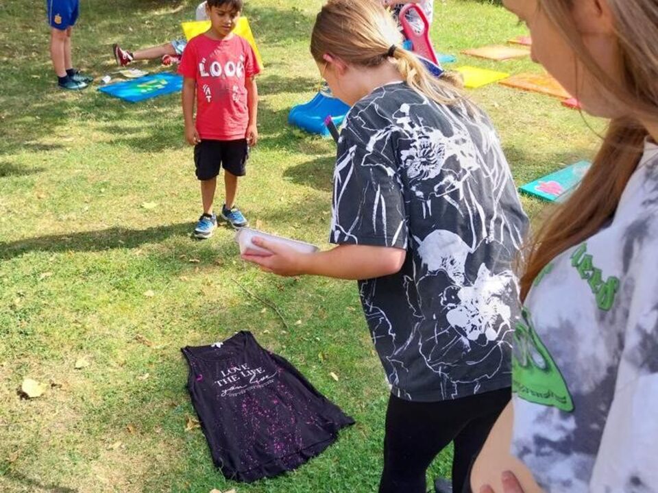 Auch gegenständliche Bilder sind entstanden und sogar ein paar T-Shirts wurden farbenfroh verziert. Die Kinder durften selbst entscheiden, ob sie ihre Kunstwerke behalten, verschenken oder zur Versteigerung freigeben wollen. Eine Handvoll wird nach der Bikerausfahrt am 16. September nun zur Versteigerung stehen. Von dem Erlös können weitere kreative Projekte umgesetzt werden, denn eines war ganz deutlich: Die Kinder hatten einen Riesen-Spaß an der Aktion und waren hinterher sehr stolz auf die entstandenen Werke.