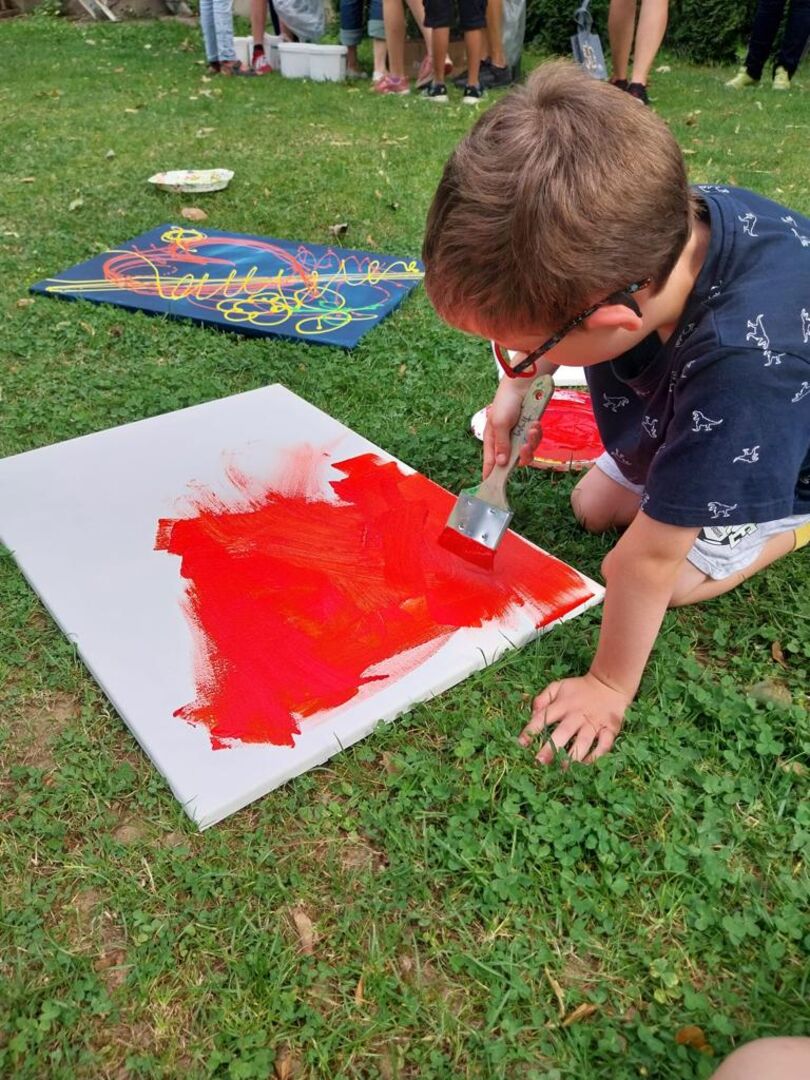 Auf großen Keilrahmen konnten die Kinder und Jugendlichen ihrer Phantasie freien Lauf lassen. Inspiriert von der Action-Painting-Technik des Künstlers Jackson Pollock haben die Mädchen und Jungen ihre Bilder zuerst mit ihren Lieblingsfarben grundiert und dann mit einem Spritzpinsel Kontrastfarben ergänzt. Schließlich haben sie Lackfarbe in wilden Bahnen über die Werke laufen lassen und waren über das Ergebnis oft selbst überrascht.