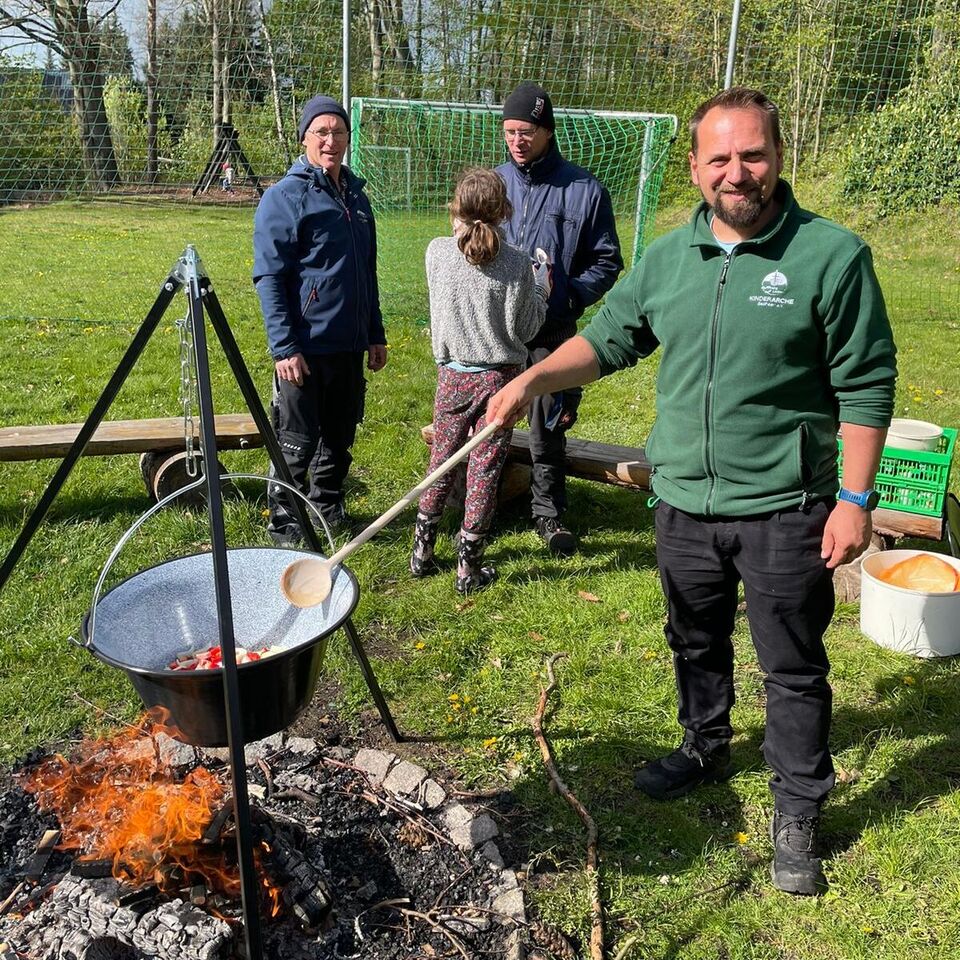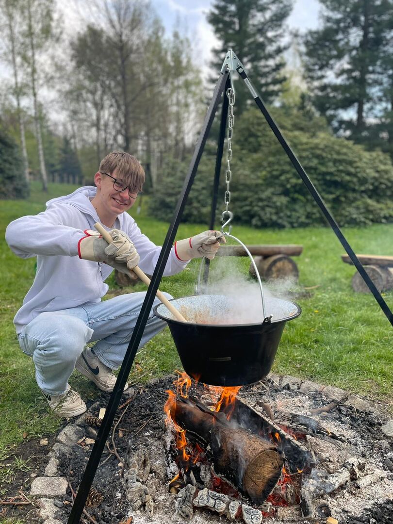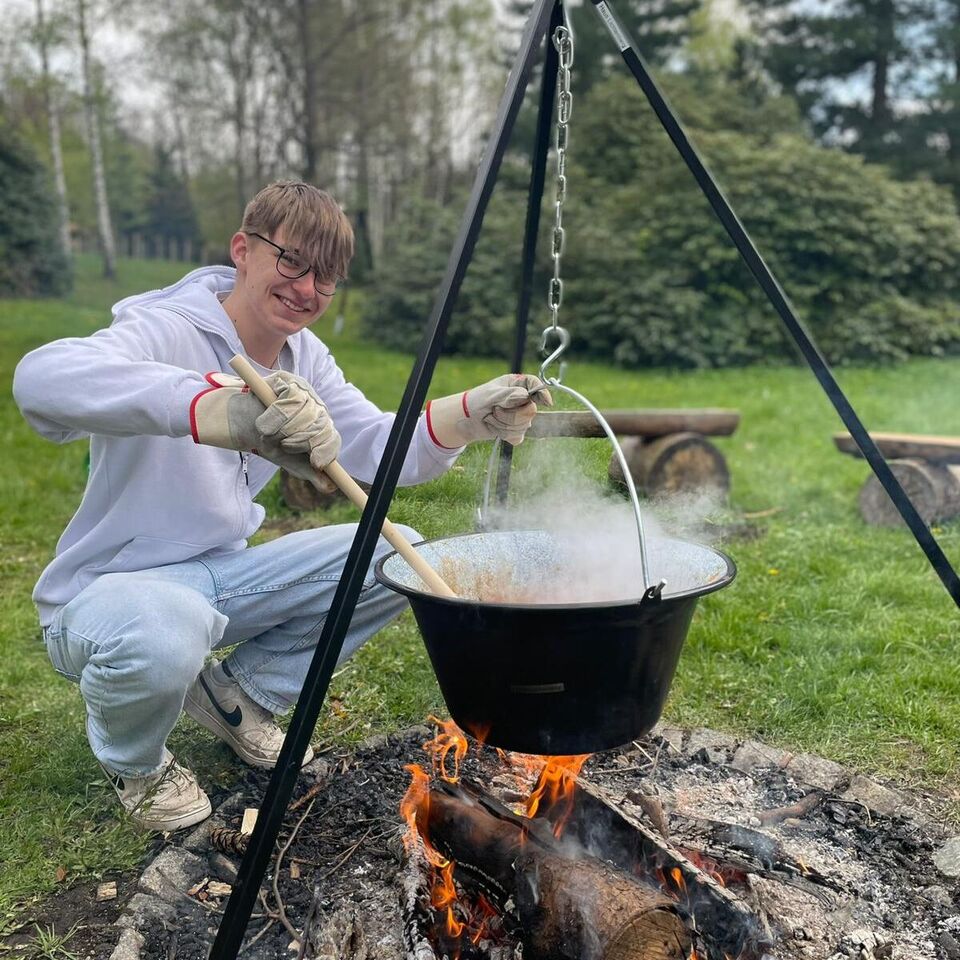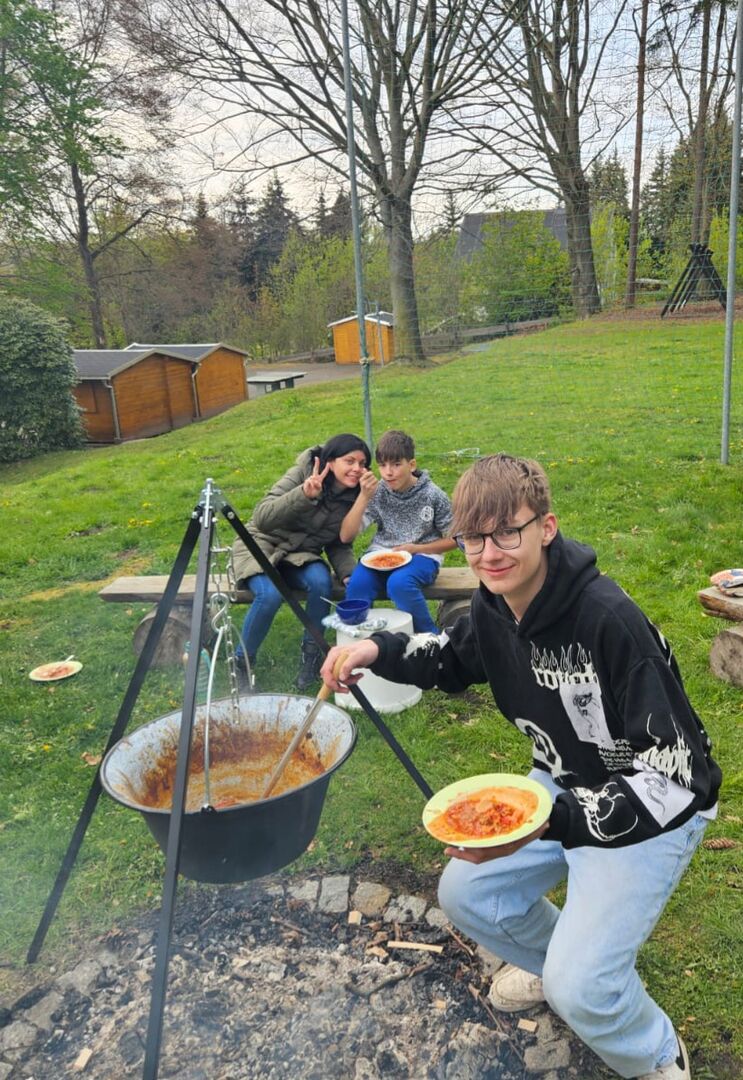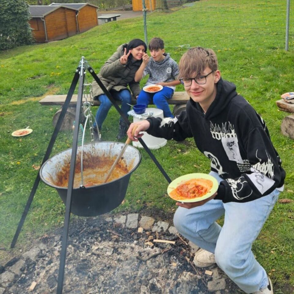 Nach getaner Arbeit waren alle hungrig. Herr Sperandio und Herr Irmscher kümmerten sich um das Feuer. Kessel drauf und los ging es. Niklas aus Wohngruppe 2 wachte über unseren Eintopf. Gemeinsam aßen wir dann den leckeren Pfundstopf.