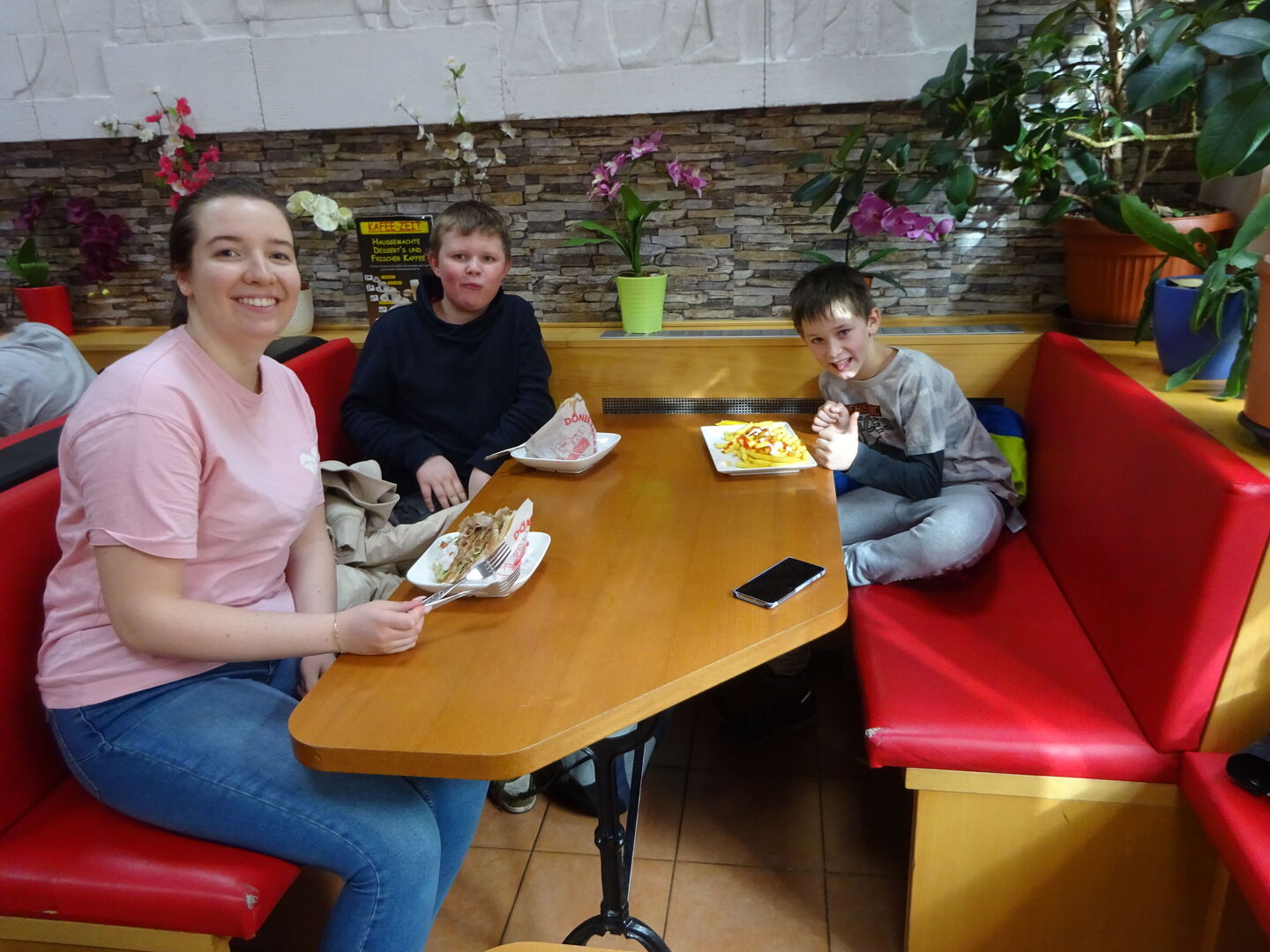 Nach einer Stunde Sprungpower waren alle platt. Trotzdem schaffte die Gruppe es noch zu Fuß zum nahegelegen Dönerbistro. Dort wurden wir schon erwartet. Für jeden Einzelnen nahmen sich die Mitarbeiter des Bistros Zeit, den Döner individuell zu belegen. Die Getränke gab es gratis dazu. Vielen Dank an das freundliche Mitarbeiterteam von Sultan Planet in Leipzig-Plagwitz und an den Spender, der uns diesen bewegten Ausflug ermöglicht hat!