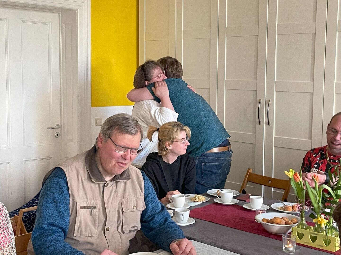 Fröhliches „Geschnatter“ verwandelte die Kaffeetafel in einen lebhaften Austausch von Erlebnissen des letzten Jahres. In der Kategorie: „weitgereiste Gäste“ belegte Herr Köhler, der aus Steinhagen anreiste, den ersten Platz und auf Platz zwei folgte ihm Michael Liebau, der extra Urlaub genommen hatte und aus Berlin nach Markkleeberg kam. Auch Nicole (die derzeit „älteste“ ehemalige Bewohnerin mit 46 Jahren) und ihr Bruder, Enrico Merkel, sowie Michel Glänzendorf fanden nach ihren Arbeitstagen noch die Zeit, uns zu besuchen. Weitere Gäste waren die ehemaligen Kolleginnen Frau Amft, Frau Sander, Frau Gähler, Herr Schrepper, unser ehemaliger Hausmeister, und Frau Poitzsch, die frühere Leiterin des Kinderheims Kleinliebenau, sowie die ehemalige Leiterin, Frau Gerike.