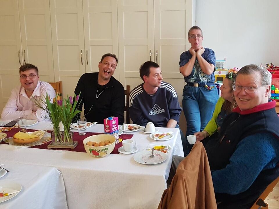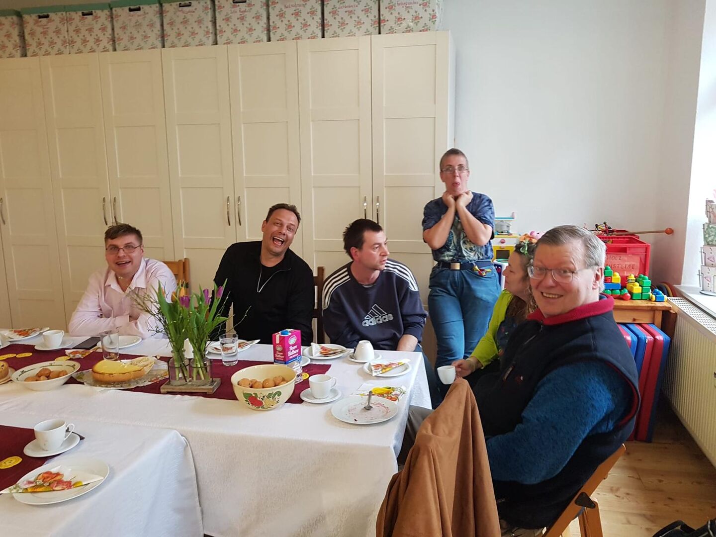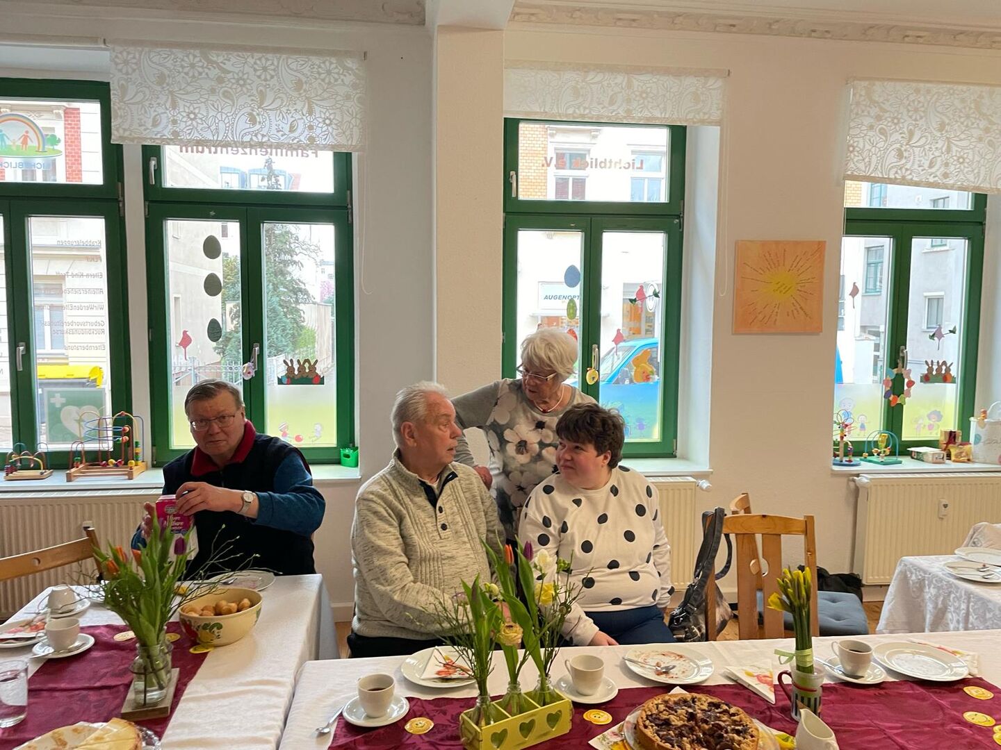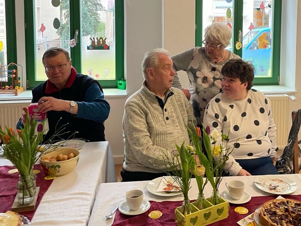 Mit dem perfekt eingespielten Team war alles pünktlich fertig, als die ersten Gäste kamen. Wir freuten uns besonders, dass Familie Otto mit Sandra wieder der Einladung folgte, auch die früheren Hauswirtschafterinnen Frau Bielefeld und Frau Paufler waren gekommen. Fröhliches „Geschnatter“ verwandelte die Kaffeetafel in einen lebhaften Austausch von Erlebnissen des letzten Jahres. In der Kategorie „Weitgereiste Gäste“ belegte Herr Köhler, der aus Steinhagen anreiste, den ersten Platz und auf Platz zwei folgte ihm der ehemalige Bewohner Michael Liebau, der extra Urlaub genommen hatte und aus Berlin nach Markkleeberg kam.