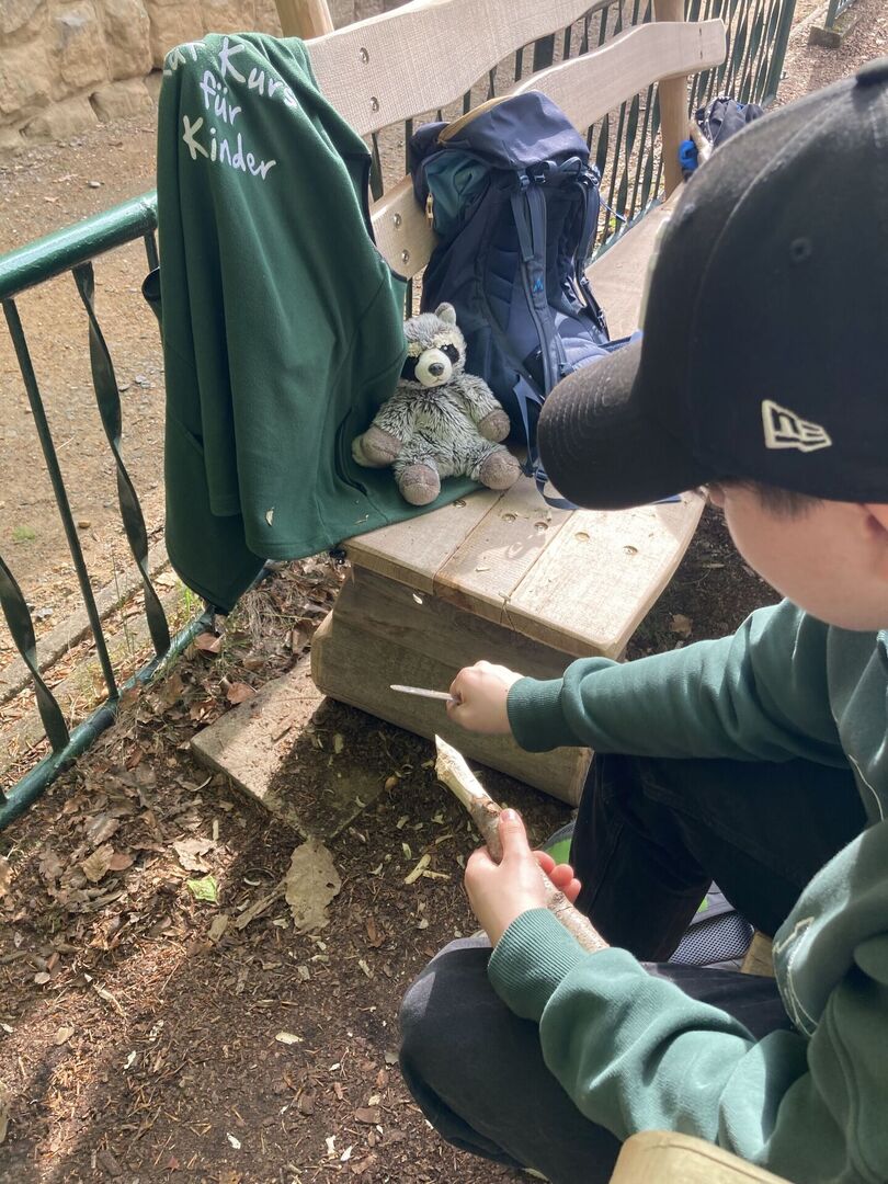 Am Abend, als die Sonne langsam unterging, wurde es richtig gemütlich: Gemeinsam mit den Kindern schnitzte der kleine Waschbär einen eigenen Stock für das Lagerfeuer. Mit viel Freude drehte er Stockbrot über den Flammen. Einige Abenteuerlustige erklommen noch einmal den Zirkelstein und wurden mit einem unvergesslichen Sonnenuntergang belohnt.