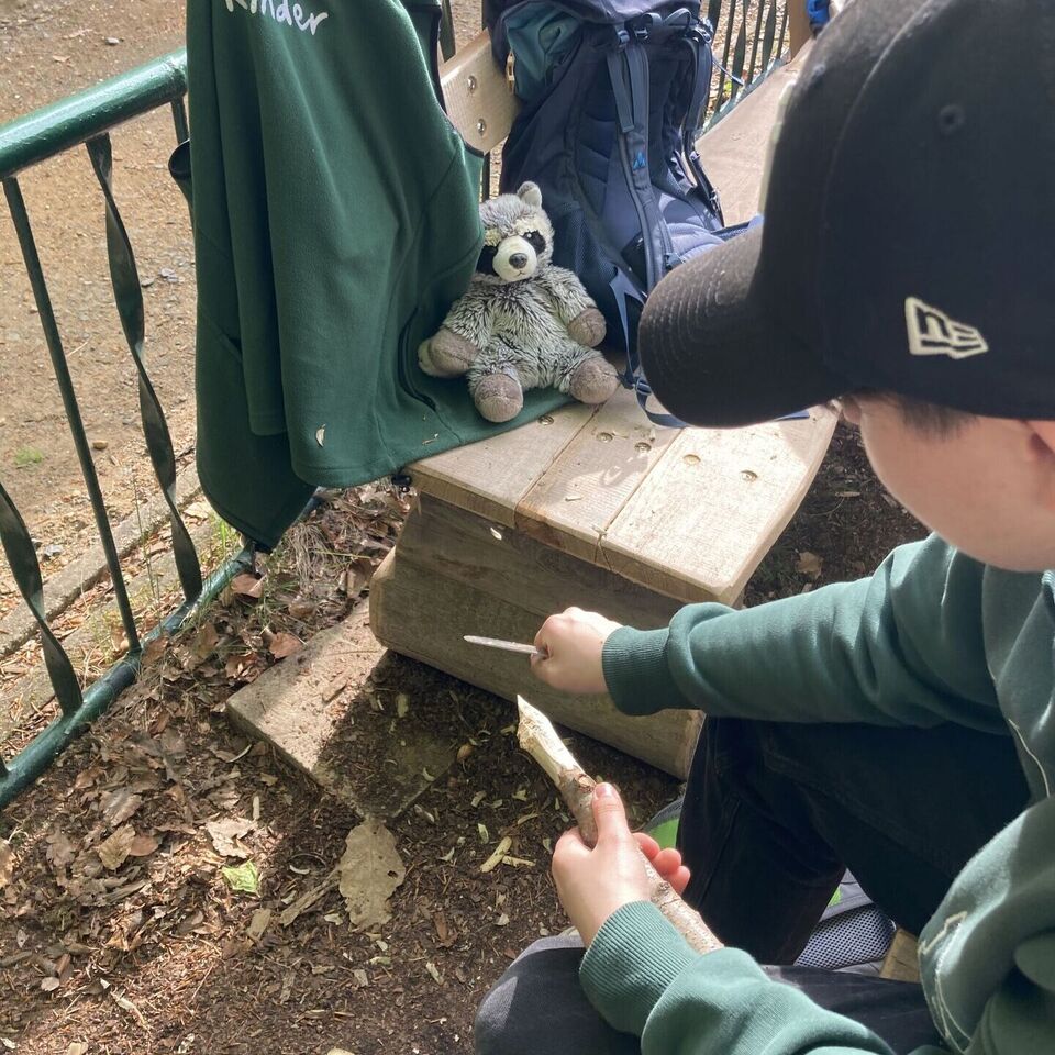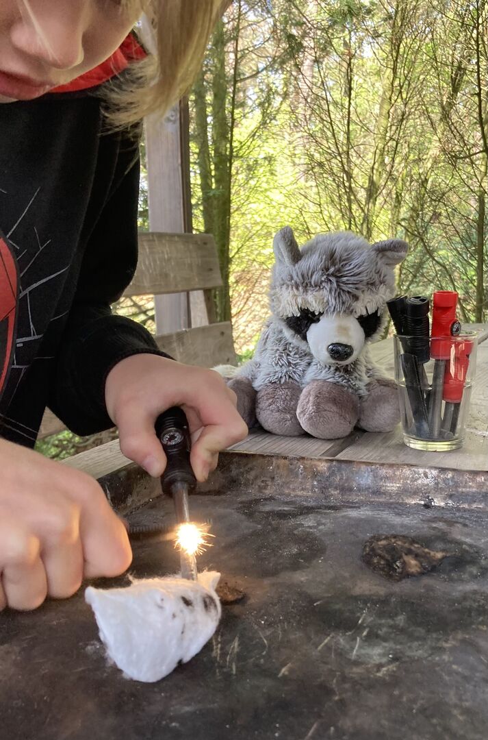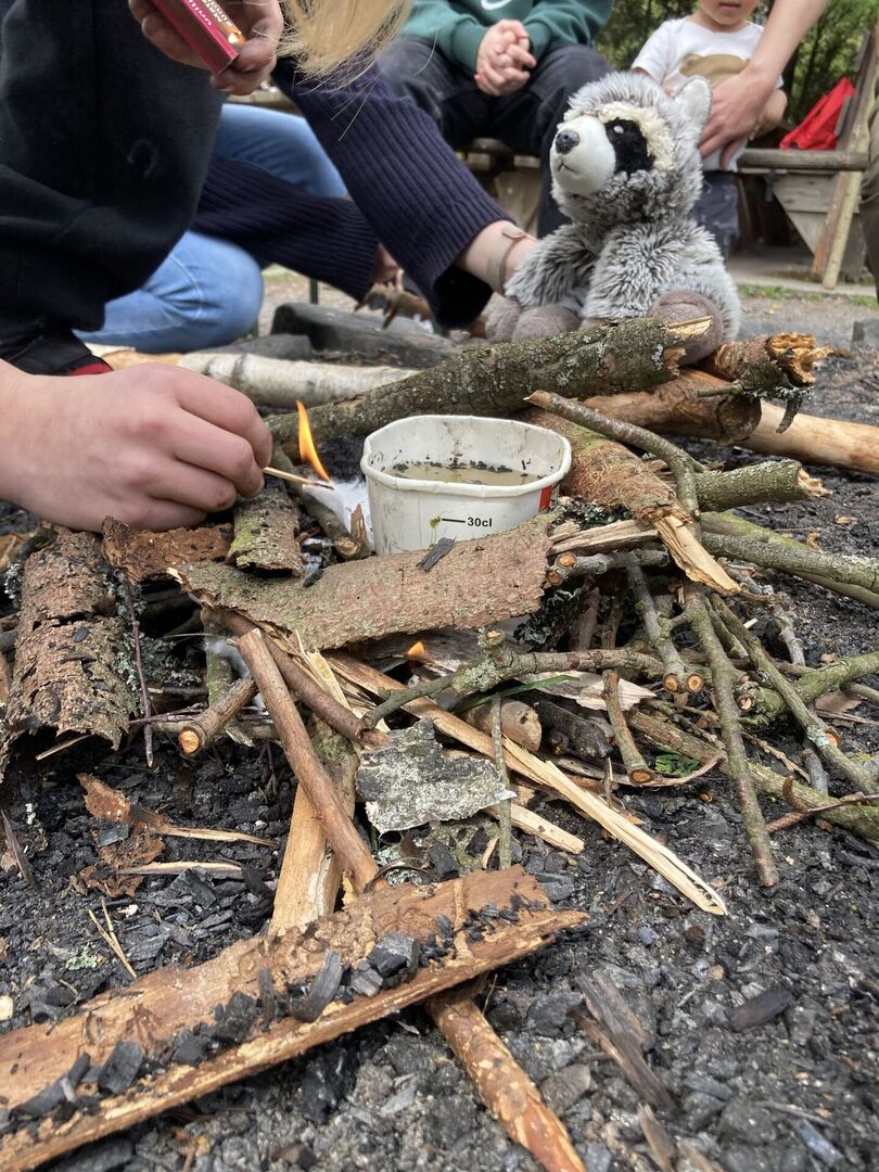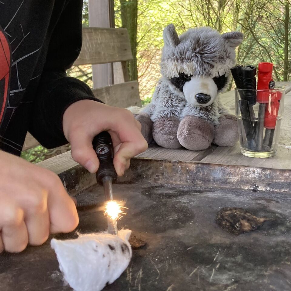 Am Mittwoch staunte der kleine Waschbär erneut: Heute ging es um das große Geheimnis des Feuermachens! Ganz gespannt beobachtete er, wie die Kinder versuchten, Funken aus Steinen zu schlagen. Anfangs wollte es nicht so recht klappen, aber mit einem Feuerstahl und Magnesium flogen plötzlich richtige Funken durch die Luft. Voller Begeisterung half der kleine Waschbär mit, das Feuer zum Lodern zu bringen – und beide Gruppen schafften es, einen Becher Wasser zum Kochen zu bringen!