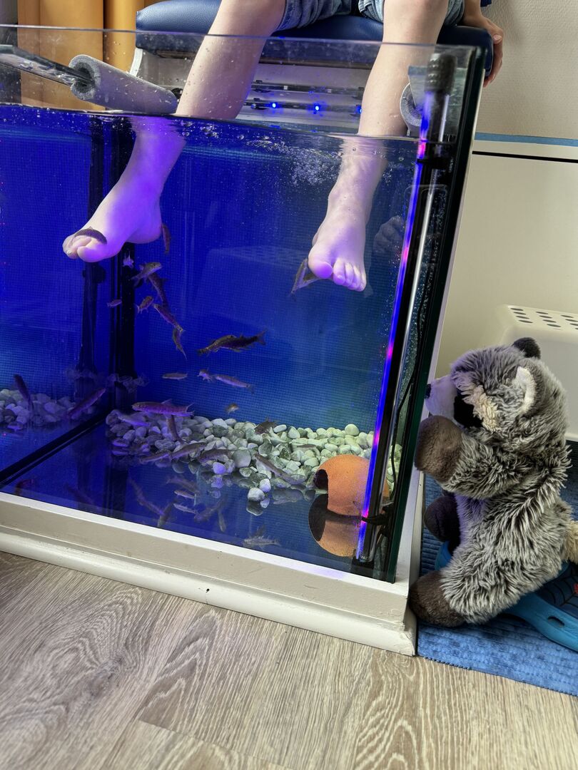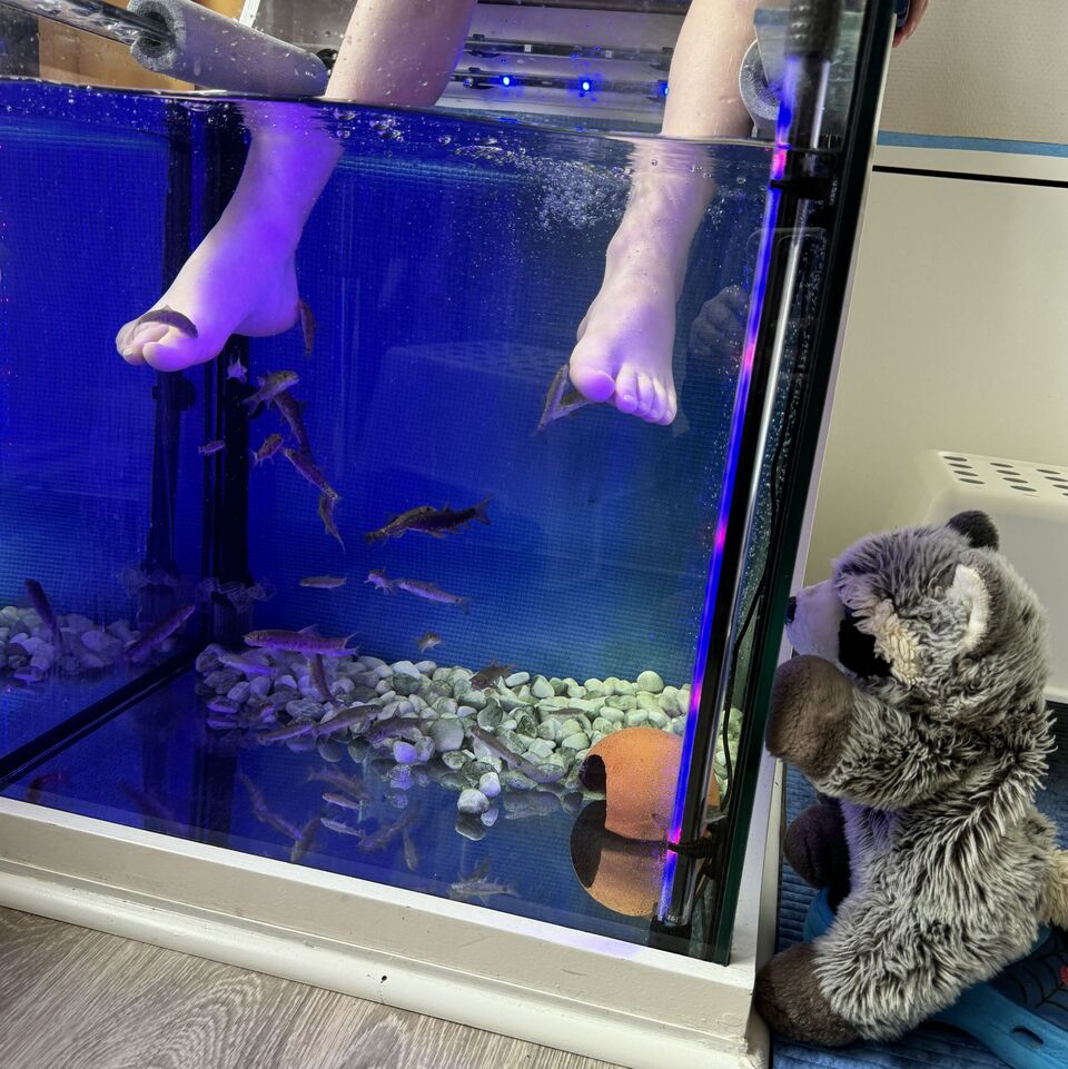 Sein Abenteuer ging am nächsten Tag gleich weiter, denn er kletterte im Kletterwald Schöneck hoch hinaus und lernte dabei auch fliegen. Zur Abschluss-Party mit insgesamt 200 Kinderarche-Kindern am Donnerstagabend schwang er das Tanzbein und legte eine flotte Sohle mit den jungen Menschen aufs Parkett. Nach einer sehr erlebnisreichen Woche ging es am letzten Tag zum Entspannen in das „Fish Spa“ des Hotels, und jeder genoss die 15 Minuten Wellness. Nur der Waschbär musste von außen zuschauen, weil er wegen seines Fells seine Füße nicht in das Wasser halten durfte…