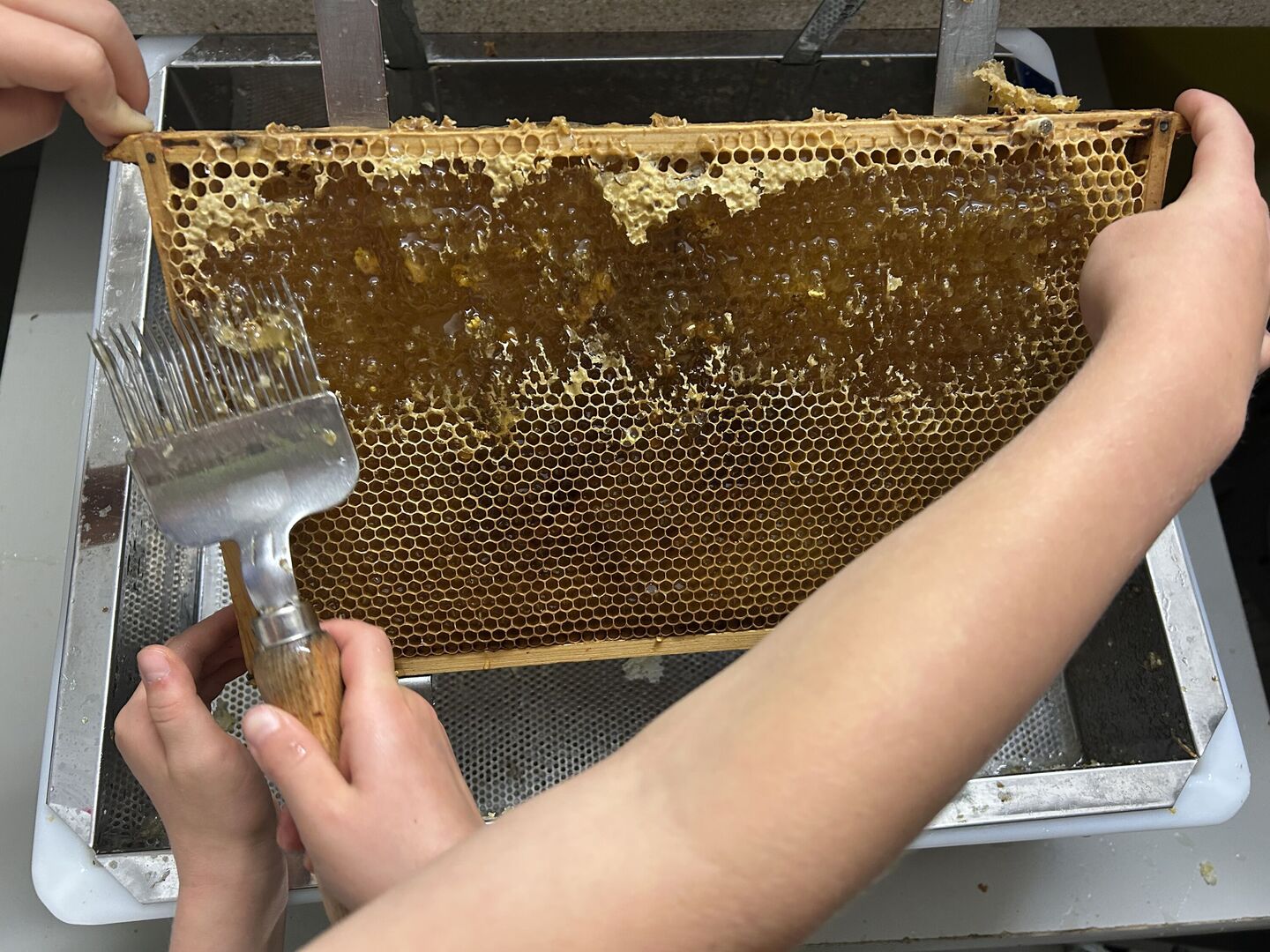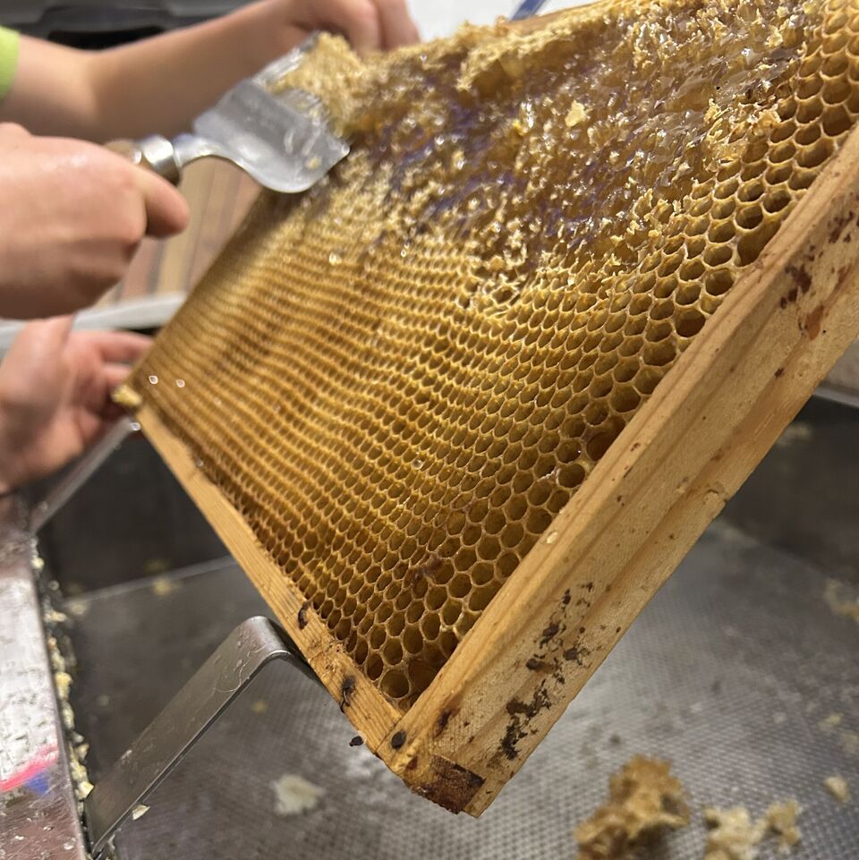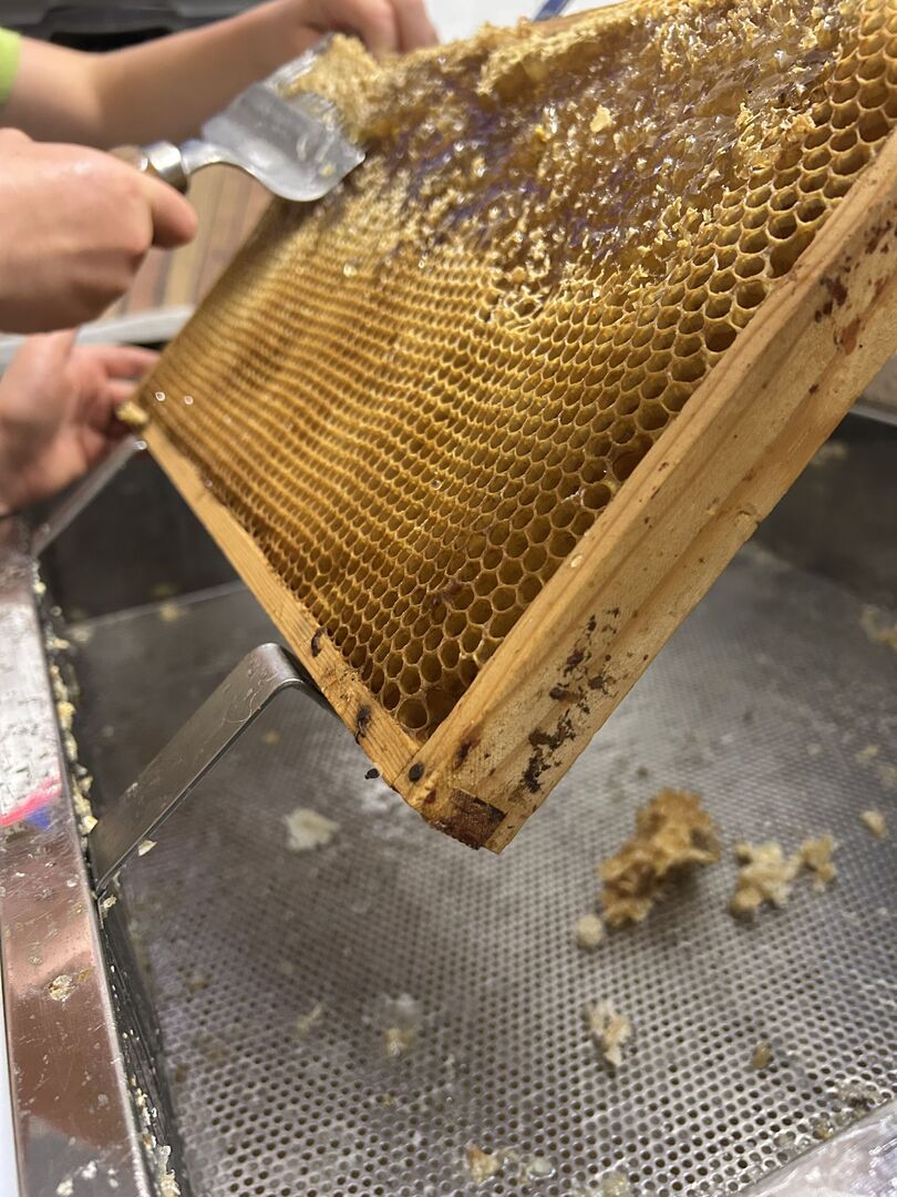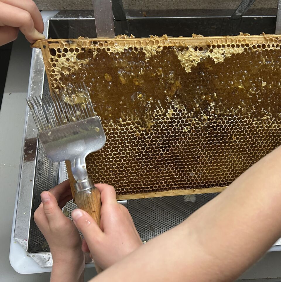 Zu Besuch bei der Imker-Familie Schmieder haben die Kinder die Waben zunächst „entdeckelt“, was ganz schön anstrengend und kräftezehrend war.