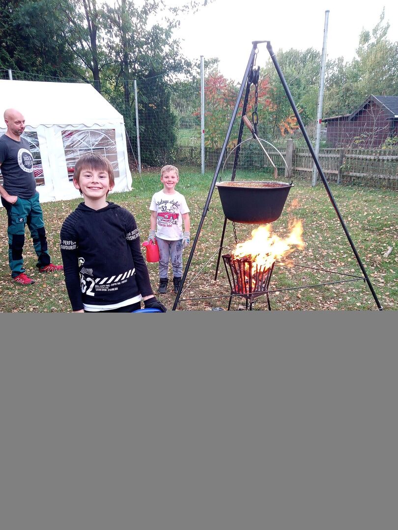 Zum krönenden Abschluss des Tages gab es auf Wunsch der Kinder ein besonderes Abendessen: Kesselgulasch. Und der hatte es in sich. Hier wurden kleine Feuerwehrmänner benötigt, welche dafür sorgten, dass das Feuer sich nicht ausbreitete. Wenn schon Kesselgulasch, dann auch richtig über offenem Feuer.