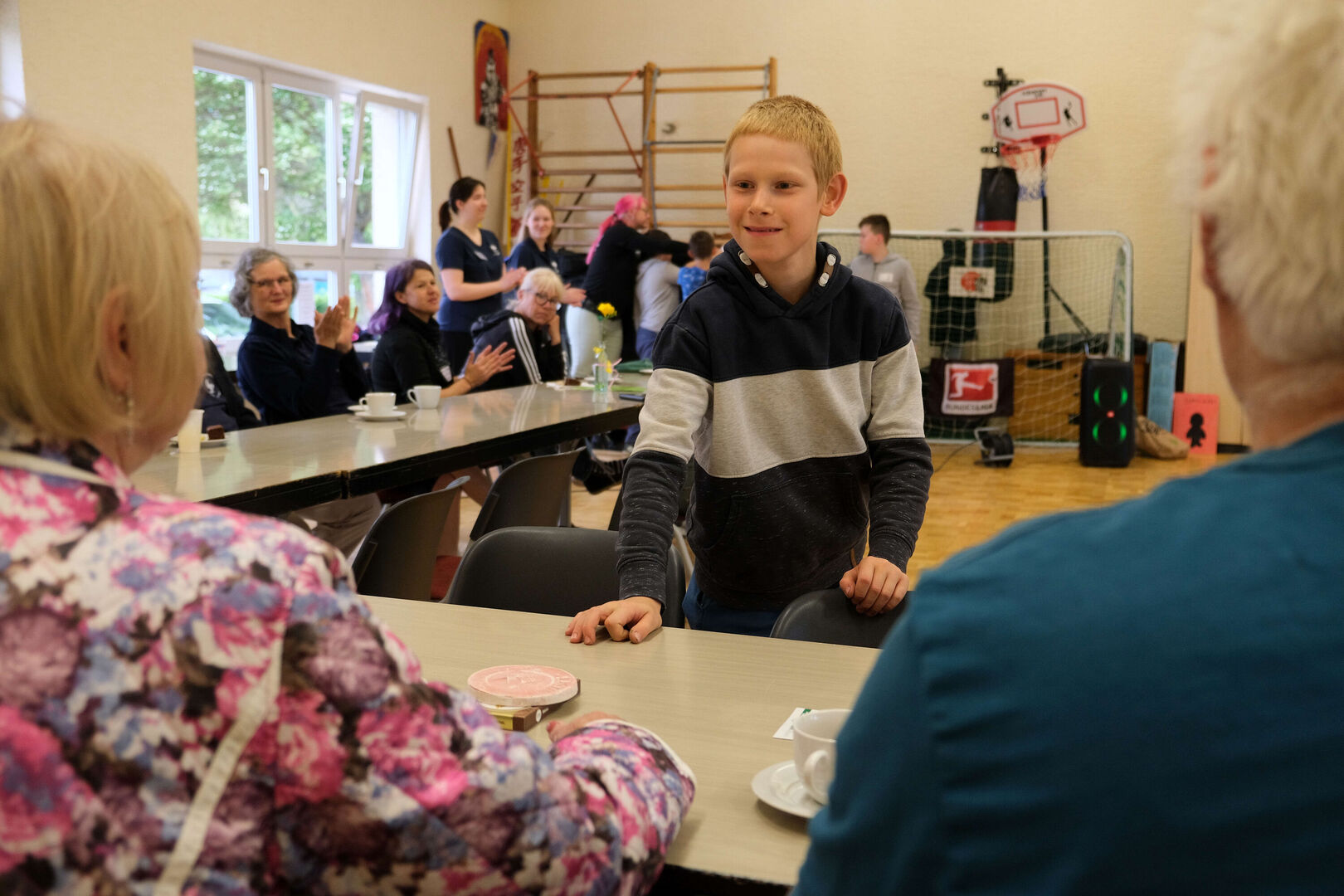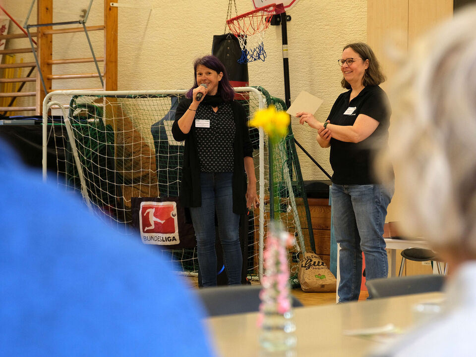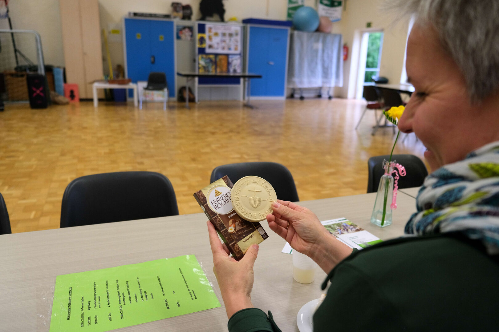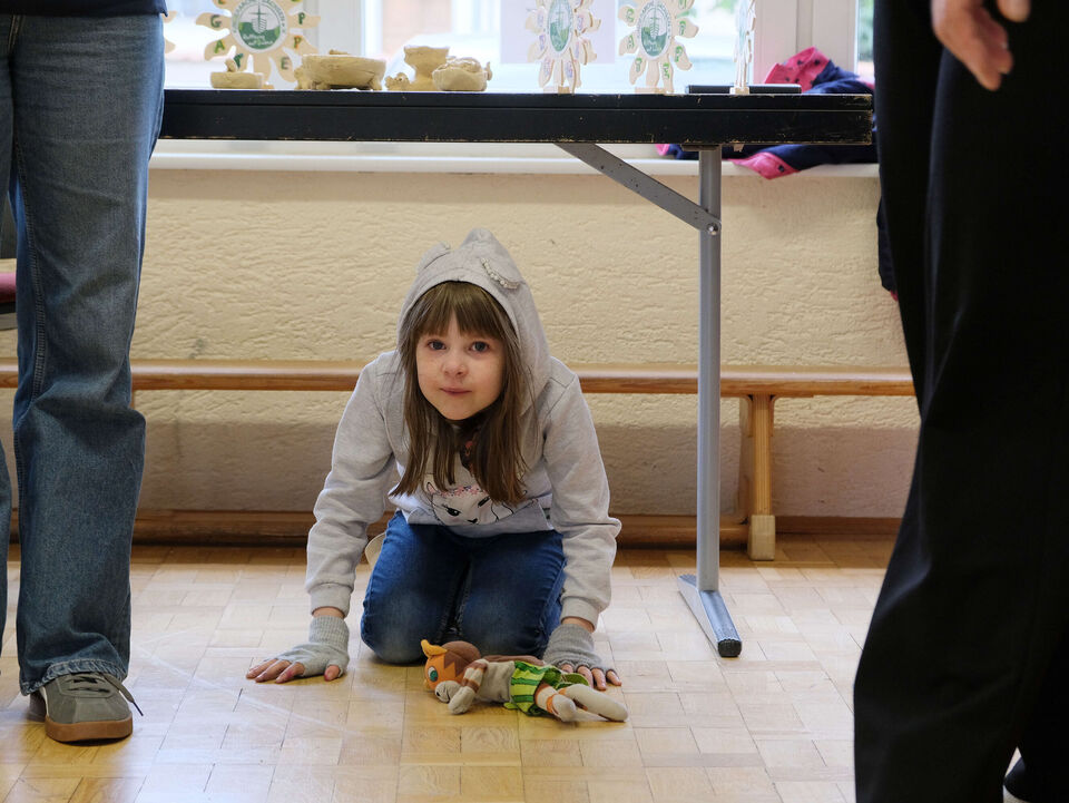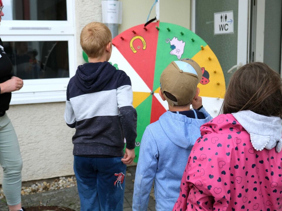 Das ist doch nicht zu fassen! Den ganzen Tag schien in Großdalzig die Sonne und kurz bevor die Gäste zum Frühlingsfest kommen, ziehen dunkle Wolken über den Hof unserer Tagesgruppe. Als es dann tatsächlich anfängt zu regnen, fassen kurzerhand alle mit an: Kinder, Mitarbeitenden und Gäste räumen in Windeseile alle Tische und Stühle, Geschirr, Kekse und Kuchen, Kaffee und andere Getränke in die große Turnhalle. Viele Papierhandtücher sind nötig, um alles abzuwischen, aber mit nur wenigen Minuten Verspätung kann Einrichtungsleiterin Alexandra Schwander die Gäste im Trockenen begrüßen.