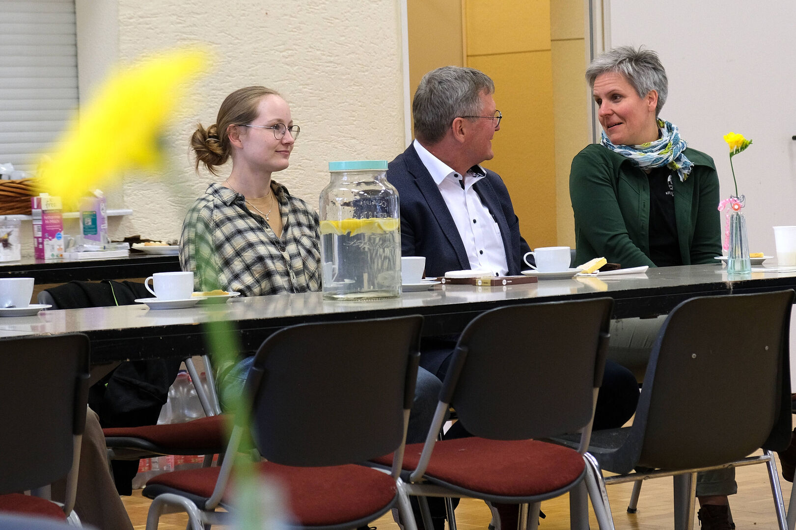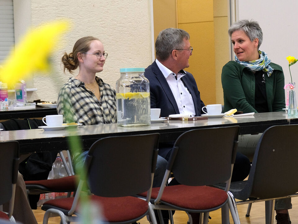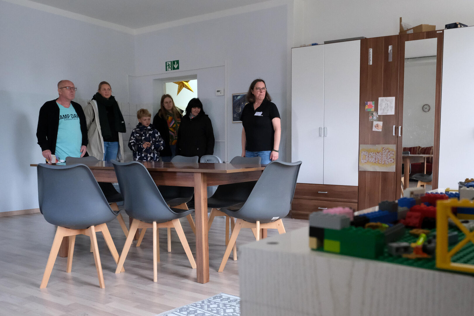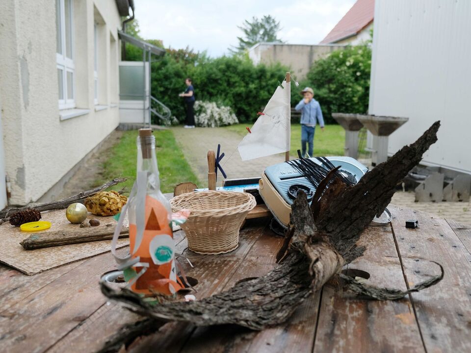 Das ist doch nicht zu fassen! Den ganzen Tag schien in Großdalzig die Sonne und kurz bevor die Gäste zum Frühlingsfest kommen, ziehen dunkle Wolken über den Hof unserer Tagesgruppe. Als es dann tatsächlich anfängt zu regnen, fassen kurzerhand alle mit an: Kinder, Mitarbeitenden und Gäste räumen in Windeseile alle Tische und Stühle, Geschirr, Kekse und Kuchen, Kaffee und andere Getränke in die große Turnhalle. Viele Papierhandtücher sind nötig, um alles abzuwischen, aber mit nur wenigen Minuten Verspätung kann Einrichtungsleiterin Alexandra Schwander die Gäste im Trockenen begrüßen.