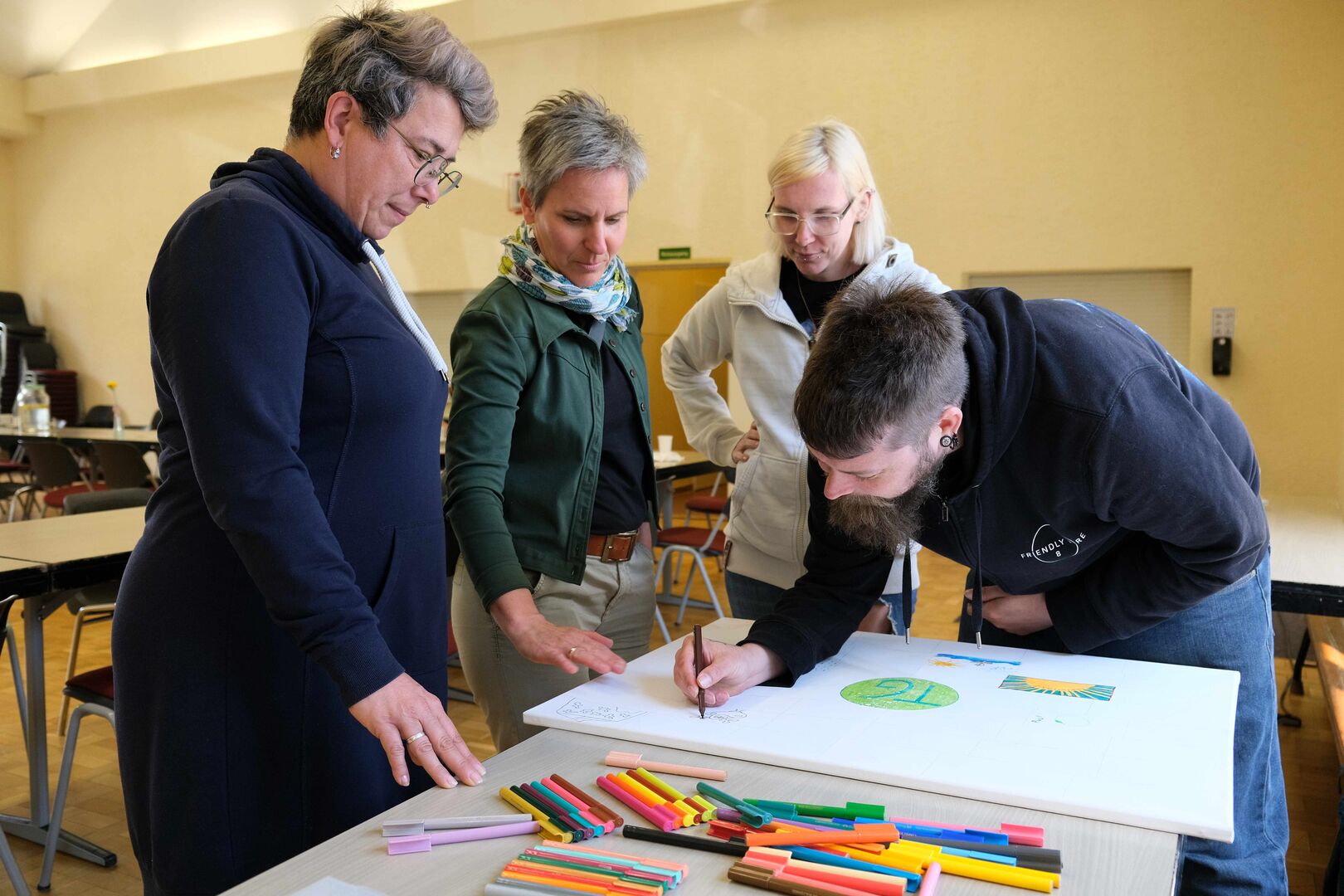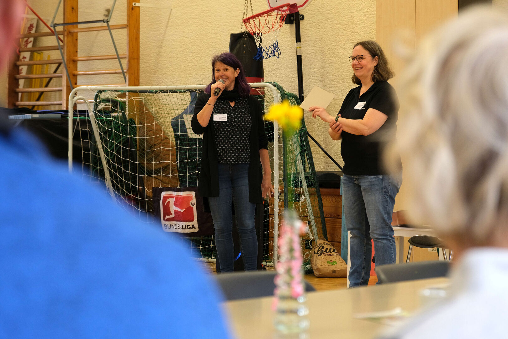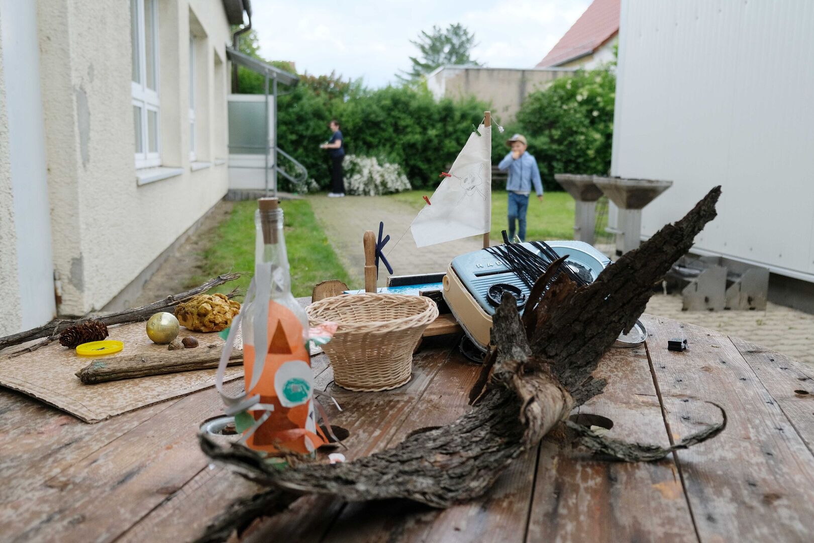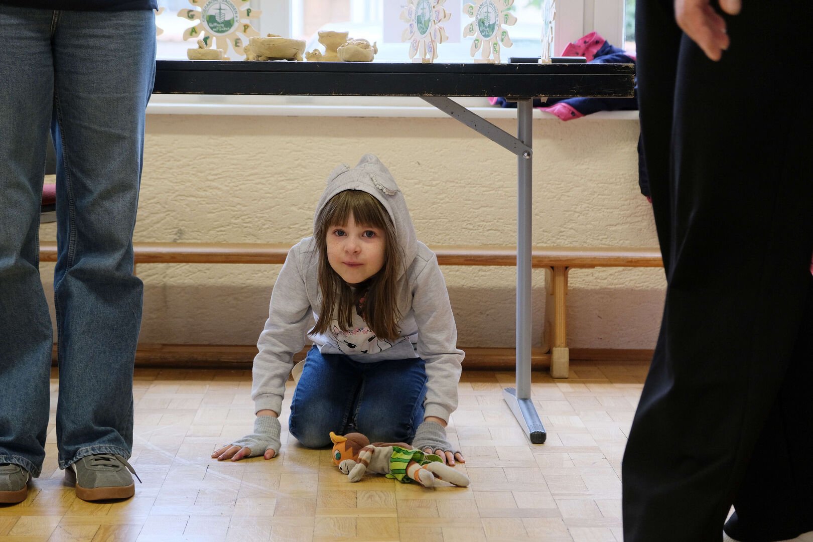 Das ist doch nicht zu fassen! Den ganzen Tag schien in Großdalzig die Sonne und kurz bevor die Gäste zum Frühlingsfest kommen, ziehen dunkle Wolken über den Hof unserer Tagesgruppe. Als es dann tatsächlich anfängt zu regnen, fassen kurzerhand alle mit an: Kinder, Mitarbeitenden und Gäste räumen in Windeseile alle Tische und Stühle, Geschirr, Kekse und Kuchen, Kaffee und andere Getränke in die große Turnhalle. Viele Papierhandtücher sind nötig, um alles abzuwischen, aber mit nur wenigen Minuten Verspätung kann Einrichtungsleiterin Alexandra Schwander die Gäste im Trockenen begrüßen.