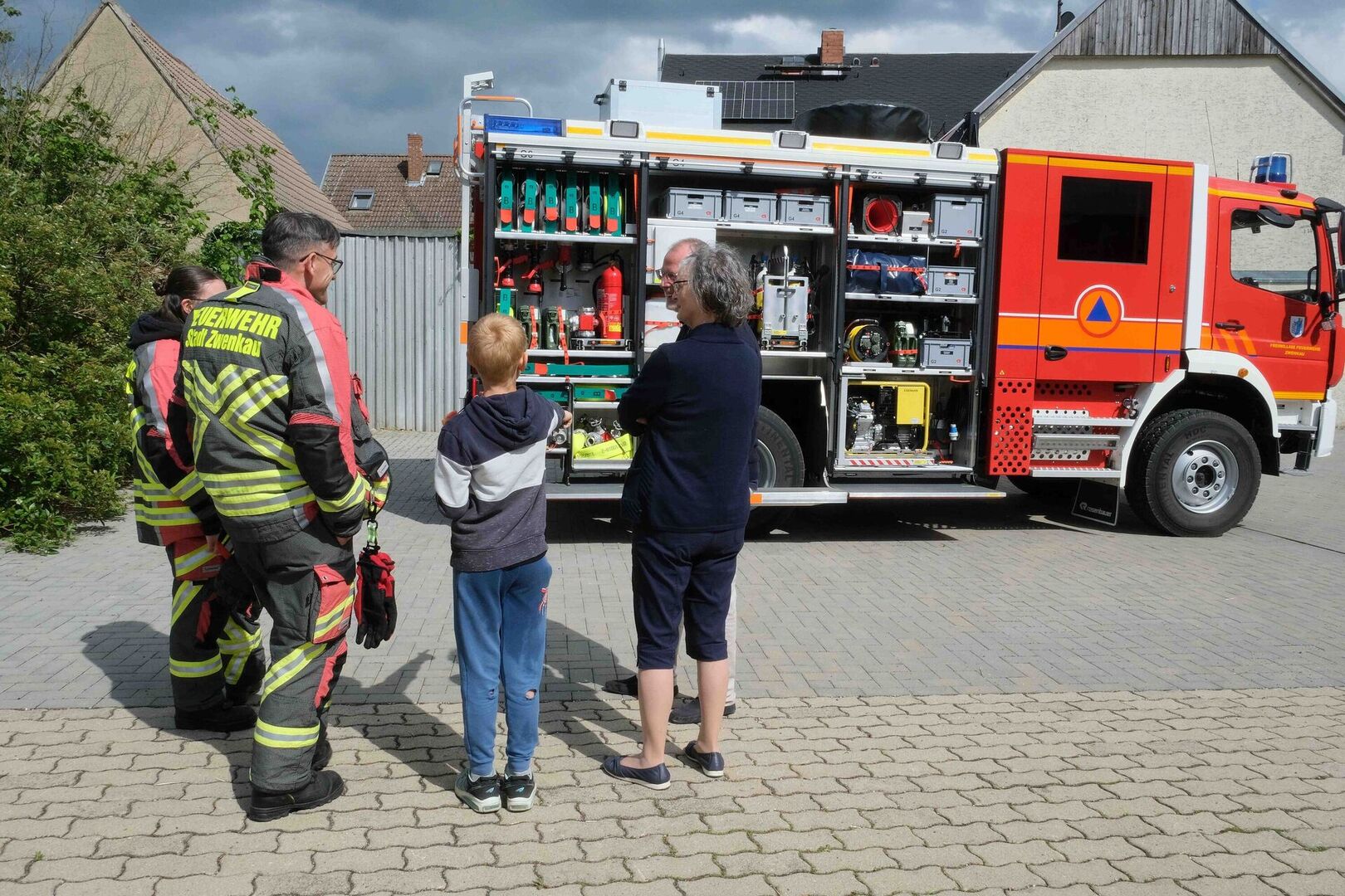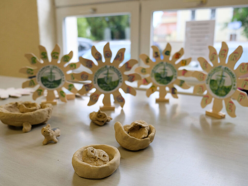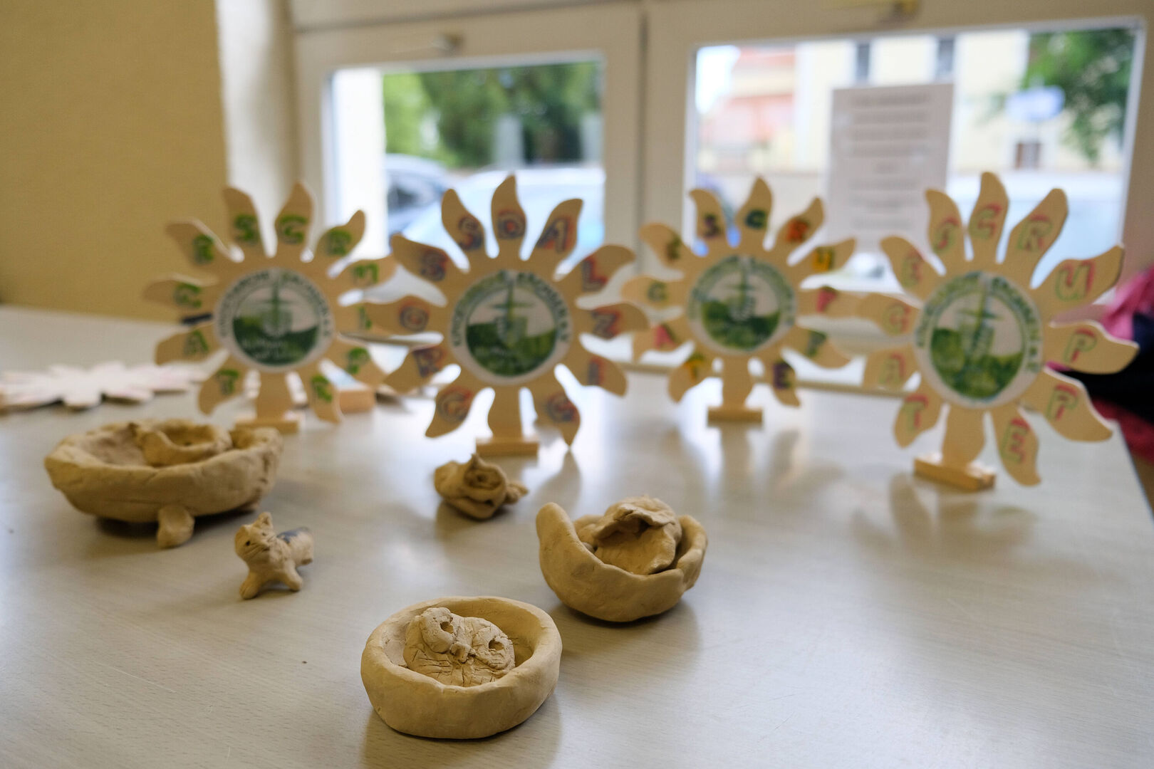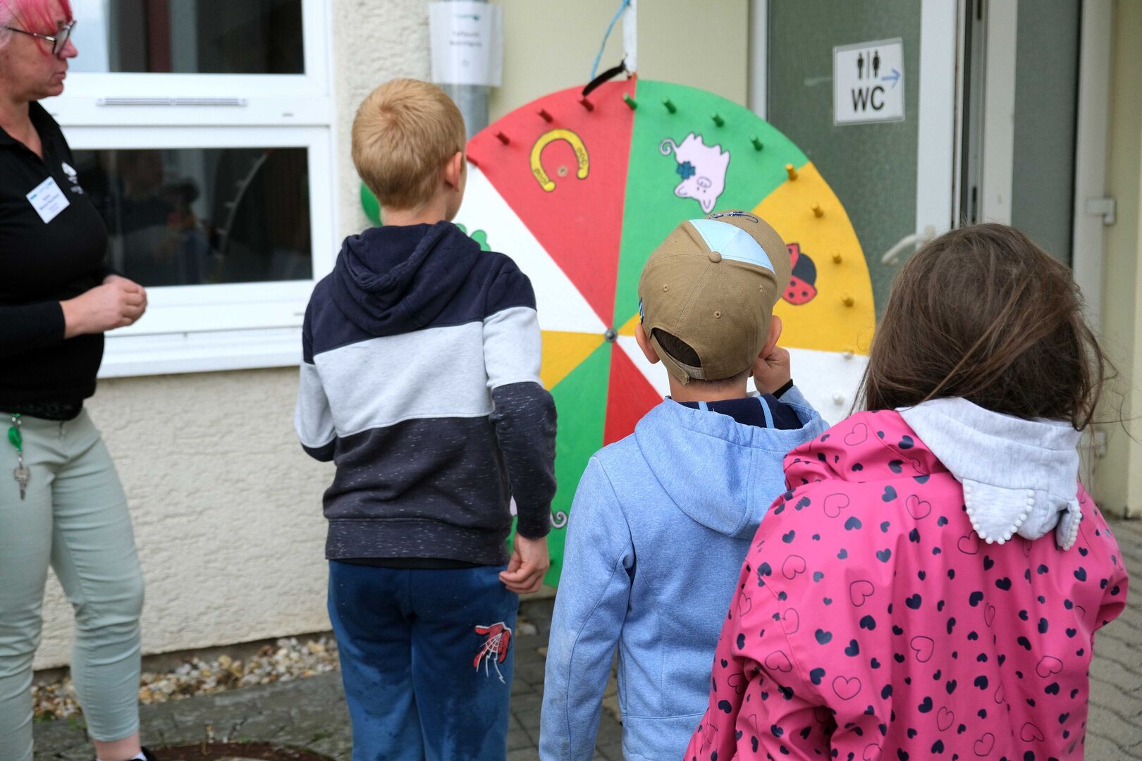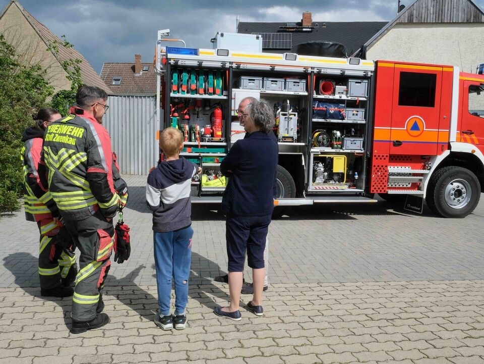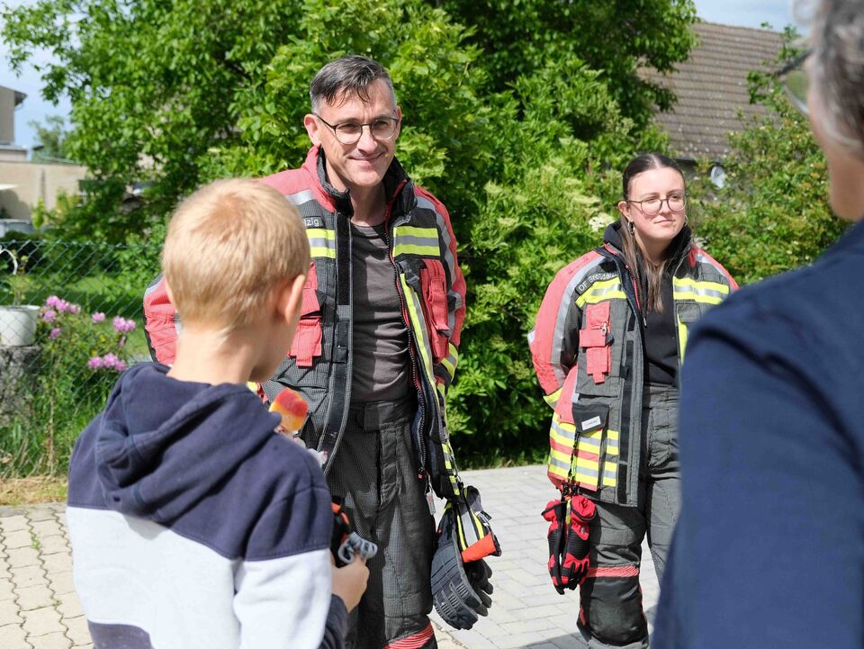 Die fünf Kinder der Tagesgruppe hatten ein musikalisches Programm vorbereitet und begeisterten als Katze, Igel und Hase und mit ihren fröhlichen Liedern. Danach war der gesellige Teil des Nachmittags eröffnet. Inzwischen hatte der Regen aufgehört, so dass sich alle am Glücksrad im Hof ausprobieren, die große Feuerwehr von außen und innen (natürlich mit einer Runde durch den Ort) bestaunen, die Ausstellung der Kunsttherapeutin anschauen und selbst einen kreativen Beitrag hinterlassen konnten.