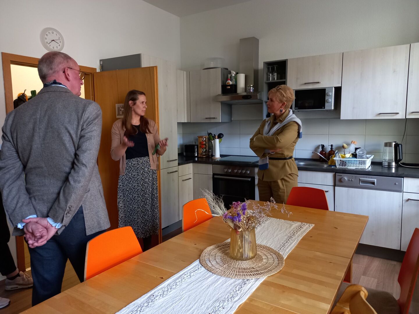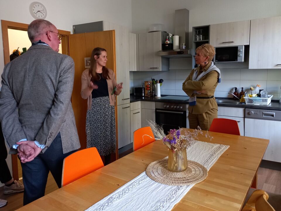 Bei Kaffee und Kuchen sprachen wir zunächst über vergangene und geplante Projekte mit den Familien, für die wir Spenden verwenden. Mit strahlenden Augen nahm das Paar auch die Dankeskarte einer Familie entgegen. Dies alles hautnah zu erleben, sei ein ganz besonderes Gefühl, so Frau von Wrangel. Beim Rundgang durch die zwei IFB-Wohnungen stellten Frau und Herr von Wrangel viele Fragen. Sie waren neugierig zu hören, was genau die Arbeit mit den Familien bedeutet, welche Herausforderungen und Stolpersteine es zu bewältigen gibt und woran sich Erfolge feststellen lassen. Beeindruckt verließen sie uns nach zweieinhalb Stunden.