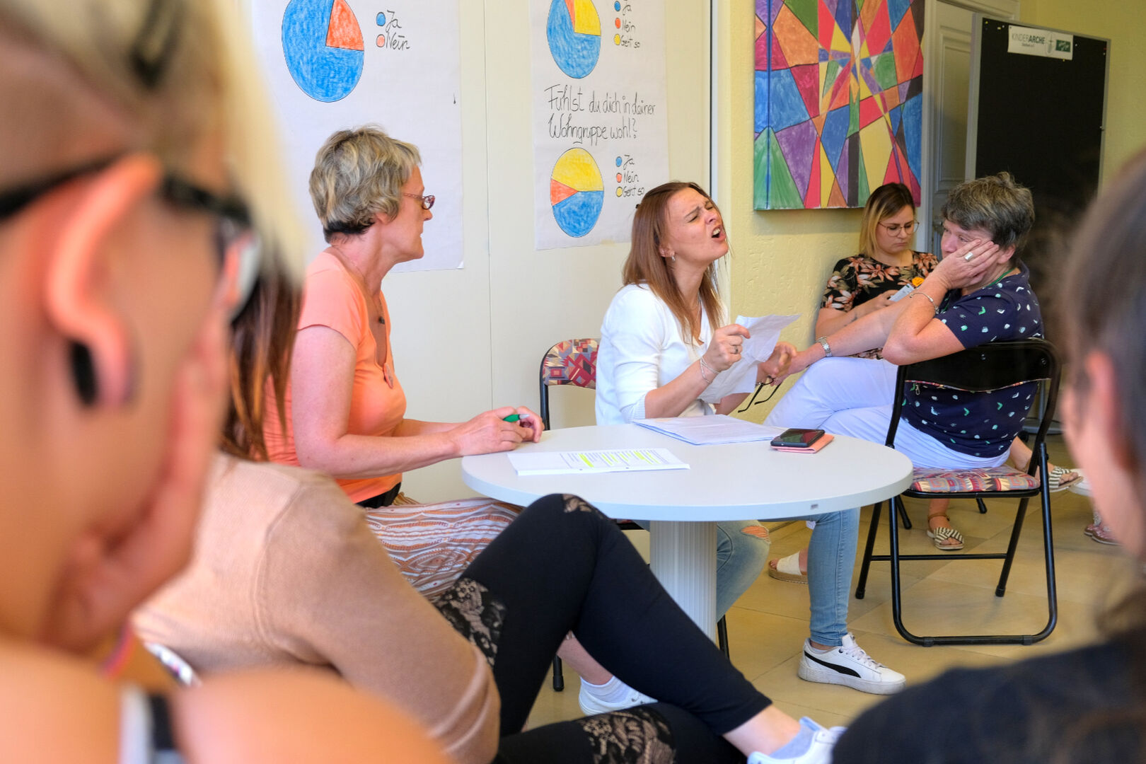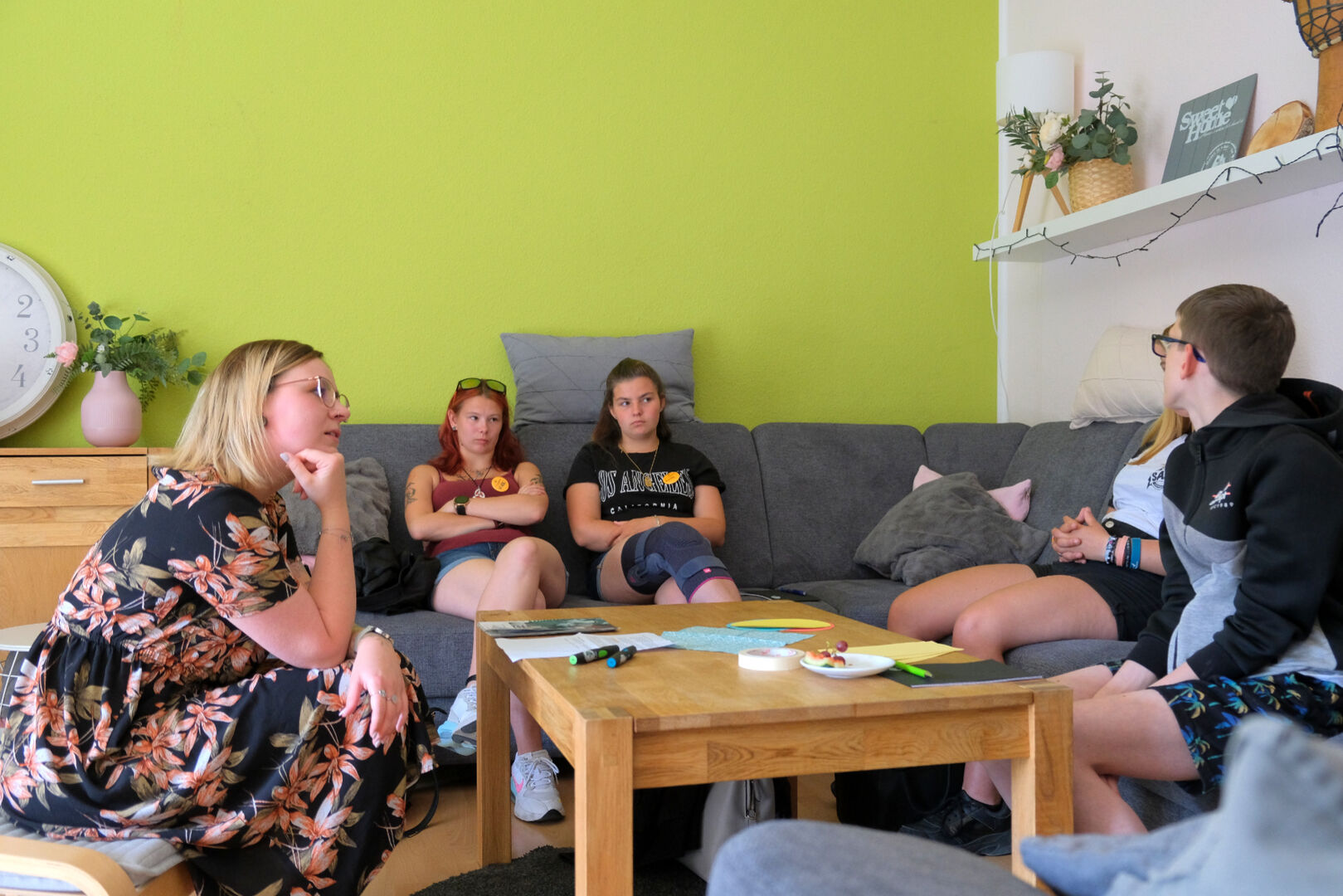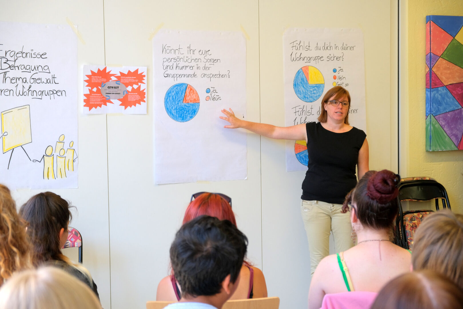 Wie Fachbereichsleiterin Susan Gebhardt erklärte, hatte die Befragung aller Kinder und Jugendlichen in unseren Wohngruppen vom November 2022 unter anderem gezeigt, dass die Gruppenrunde als wichtige Chance zum Reden und Schlichten von Konflikten gesehen wird. Da die Ausgestaltung in den Gruppen jedoch sehr verschieden gehandhabt wird, waren die Gruppensprecher dann gefragt, sich in kleineren Arbeitsgruppen auszutauschen. Fragen waren dabei zum Beispiel: Wie läuft die Gruppenrunde bei euch und welche Ideen und Wünsche habt ihr, damit Gruppenrunden gut gelingen?