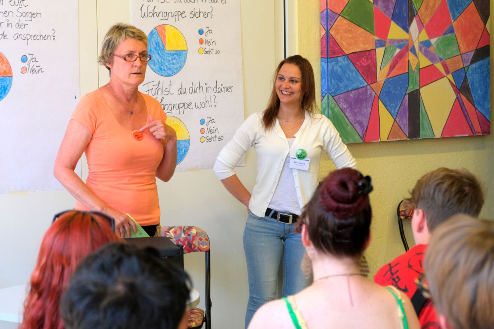 Zum Auftakt im Steinsaal gab es gleich was zu staunen. Vor den Augen der Kinder und Jugendlichen entfaltete sich eine Gruppenrunde, wie sie schlechter kaum vorstellbar ist. Übel gelaunte, unvorbereitete und unmotivierte „Jugendliche“ quälten sich durch die obligatorische Gruppenrunde und wollten, dass es möglichst schnell wieder aufhört. „Wer von euch hat so eine Gruppenrunde schon mal erlebt?“, fragte Uta Troike nach diesem Rollenspiel. Viele Hände gingen nach oben. „Das wollen wir gern verbessern“, erklärte Uta Troike, „und deshalb ist das Thema heute: die Gruppenrunde.“