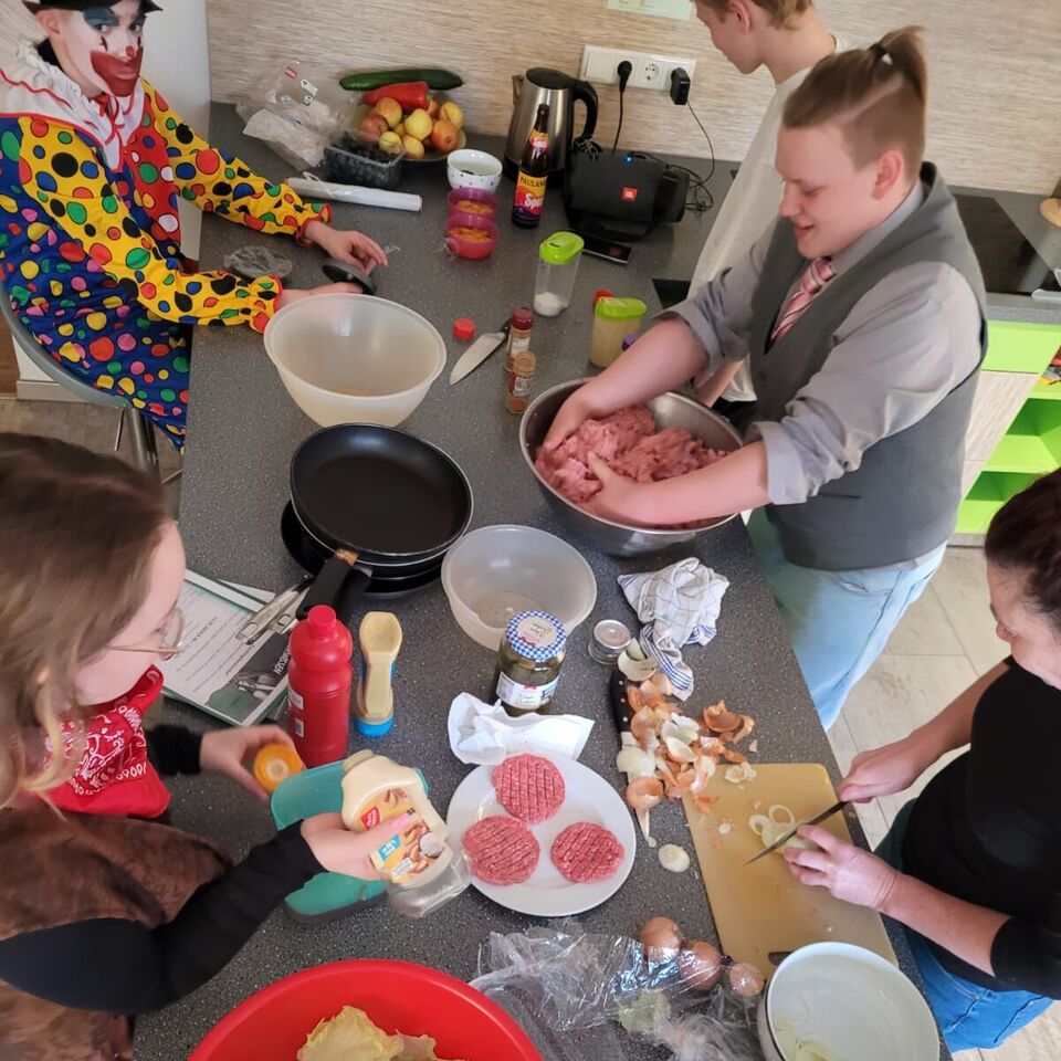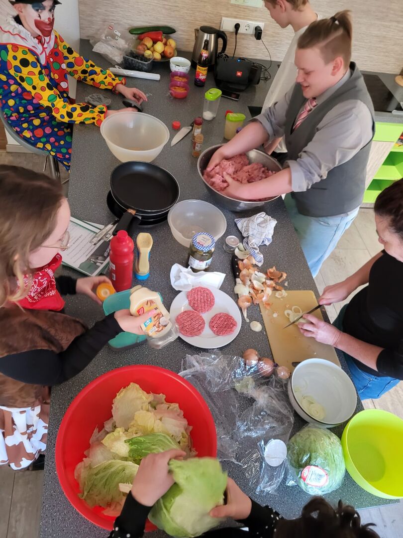 Am Faschingsdienstag war Annett Roßmann vorerst das letzte Mal bei uns in Wuischke. Aber sie nahm sich noch einmal einen ganzen Tag Zeit, um mit den Kindern, Jugendlichen, jungen Müttern und Vätern in verschiedenen Workshops Leckeres zuzubereiten. Zur Auswahl standen Zubereiten und Backen von Pfannkuchen und Quarkbällchen, Herstellung verschiedener Cocktails und die Vorbereitung für Burger mit „Schnibbeln“ und Braten.