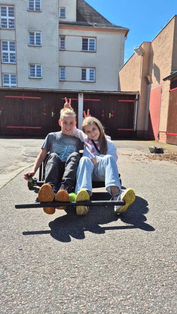 Nach der Siegerehrung und der „Plünderung“ unserer Preisetheke, bei der sich so mancher nur schwer entscheiden konnte, gab es noch eine ganz besondere Überraschung: Verdeckten bis jetzt große Tücher geheimnisvoll einige sperrige Gegenstände auf unserer Bühne, so kamen nun drei außergewöhnliche Fahrzeuge darunter zum Vorschein. Zwei Einsitzer und ein Doppelsitzer sorgten für begeisterte Rufe der Kinder. Diese besonderen Gefährte konnten wir von Spendengeldern, die wir zur Weihnachtszeit bekamen, anschaffen.