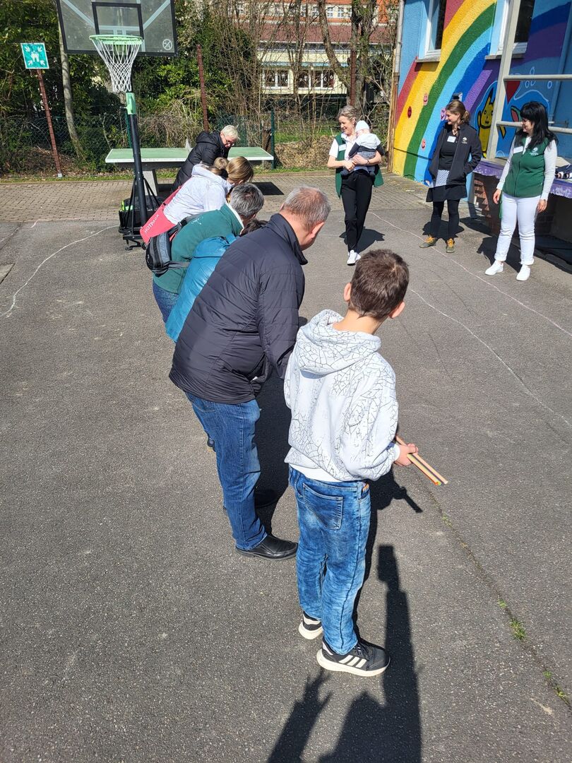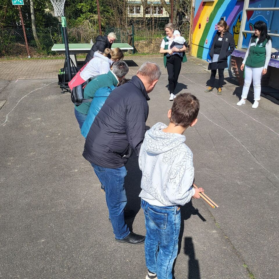 Nach dem gemeinsamen Kaffeetrinken mischten sich die Gäste mit den Gastgebern und bildeten fünf bunt zusammengewürfelte Gruppen. An verschiedenen Stationen konnten sie ihre Geschicklichkeit, ihr Wissen oder ihre Sportlichkeit unter Beweis stellen: hochmotiviert, die meisten Punkte zu sammeln.