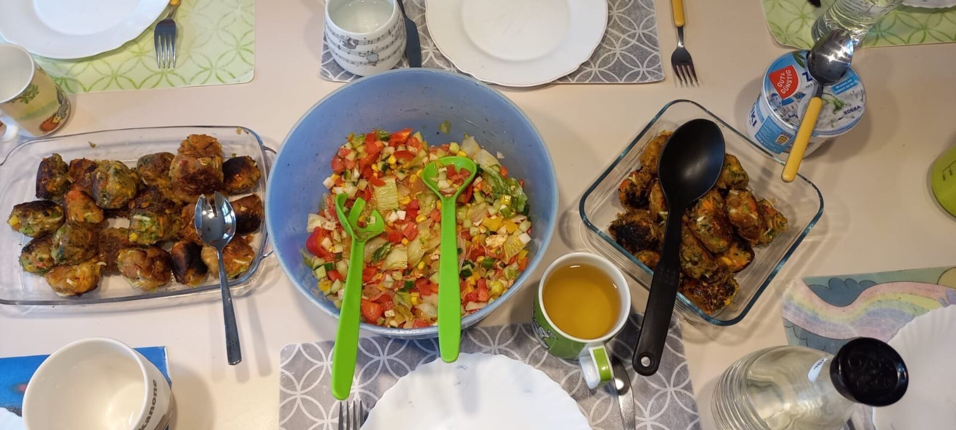 Jedes Treffen startet mit einem theoretischen Teil, bei dem die Kinder und Jugendlichen ihr Wissen unter Beweis stellten und noch das eine oder andere Neue lernten. Am 27. September ging es um das Thema Lebensmittelverschwendung. Nach dem Theorieteil ging es in die Küche, wo die Kinder bald ablaufende Lebensmittel zusammensuchten und mit Unterstützung von Frau Rossmann leckere Brotbällchen herstellten. Somit war das schon etwas harte Brot in ein neues Gericht verwandelt und schmeckte allen mit Salat und Joghurtsoße ganz wunderbar.
