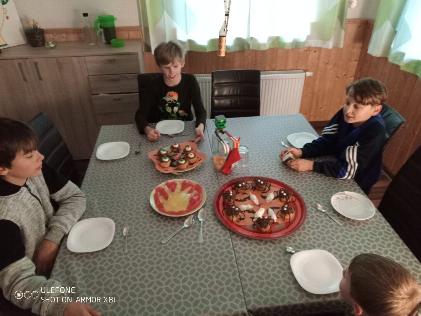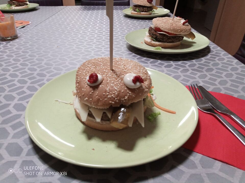 In der Wohngruppe Niederbobritzsch haben wir heute das Thema Halloween kulinarisch umgesetzt. Der Tag begann ganz eklig mit verschimmelten Brot. Das Mittagessen stand unter dem Motto „Schleimig oder schlotzig“ – das ist hier die Frage. Gereicht wurden Nudel-Würstchen, Spinnen und Augäpfel in Eiter. Zum Vesper gab es dann Krabbeltiere und eine Gruselhand in einer Blutlache. Den kulinarischen Abschluss bildete am Abend der Grusel-Burger.