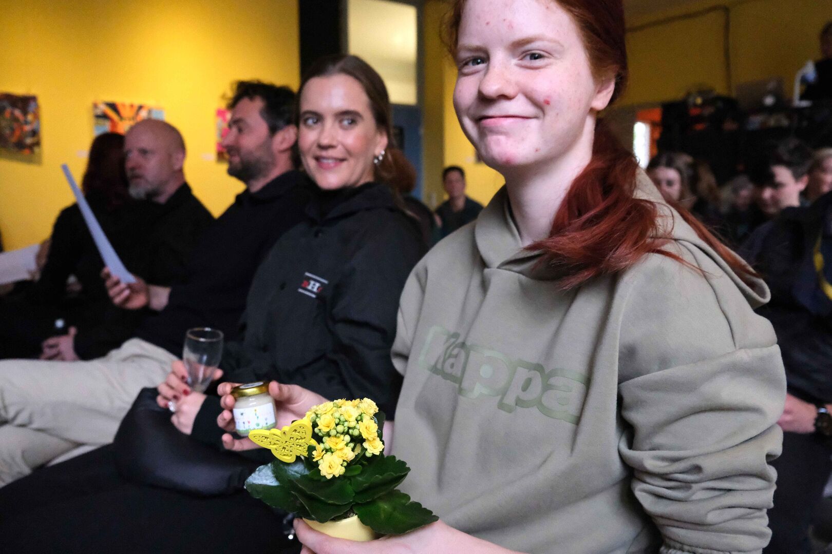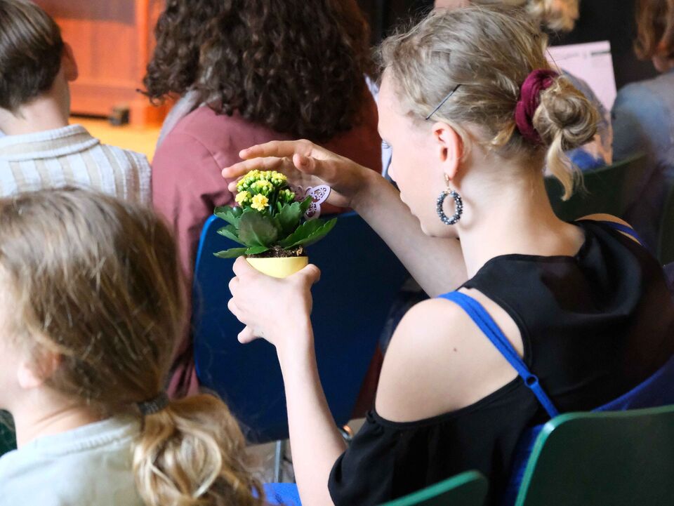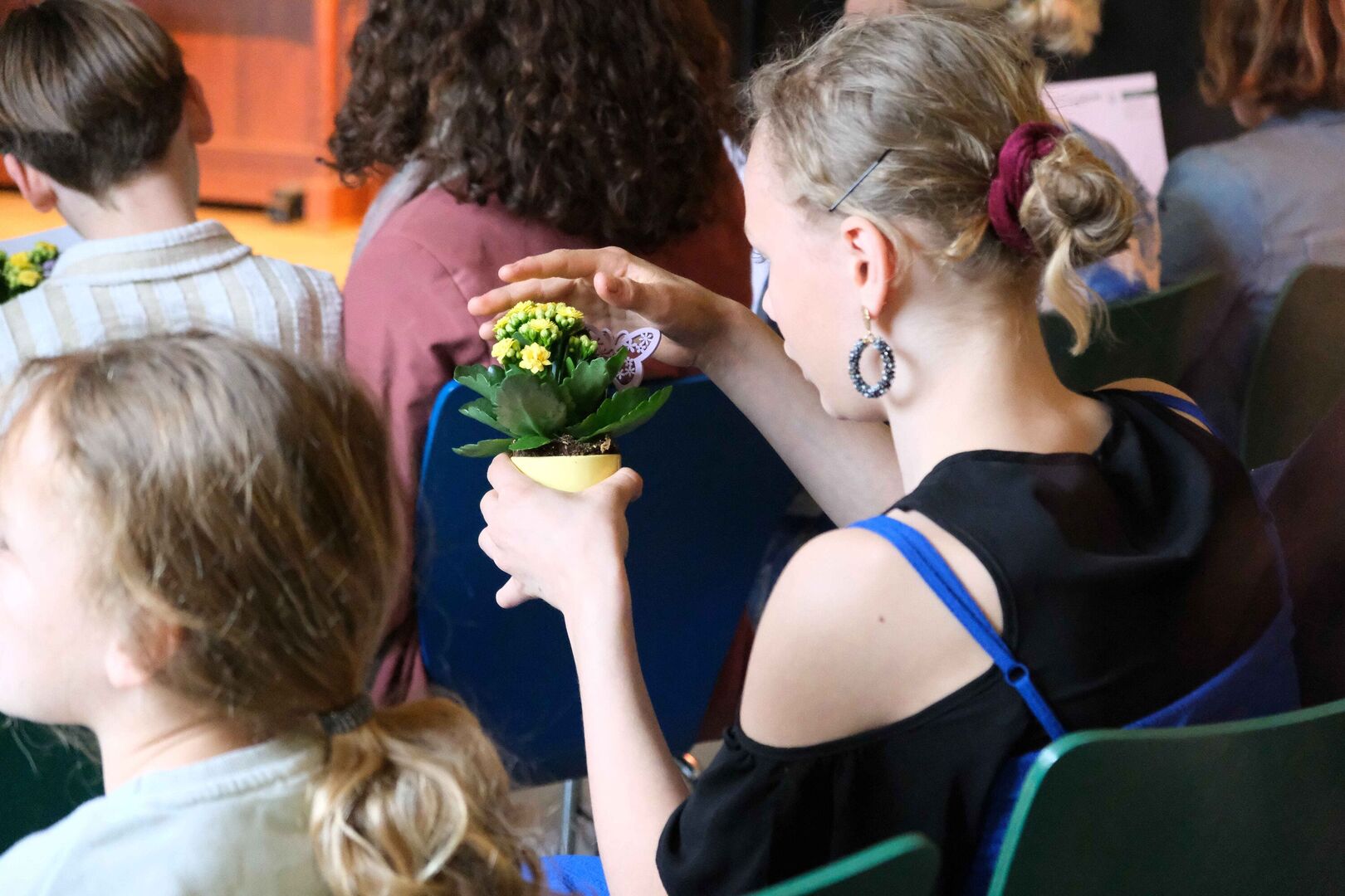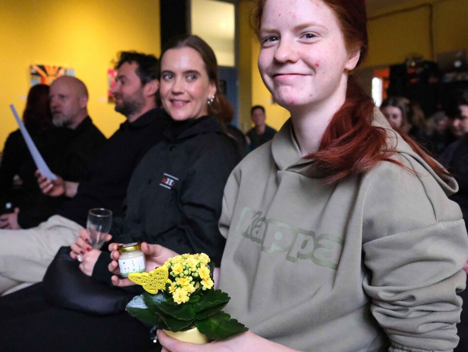 Zum Dank gab es von Vorständin Barbara Gärtner und dem stellvertretenden Einrichtungsleiter Julius Tasch für alle Kinder ein Gläschen Honig und ein Blümchen sowie nach der erfolgreichen Vernissage Pizza satt für alle!