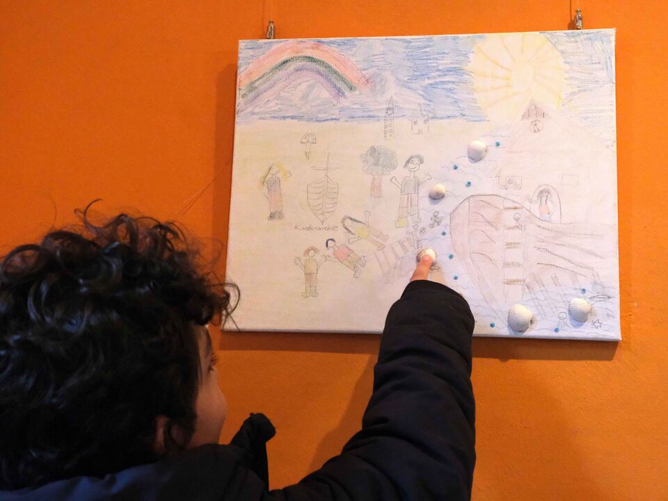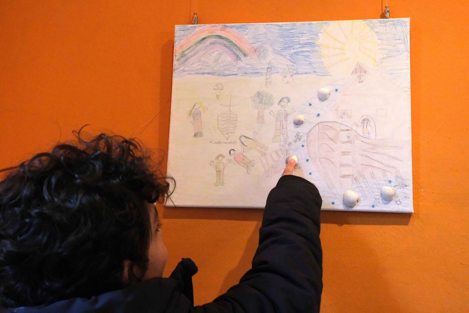 Ein paar Bilder weiter ist eine Arche zu sehen, die James gemalt hat. Er ist besonders stolz auf die aufgeklebten Muscheln und die blauen Glitzersteine, aber auch auf die Menschen, die sich an den Händen halten, den bunten Regenbogen und die große Sonne, die über allem strahlt. Das Boot des jüngsten Künstlers Ibrahim ist im Dialog mit der Kunsttherapeutin entstanden, die jedoch nur ein paar Pinselstriche setzen musste, ehe der Junge selbst „in Fahrt“ kam und sein Boot sowie alle diejenigen gemalt hat, die mit in sein Boot kommen müssen, weil sie wichtig für ihn sind.