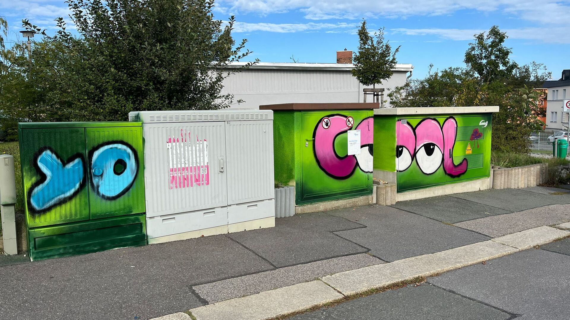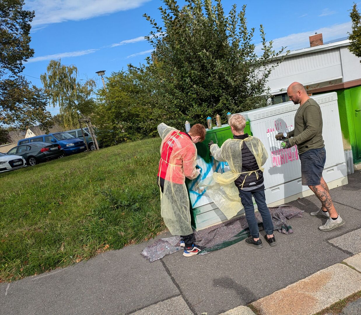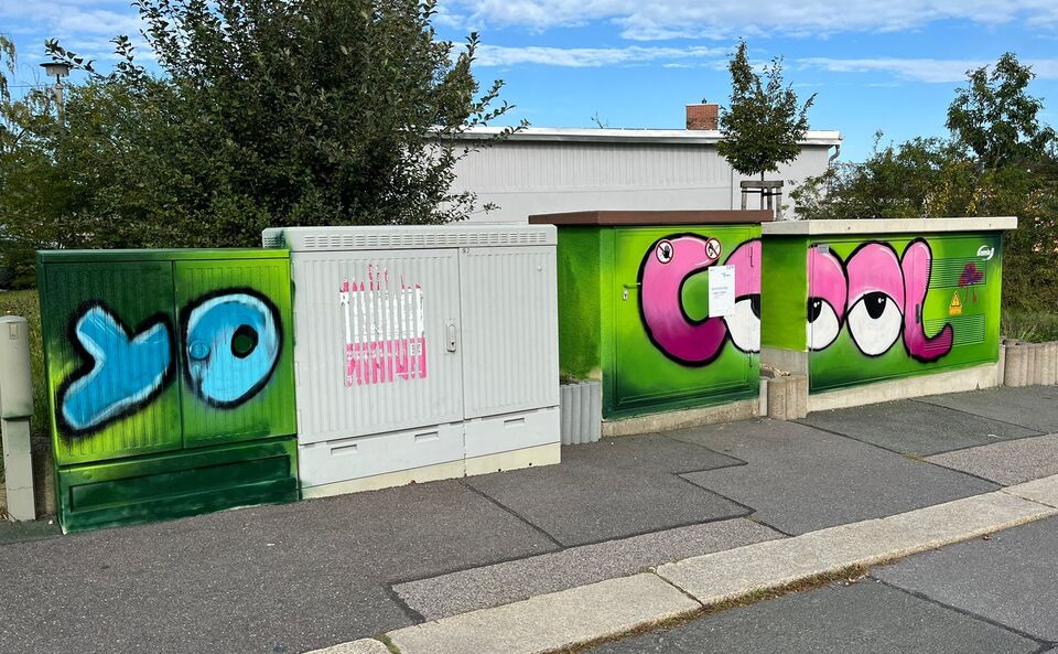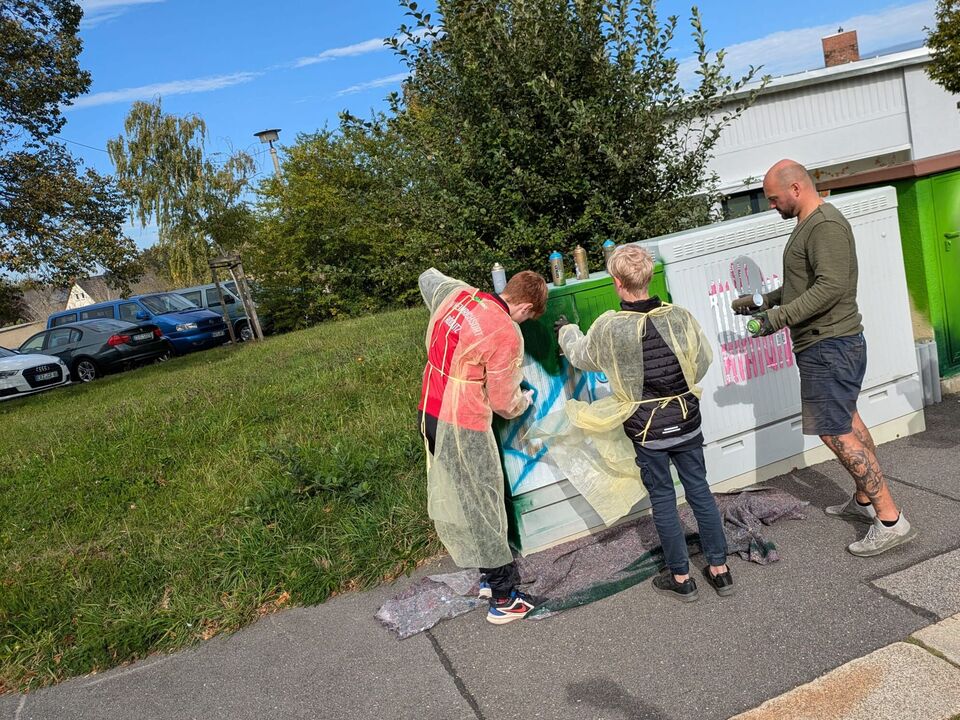 Der zweistündige Workshop ist ein Projekt der enviaM zur Gestaltung von vorrangig Trafostationen und Stromverteilerkästen. Nico Roth klärte die Kinder zunächst über Gefahren und Auswirkungen des illegalen Sprühens auf, bevor es an die Spraydosen ging. Nach einer Einweisung über Sprühstärken und Stilmitteln konnten die jungen Künstler dann loslegen und durften nahezu alles selbst besprühen.