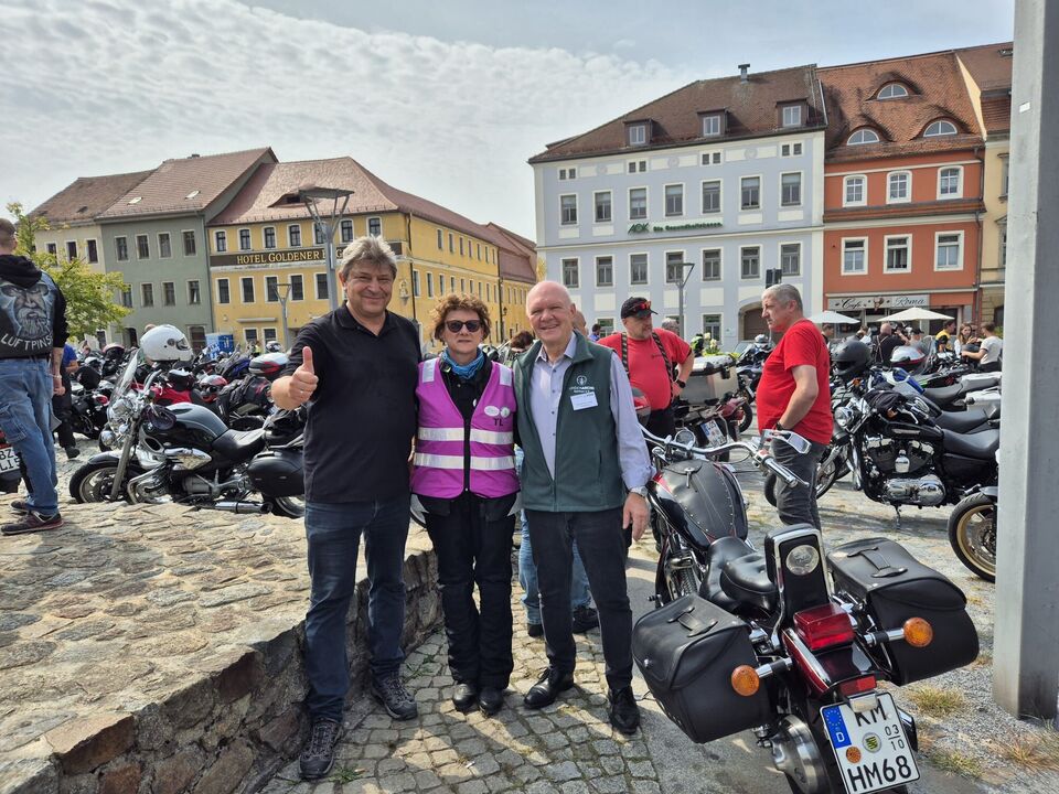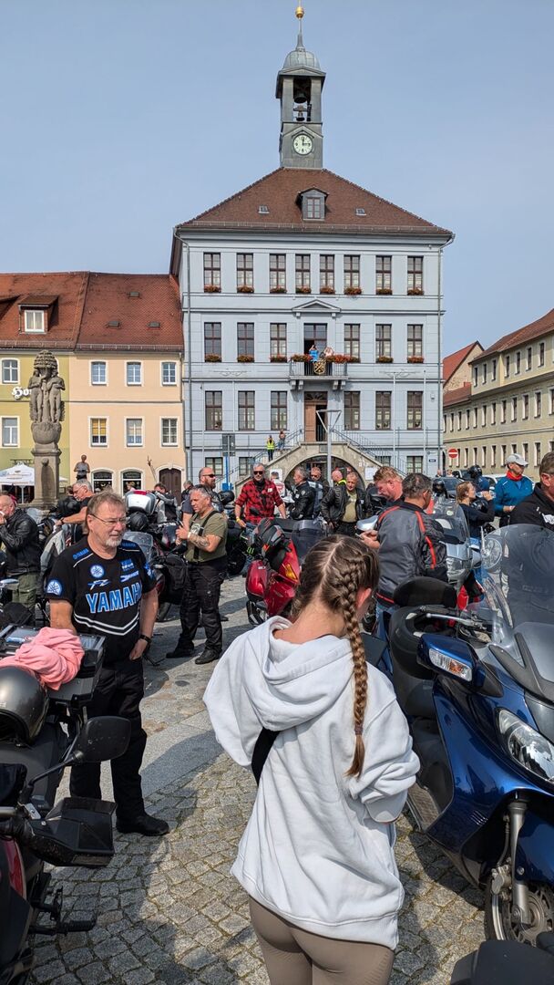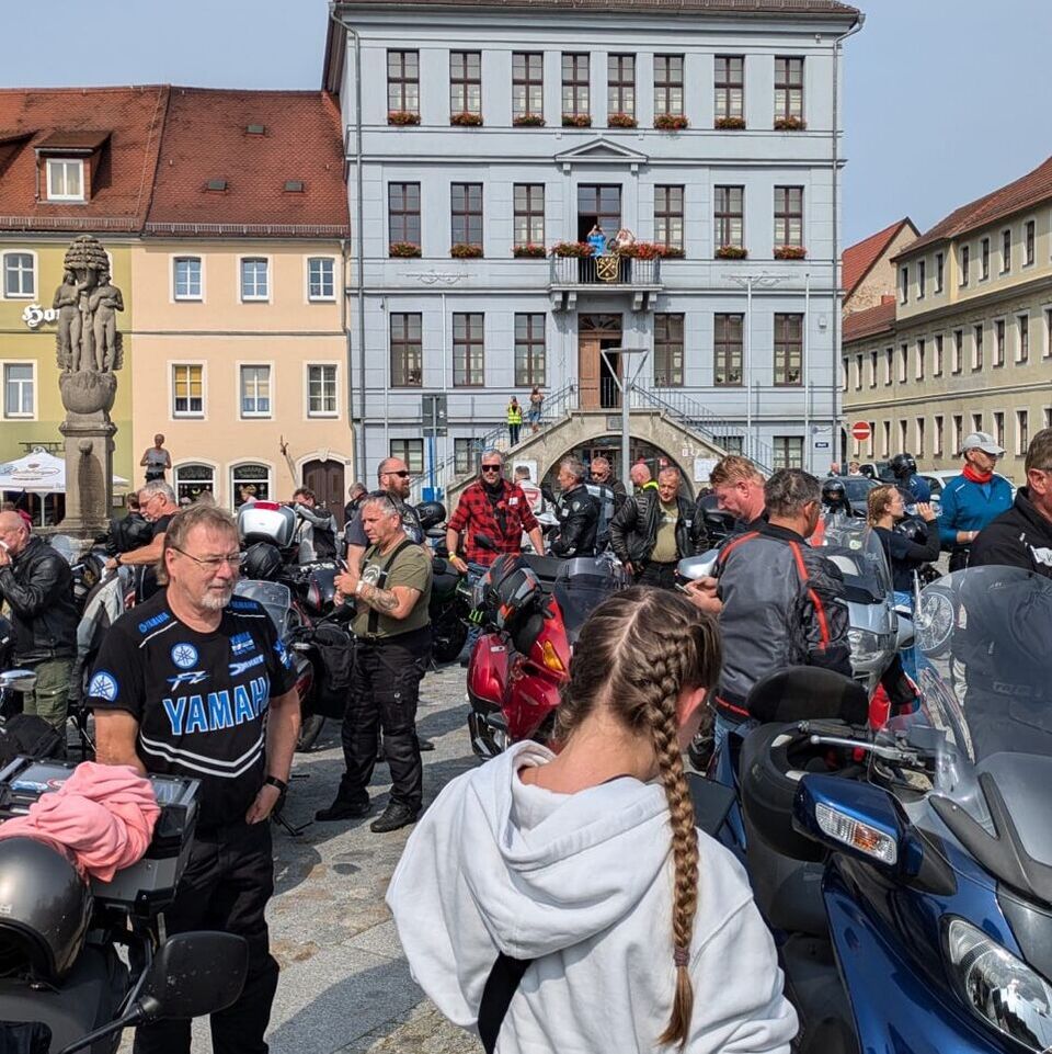 Punkt 12 Uhr begrüßte Oberbürgermeister Holm Große die beeindruckende Gruppe aus 232 Bikern herzlich in Bischofswerda, wo sie den Marktplatz gut füllten.