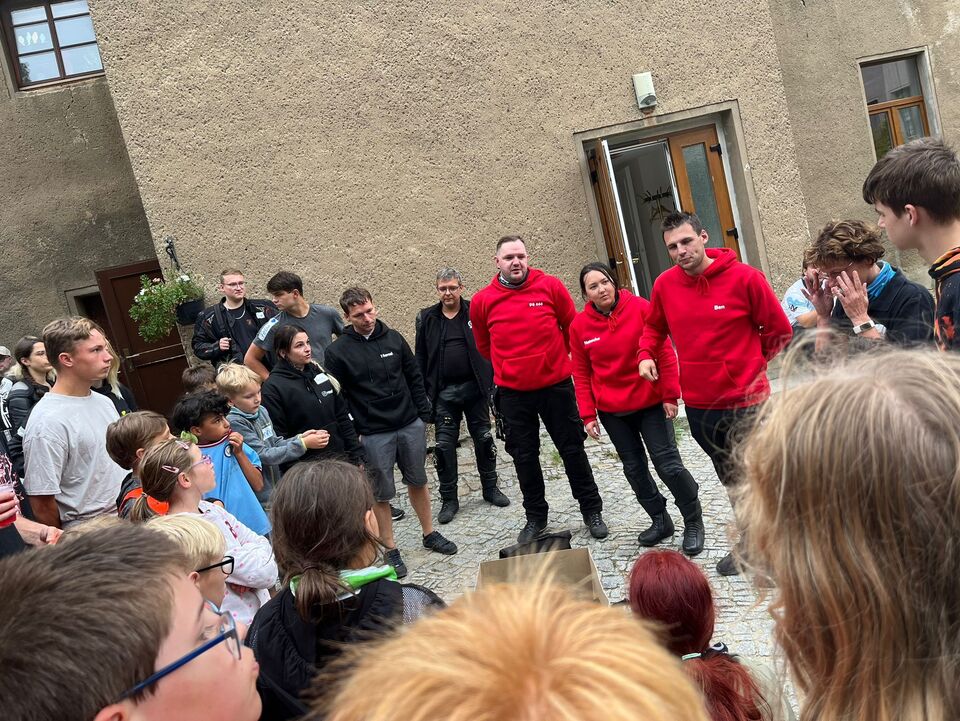Nach der Begrüßung hieß es „Aufsitzen und losbrausen!“ Über kleine Straßen ging es im PS-starken Tross durch Bautzen bis nach Bischofswerda. Hier begrüßte Punkt 12 Uhr der Oberbürgermeister Holm Große die beeindruckende Gruppe herzlich in der Stadt, überreichte Süßes und ein Spiel von Bischofswerda an die Kinder. Auch Kinderarche-Vorstand Matthias Lang begrüßte die Biker und dankte herzlich allen Beteiligten für ihr unglaubliches Engagement rund um die jährliche Ausfahrt. Einrichtungsleiterin Kristina Jöhling übergab allen Bikern einen kleinen „Alleskönner“ zum Dank für ihren ehrenamtlichen Einsatz.