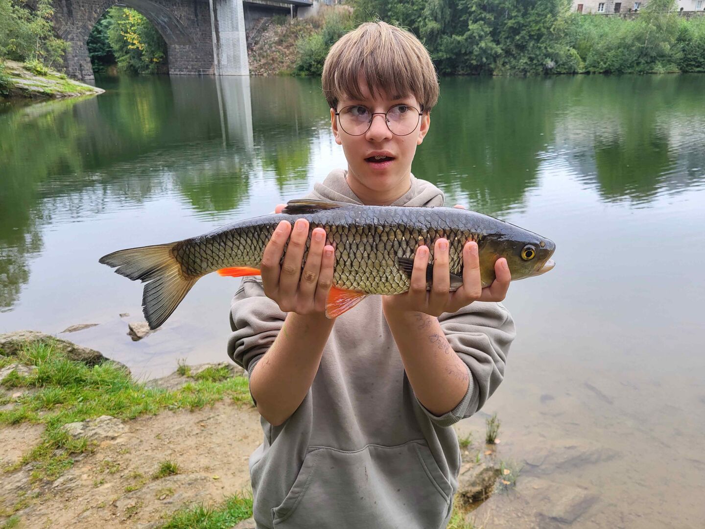 Zu jedem Angel-Ausflugs packen alle mit an und laden die Ausrüstung in unseren Bus. Auch achtet schon fast jeder auf wettergerechte Kleidung. Im August 2023 hatten wir ein Riesen-Glück und konnten einen 50 cm großen „Döbel“ fangen, der stolz in der Wohngruppe gezeigt und zum Verzehr zubereitet wurde. Es herrschte große Aufruhr, als dieser schöne Fisch gefangen wurde – ein toller Start in der Kategorie „Friedfisch-Angeln“. In der Kategorie „Raubfisch“ konnten wir gemeinsam schon schöne Barsche fangen.