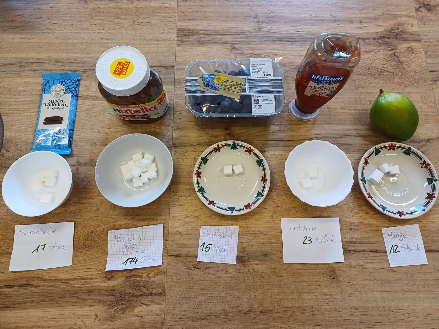Im ersten Schritt des Projekts mussten die Kinder den Zuckergehalt von verschiedenen Lebensmitteln schätzen und die entsprechende Anzahl der Zuckerwürfel in die Schalen legen.