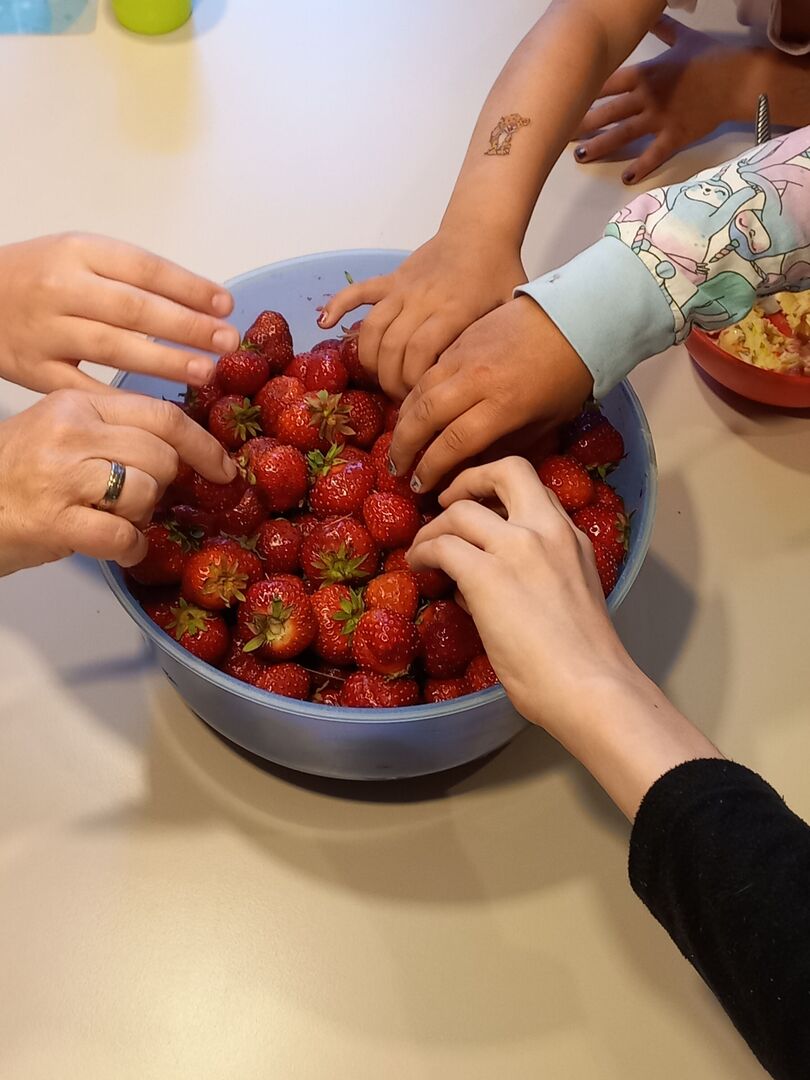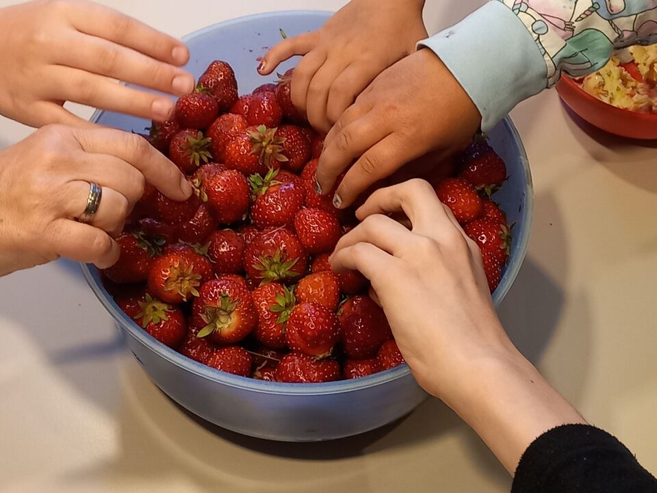 Nach etwa einer Stunde hatten wir unsere Behältnisse voll und auch unsere Bäuche, denn Naschen war ausdrücklich erlaubt und „die Erdbeeren sind so lecker“ hörte man immer wieder schmatzend. Wieder in der WG zurück machten wir uns gleich an die Arbeit, denn Erdbeertag heißt noch viel mehr als pflücken. Bis zum Abendbrot putzten Evin und Rosalie unermüdlich Erdbeeren. Leon kümmerte sich derweil ums Mixen und das Kochen der Marmelade. Spannend war wie jedes Jahr das Herstellen der Erdbeertorte: „Ach so geht das!“. freut sich Evin über das Ergebnis.