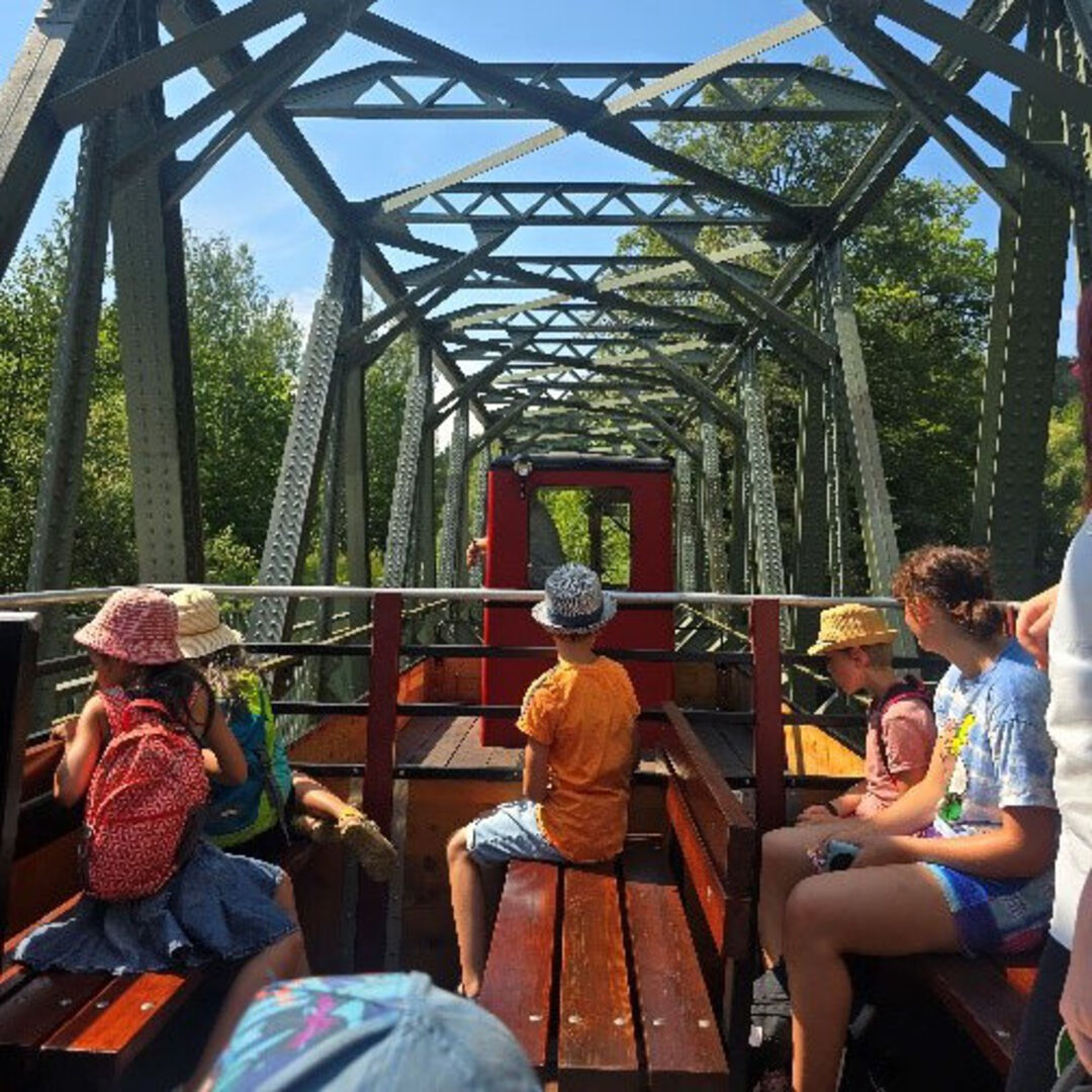 Sehr toll war, dass wir die Bahn ganz für uns acht Kinder und zwei Erwachsene allein hatten. Kurz nachdem die Bahn losgefahren war, wurden wir natürlich auch nach unseren Fahrkarten gefragt. Jede wurde abgestempelt. Wir fuhren durch den Wald direkt an der Chemnitz entlang. Teilweise wurden wir von Fahrradfahrer/innen auf dem direkt daneben entlangführenden Fahrradweg begleitet. Wir fuhren entlang des Schweizertals bis nach Diethensdorf und direkt wieder zurück. Es war schon ein komisches Gefühl, die ganze Strecke „rückwärts“ zu fahren.