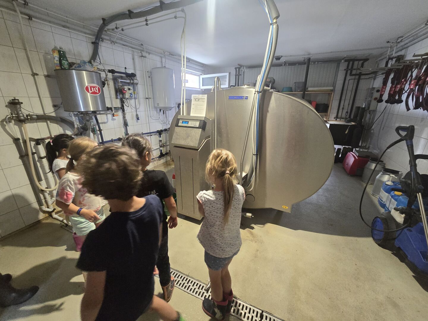 Es wurde uns alles gezeigt: die Haltung der Tiere, was sie fressen, wo sie hinkommen, wenn sie trächtig sind, wie sie sich frei bewegen können und selbstständig zum Melkroboter gehen. Auch wurde uns ein Kalb gezeigt, welches am Morgen erst das Licht der Welt erblickt hat. Dieses lag, wie andere auch, in den Kälberboxen. Dort werden die Kälbchen mit Hilfe eines „Kälberkinderwagens“ aus dem einen Stall zu den Boxen befördert. Ebenfalls wurde uns genau erklärt und gezeigt, welchen Weg die Milch hat. Vom Melken bis hin zur Aufbewahrung vor dem Abtransport.