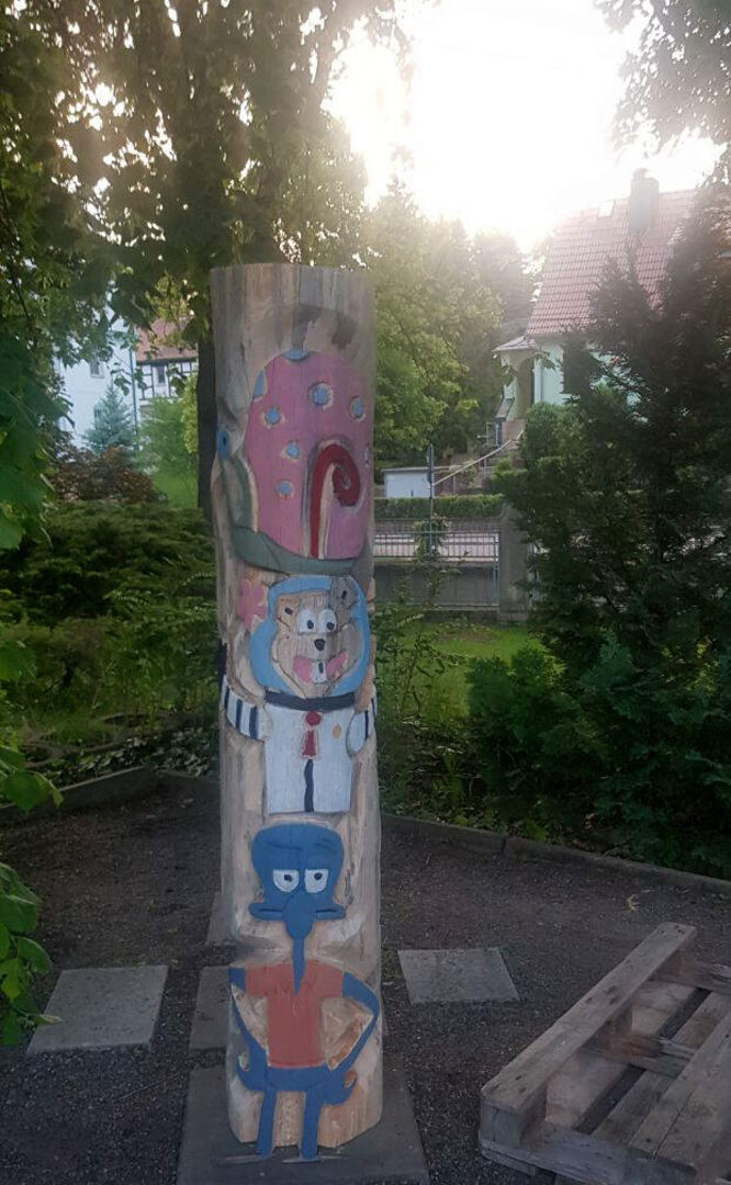 Wir starteten im April und Mai mit dem Land USA. Die Mädchen lernten bisher typische Spiele, landestypische kulinarische Köstlichkeiten sowie Wissenswertes über das Land kennen. Da auch die Indianer dort leben, hatten die Mädchen die Idee, einen Totempfahl zu gestalten. Dies setzten sie jetzt um – mit großartiger unentgeltlicher Unterstützung von Michel Neidhardt, Inhaber der Firma Naturstamm Blockbau in Zwickau OT Cainsdorf. Er spendierte den Mädchen einen Naturstamm inklusive Unterbau sowie seine Arbeitsleistung in Form des Schnitzens mit der Kettensäge. Vielen herzlichen Dank für die tolle Arbeit und das tatkräftige Einbeziehen der Mädchen!