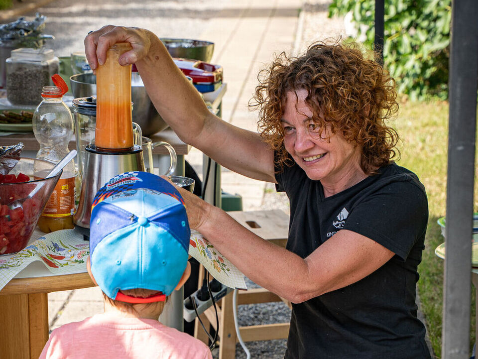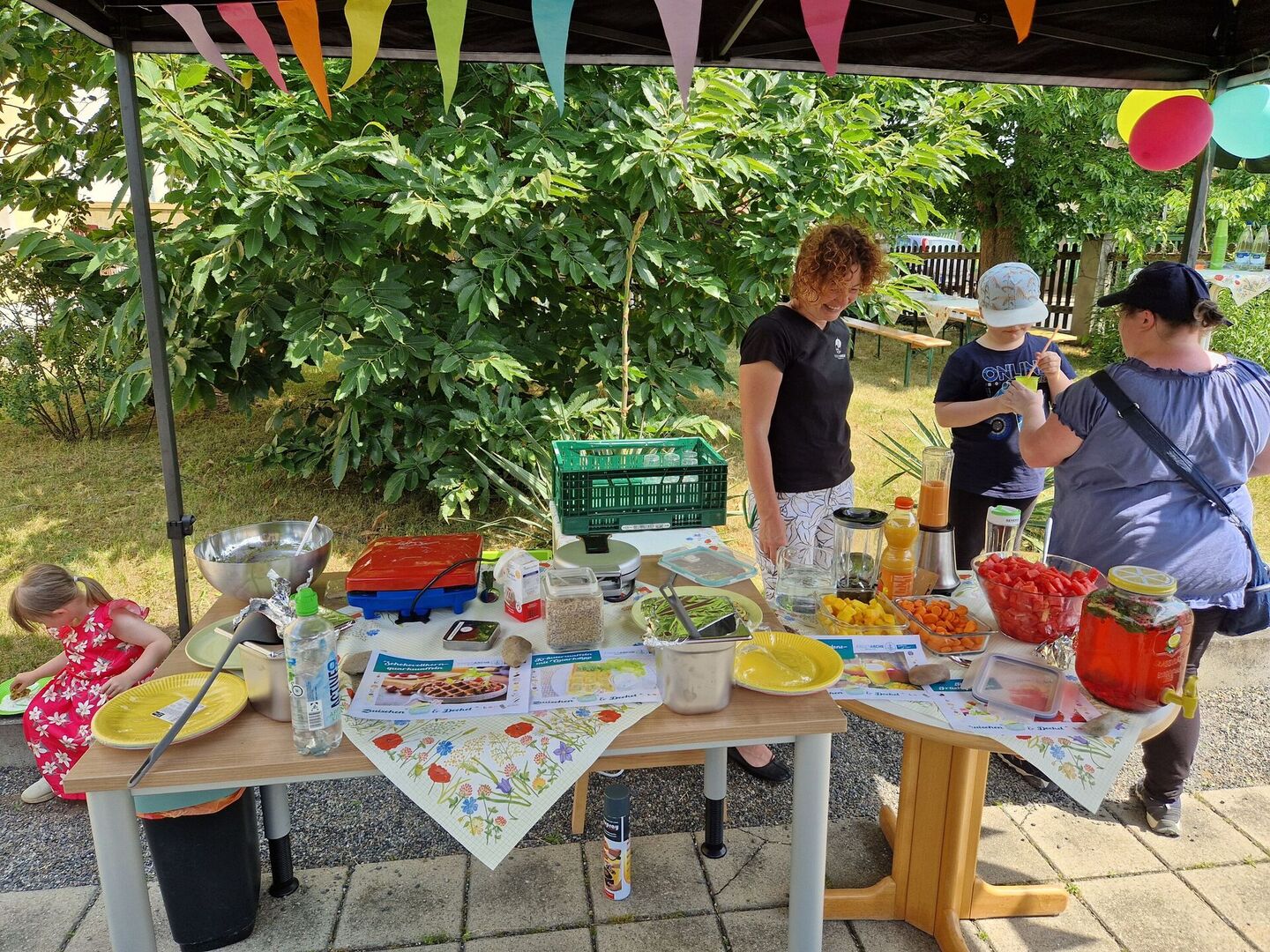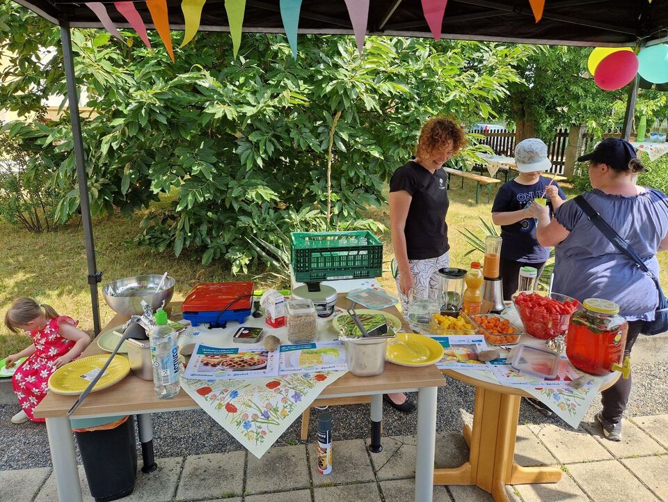 Und was wäre ein Fest ohne Leckerbissen auf die Hand? Gemeinsam mit Ernährungsberaterin Annett Roßmann bereiteten die Kinder aus frischen Zutaten und mit wenigen Handgriffen leckere Smoothies und Waffeln zu.
