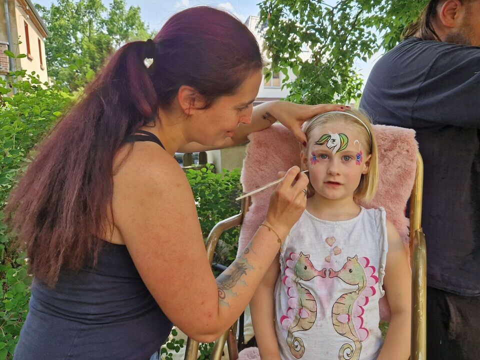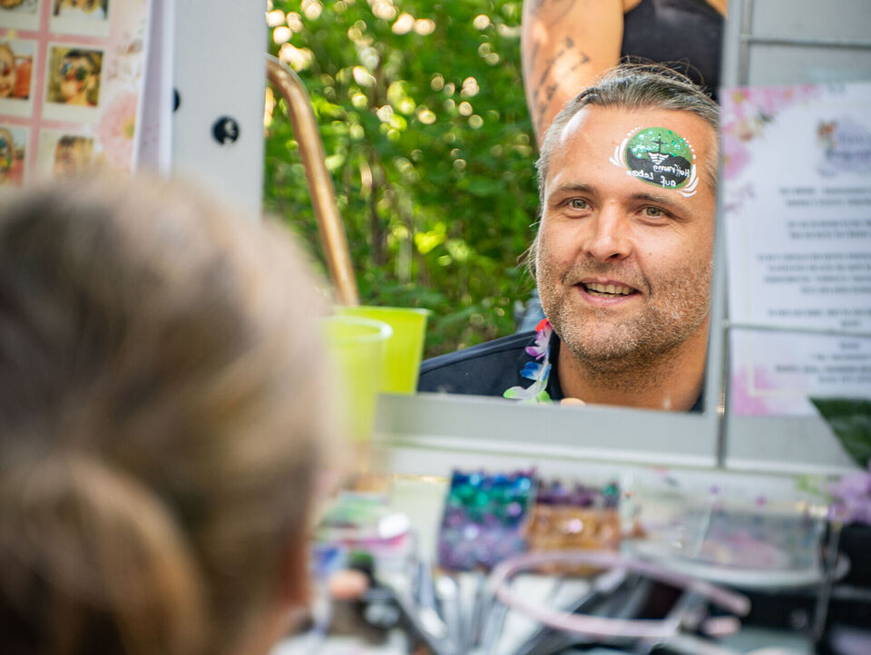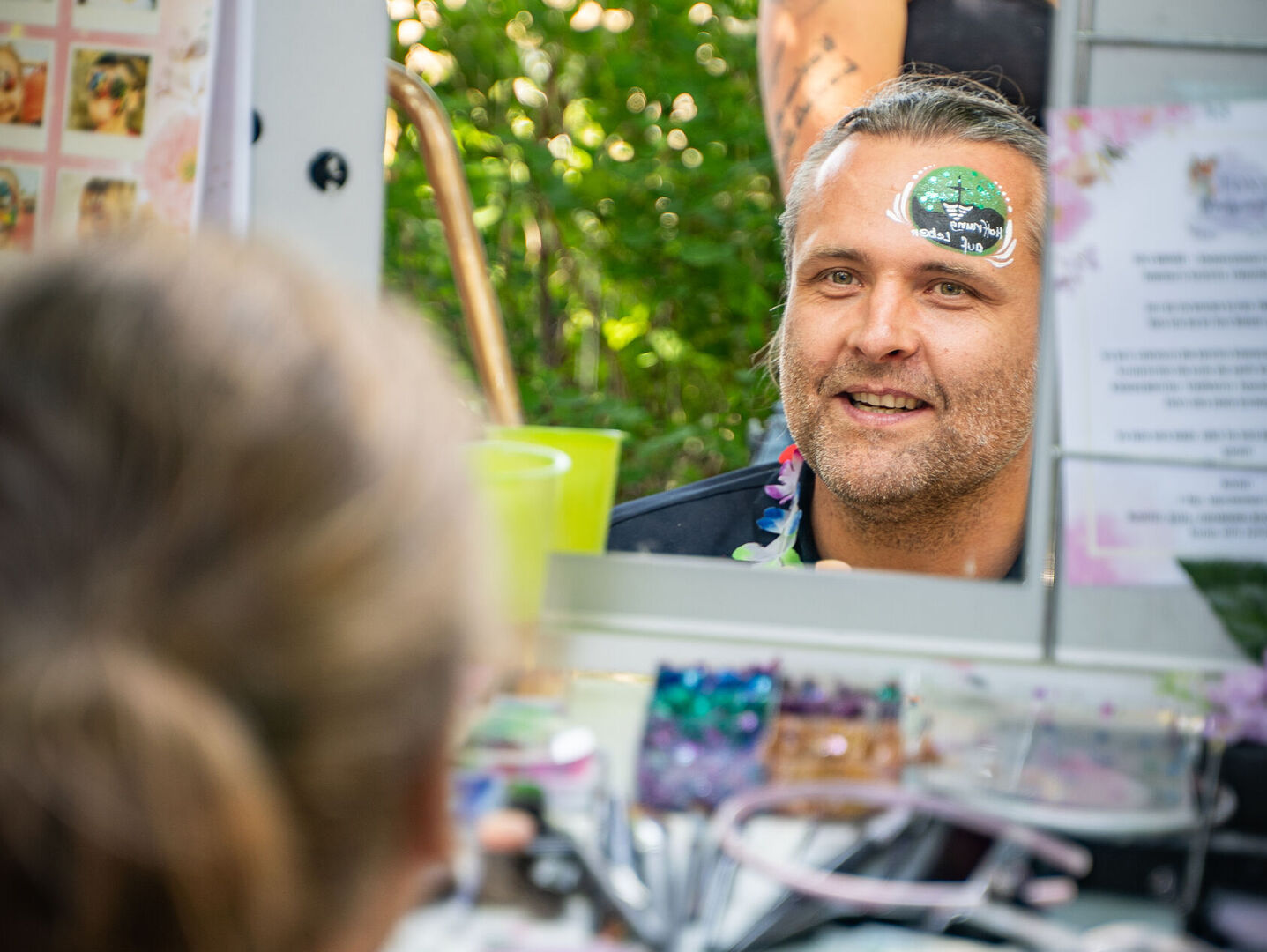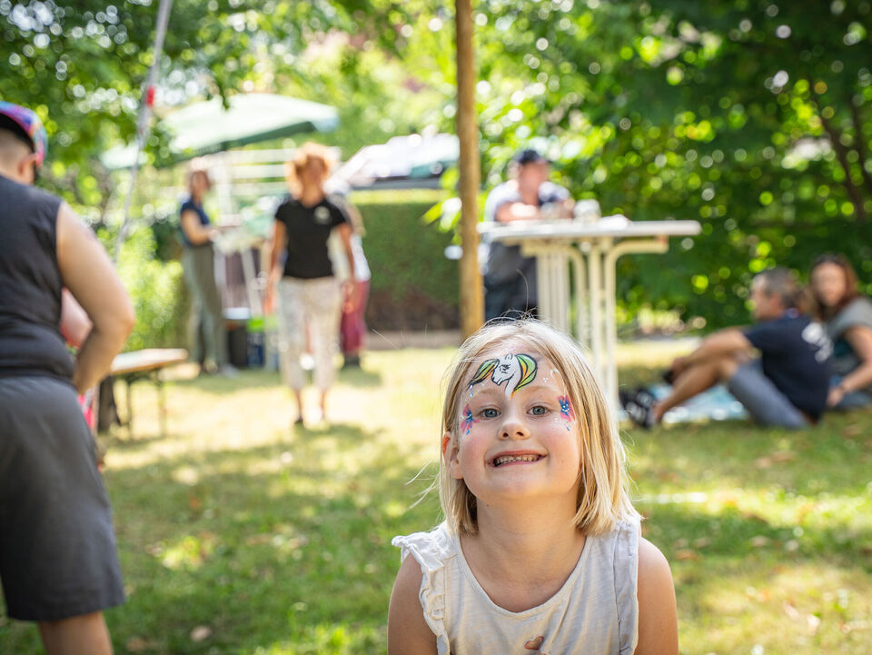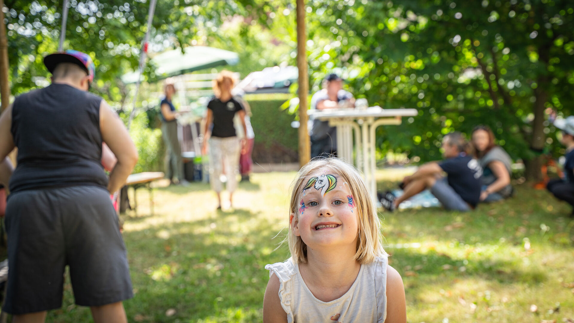 Bei strahlendem Sonnenschein und sommerlichen Temperaturen trafen sich ehemalige und aktuelle Familien aus der IFB, um einen unbeschwerten Nachmittag zu verbringen. Für die Kinder gab es zahlreiche kreative und sportliche Angebote: Mit Begeisterung und Zunge zwischen den Lippen wurden graue Steine in Kunstwerke verwandelt, Farbe und Glitzer beim Kinderschminken abgestaubt und beim Spikeball, auf der Slackline oder beim Schaukeln nach Herzenslust getobt. Wie schön, dass sogar eine unserer ehemaligen Mütter mit ihrem kreativen Talent filigrane Motive in staunende Kindergesichter zauberte – von Einhörnern, Tigern oder dem Kinderarche-Branding im Gesicht war alles dabei!