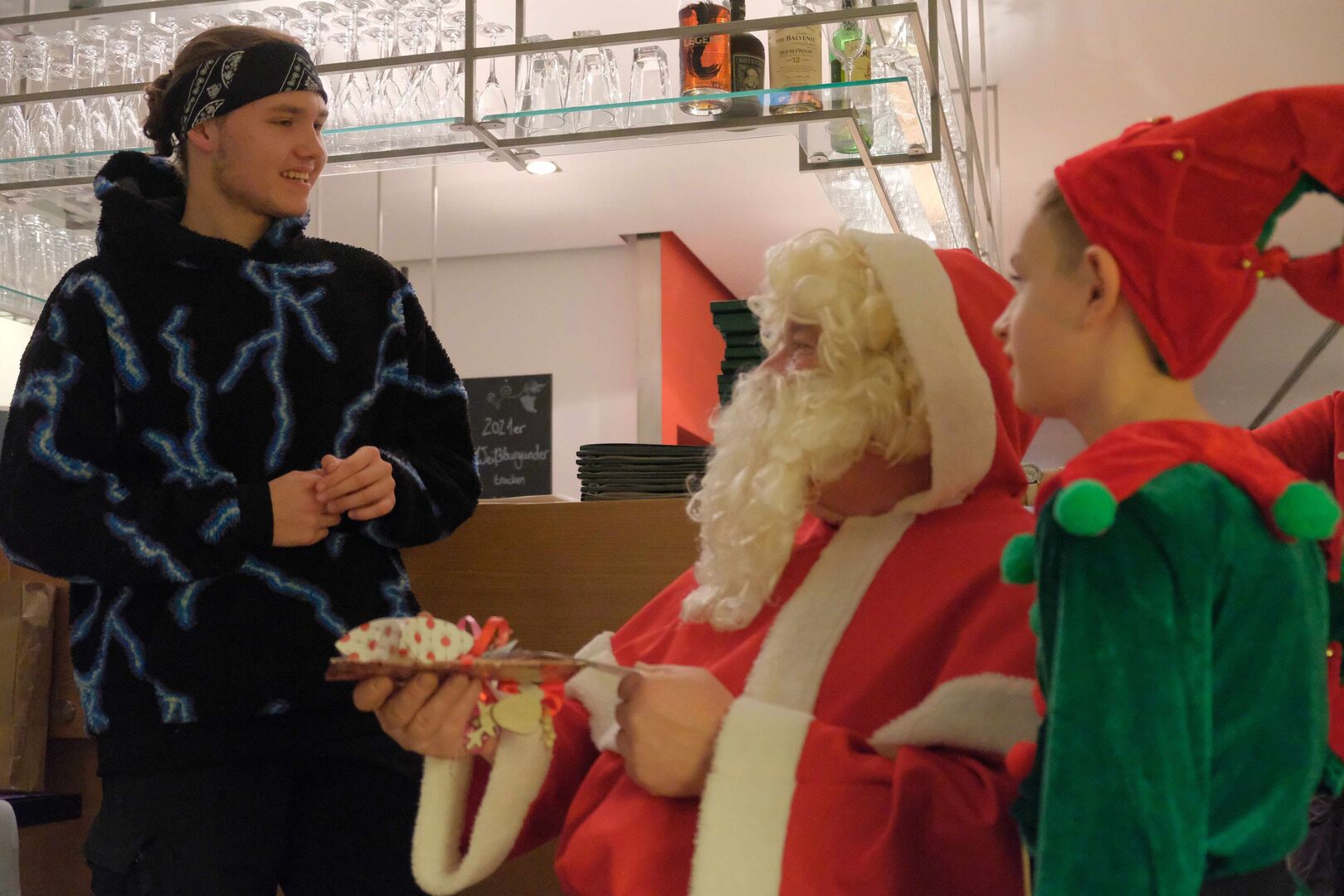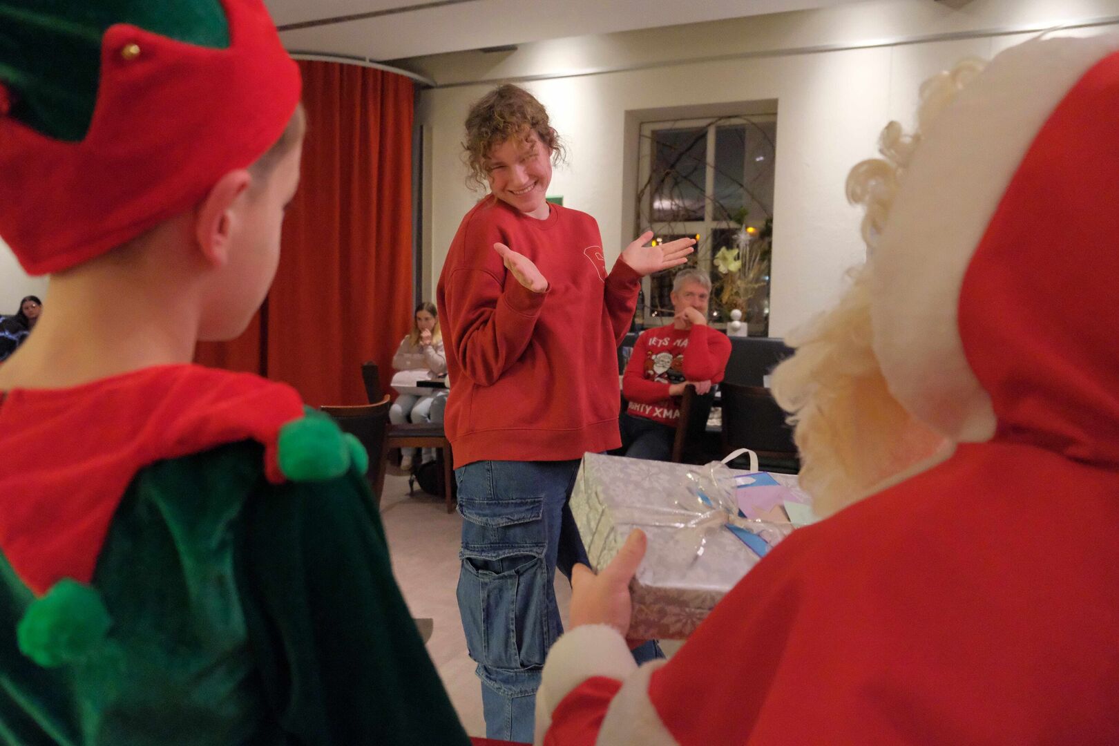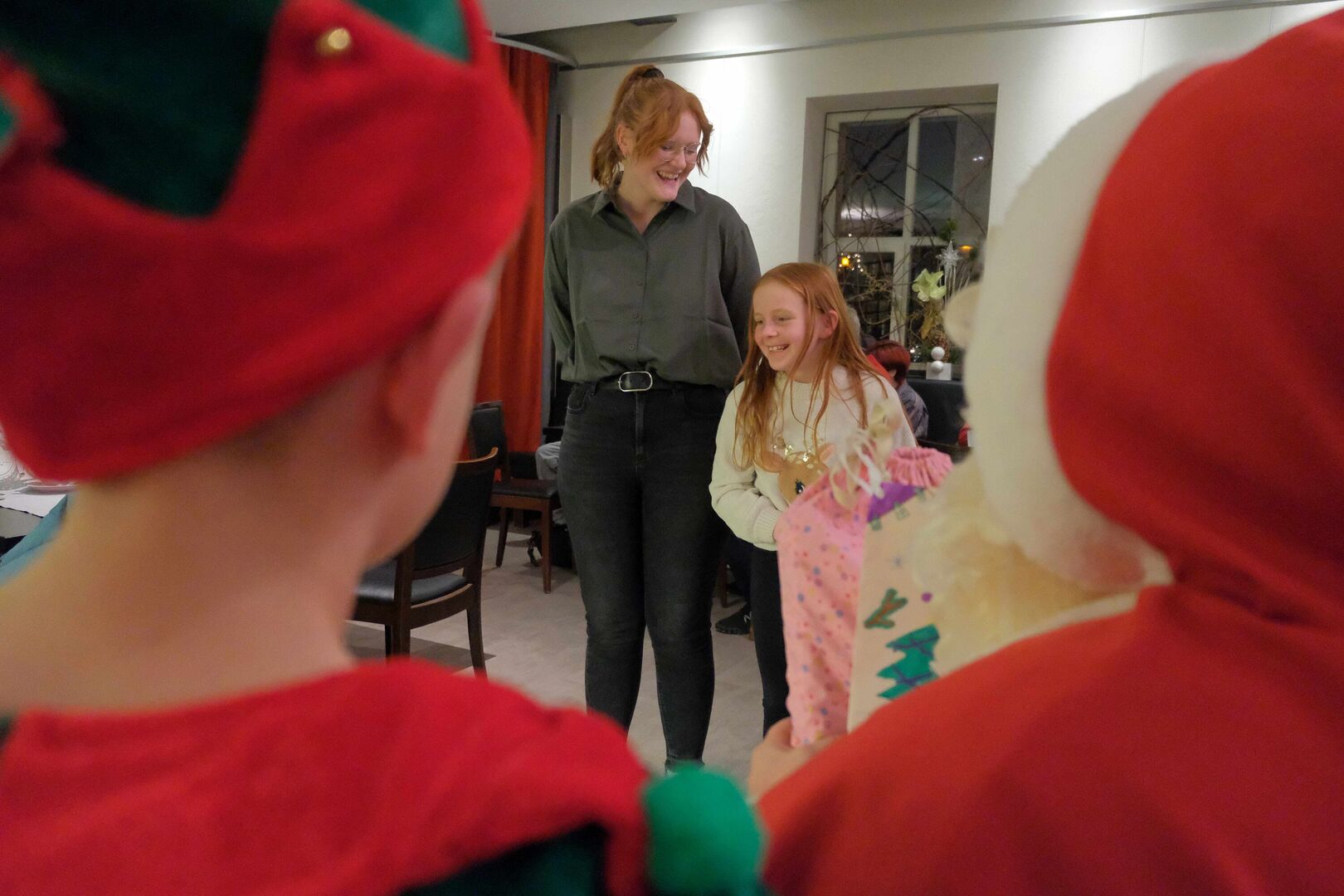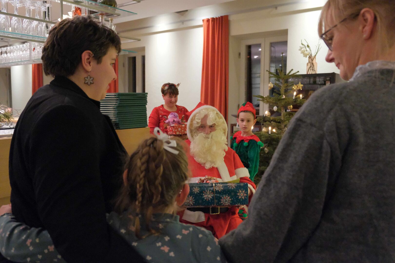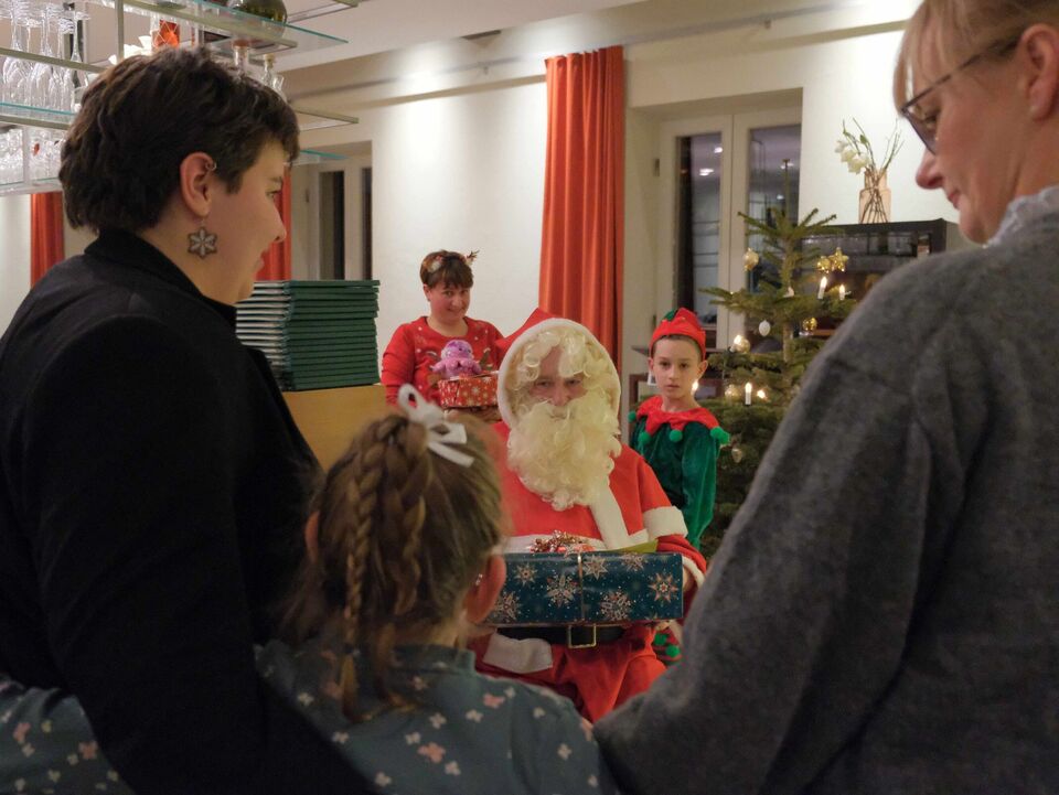 Gemeinsam mit seinem kleinen Wichtel bat der Weihnachtsmann die Kinder und Jugendlichen, die sich im Gasthaus von Schloss Wackerbarth versammelt hatten, um ein Ständchen, bevor es die Geschenke gab. Manche brauchten dabei ein bisschen Verstärkung...