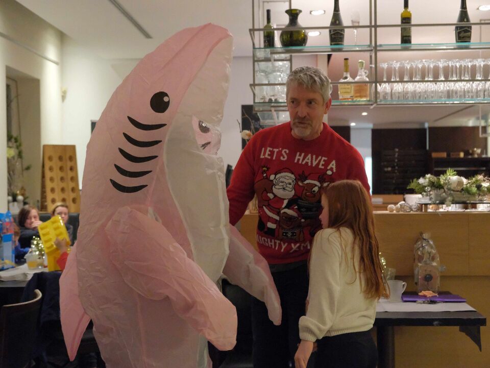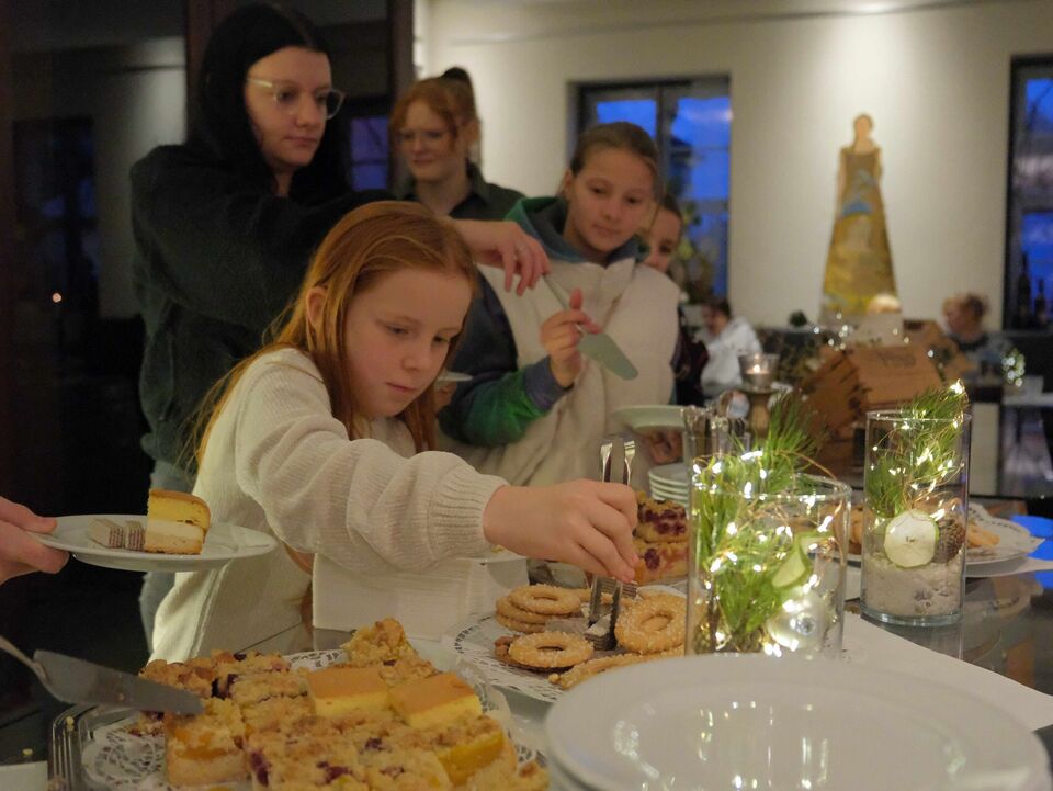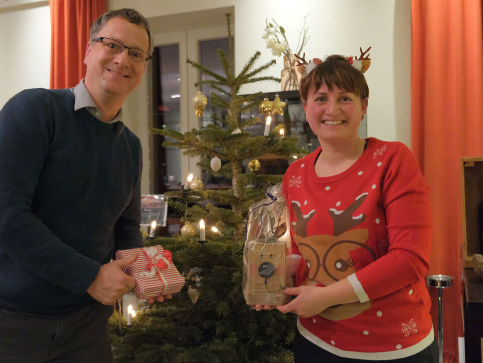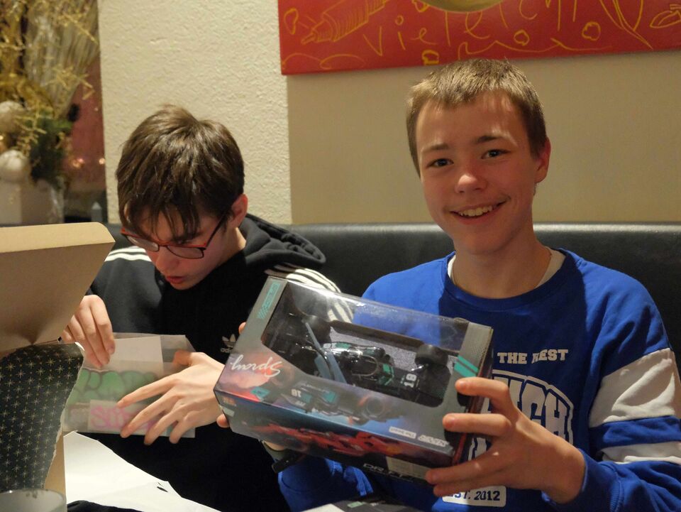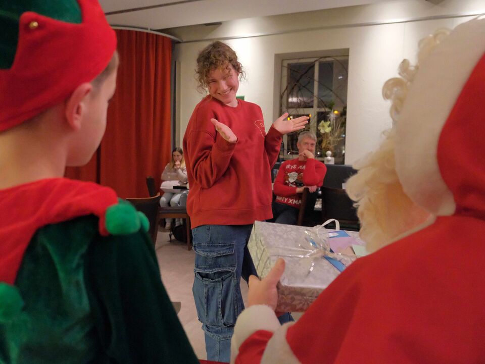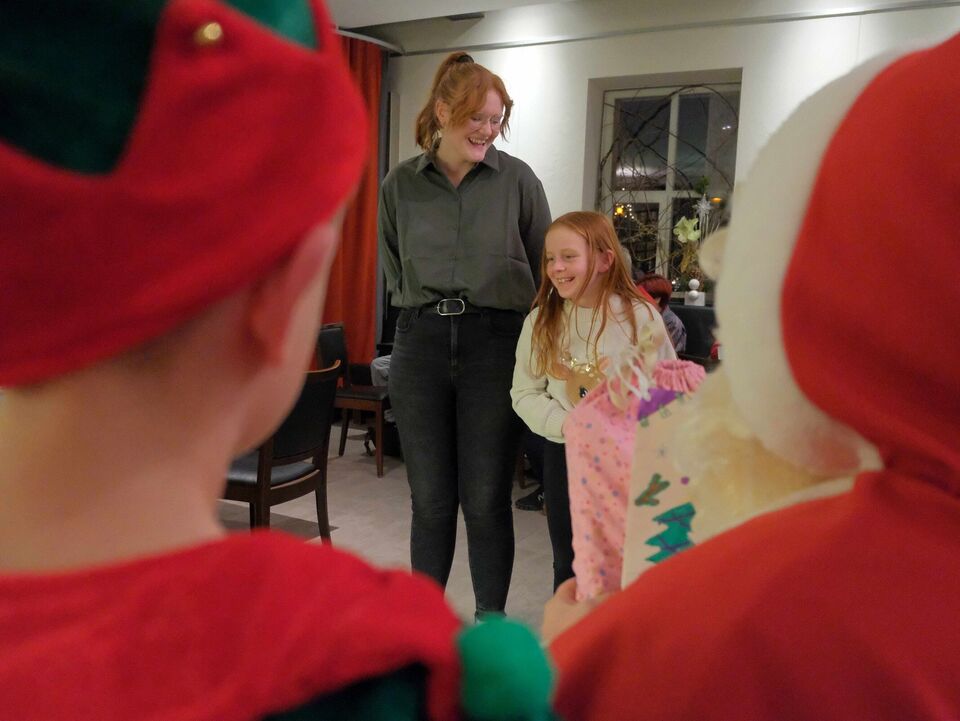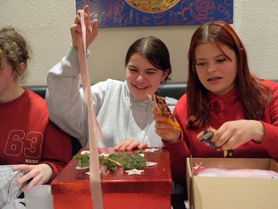 Beim Auspacken gab es viele „Ahs“ und „Ohs“ zu hören. Tolle Zeichenutensilien, Kosmetik, Bücher, Spiele, ein Zauberwürfel, Bilder, Autos, Lego-Sets oder auch Haushaltsutensilien ließen die Herzen der jungen Menschen höherschlagen. Das absolute Highlight war ein rosa Hai-Kostüm, das Lucy aus dem „Weinberghaus“ sich gewünscht hatte und natürlich gleich anprobieren musste. Viele Wichtel hatten ihre Gaben mit sehr persönlichen Grüßen und guten Wünschen für die Mädchen und Jungen versehen und zauberten damit ein zusätzliches Lächeln in die Gesichter.