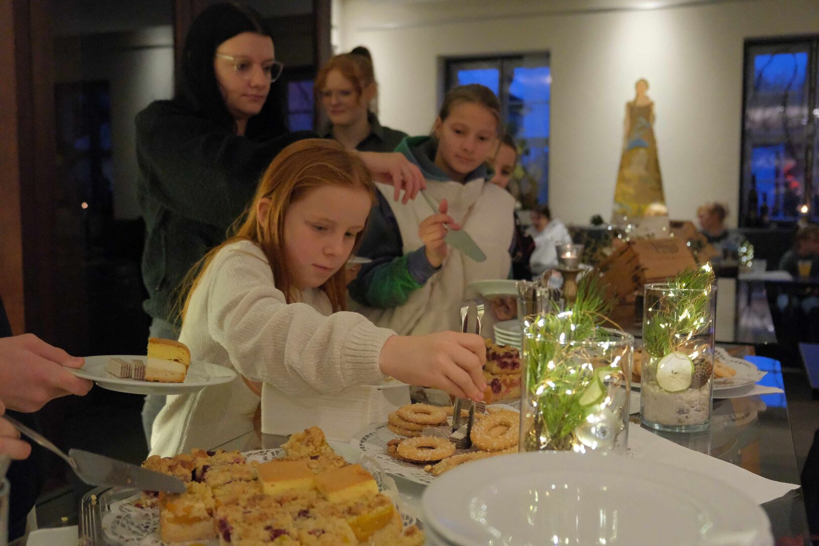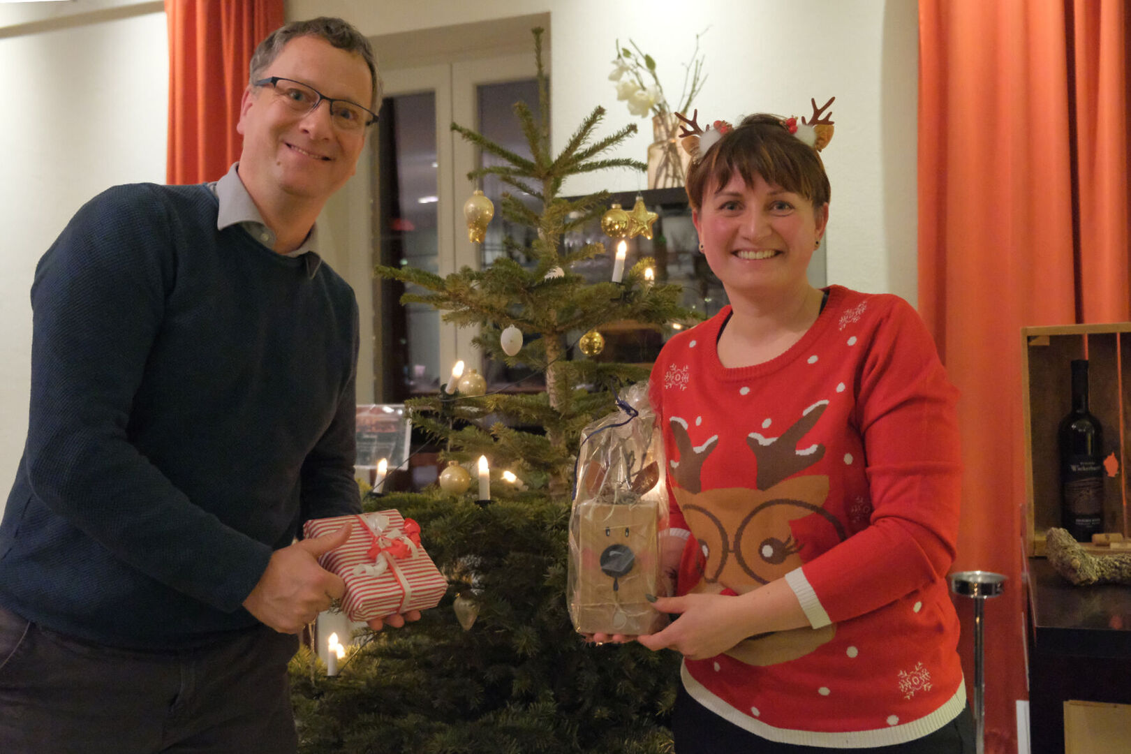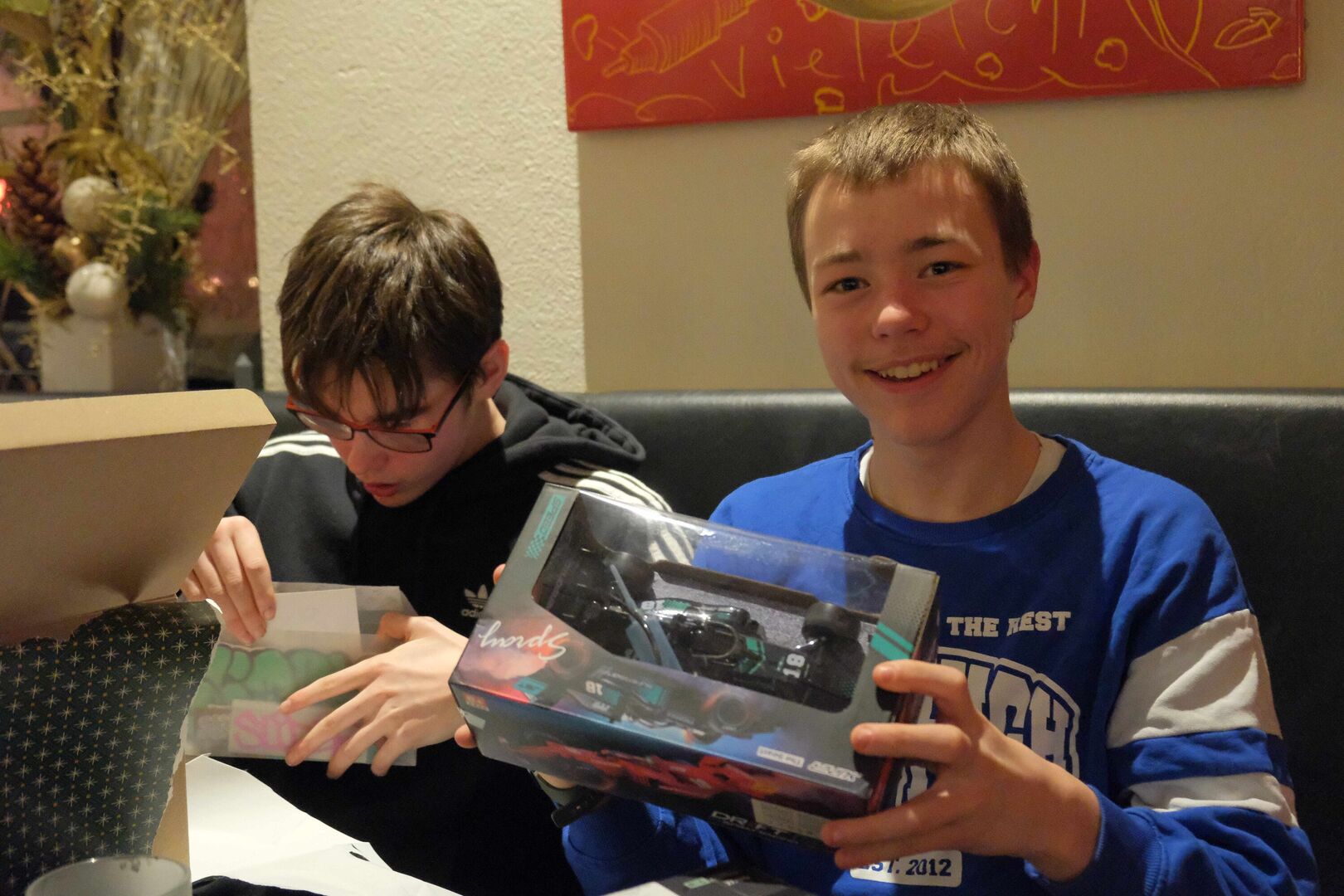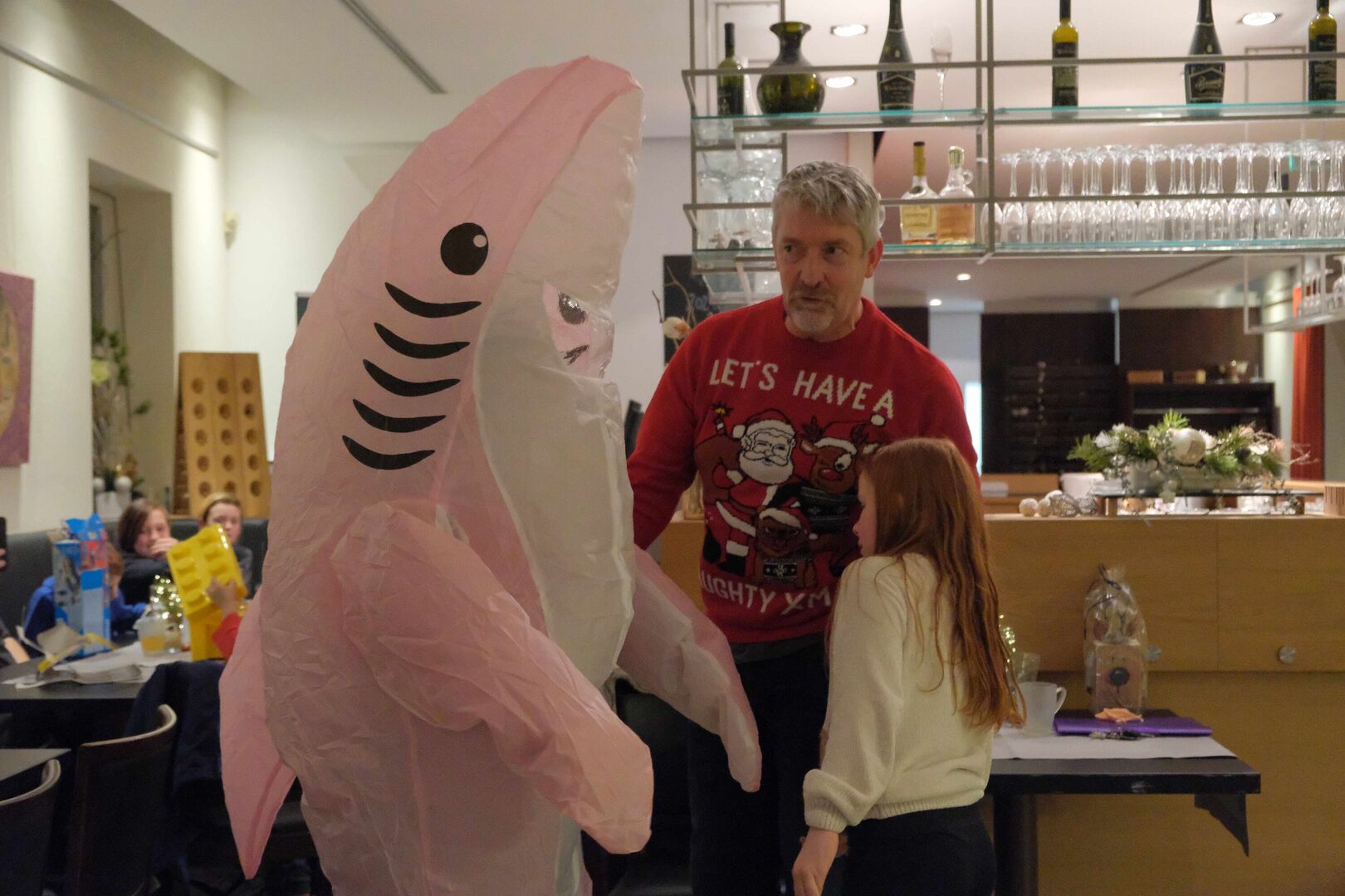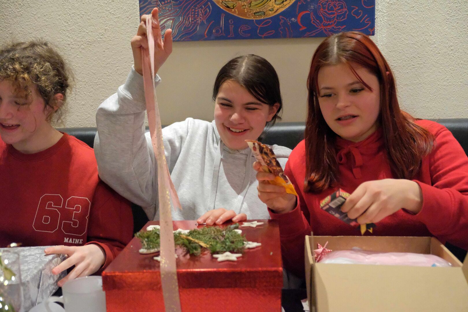 Beim Auspacken gab es viele „Ahs“ und „Ohs“ zu hören. Tolle Zeichenutensilien, Kosmetik, Bücher, Spiele, ein Zauberwürfel, Bilder, Autos, Lego-Sets oder auch Haushaltsutensilien ließen die Herzen der jungen Menschen höherschlagen. Das absolute Highlight war ein rosa Hai-Kostüm, das Lucy aus dem „Weinberghaus“ sich gewünscht hatte und natürlich gleich anprobieren musste. Viele Wichtel hatten ihre Gaben mit sehr persönlichen Grüßen und guten Wünschen für die Mädchen und Jungen versehen und zauberten damit ein zusätzliches Lächeln in die Gesichter.