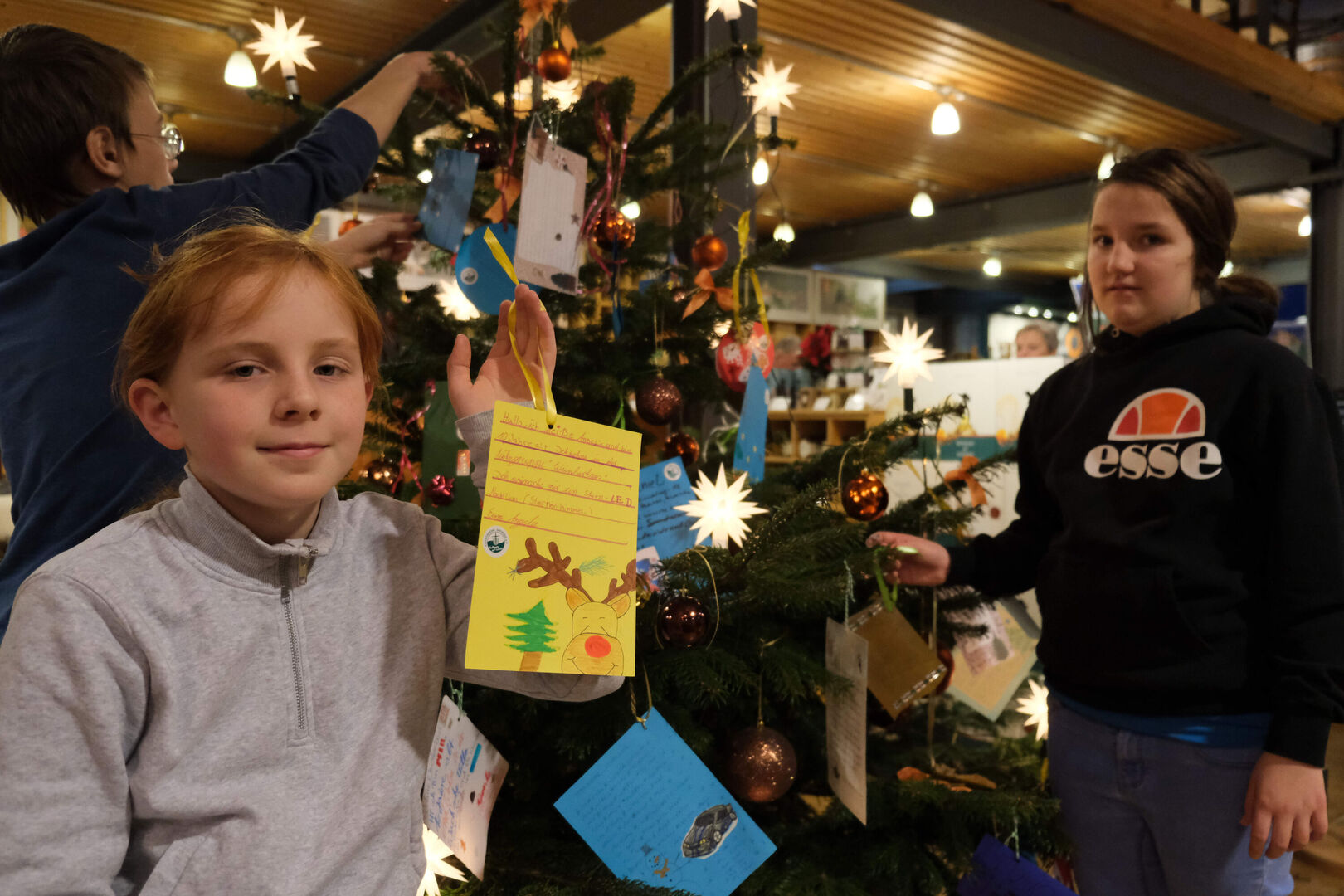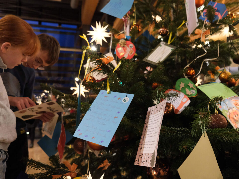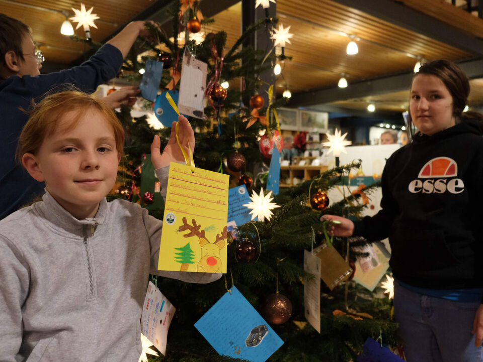 Insgesamt 42 Wunschzettel haben Angelie, Maria und Diego an den Wunschbaum im Gutsmarkt von Schloss Wackerbarth gehängt, von Kindern und Jugendlichen aus sieben Kinderarche-Einrichtungen in und um Radebeul.
