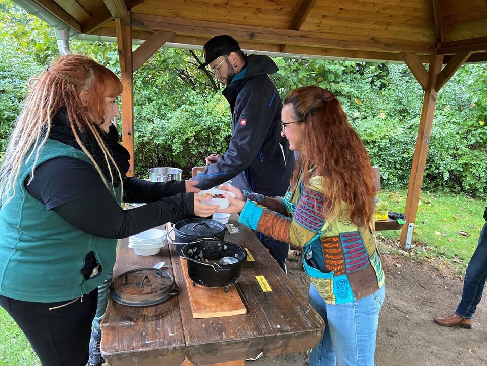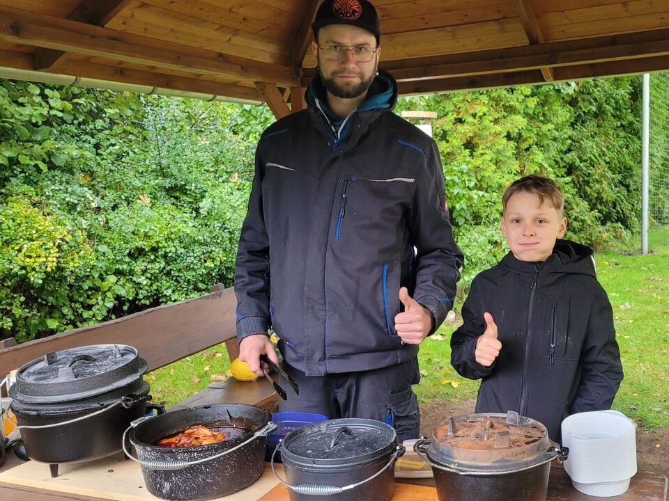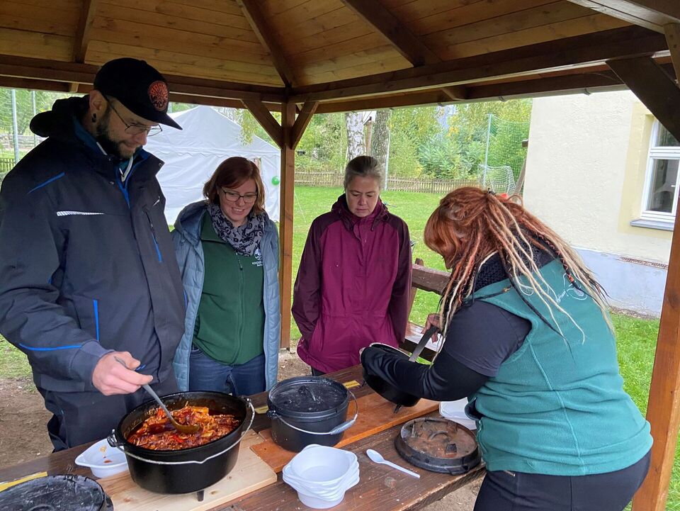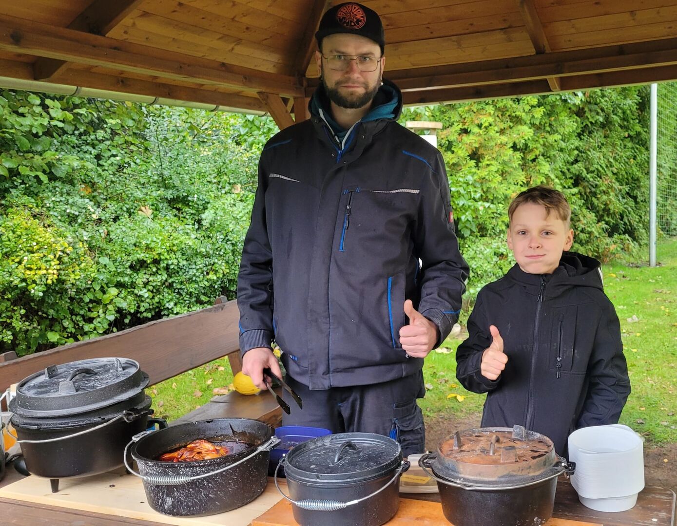 Da dann doch immer mehr Mägen knurrten, gab unser Starkoch des Abends das Go für das mühevoll zubereitete Abendessen. Dieses Jahr wurde etwas aus „Dutch-Oven“ (Feuertopf) kredenzt. Die Vorbereitungen dafür liefen bereits seit dem Vormittag auf Hochtouren. Denn riesige Gemüseberge warteten darauf, verarbeitet und geschichtet zu werden. Die harte Küchenarbeit der Kinder unter Anleitung des engagierten Kochs hatte sich definitiv gelohnt.