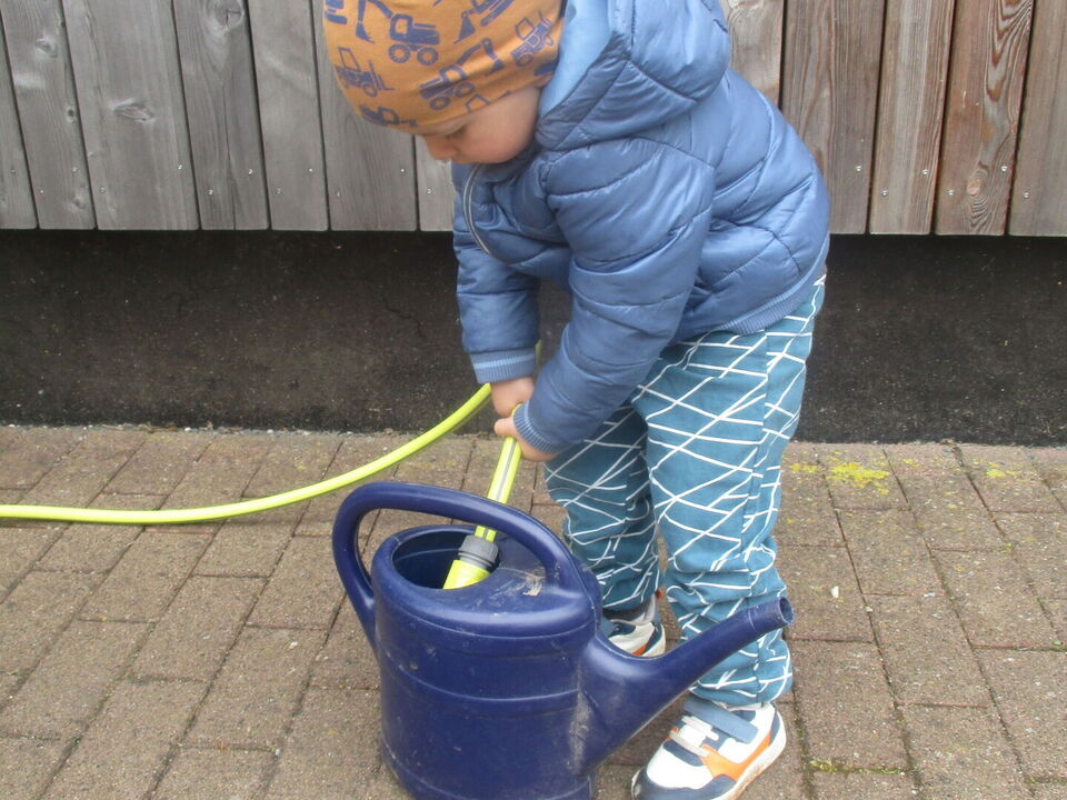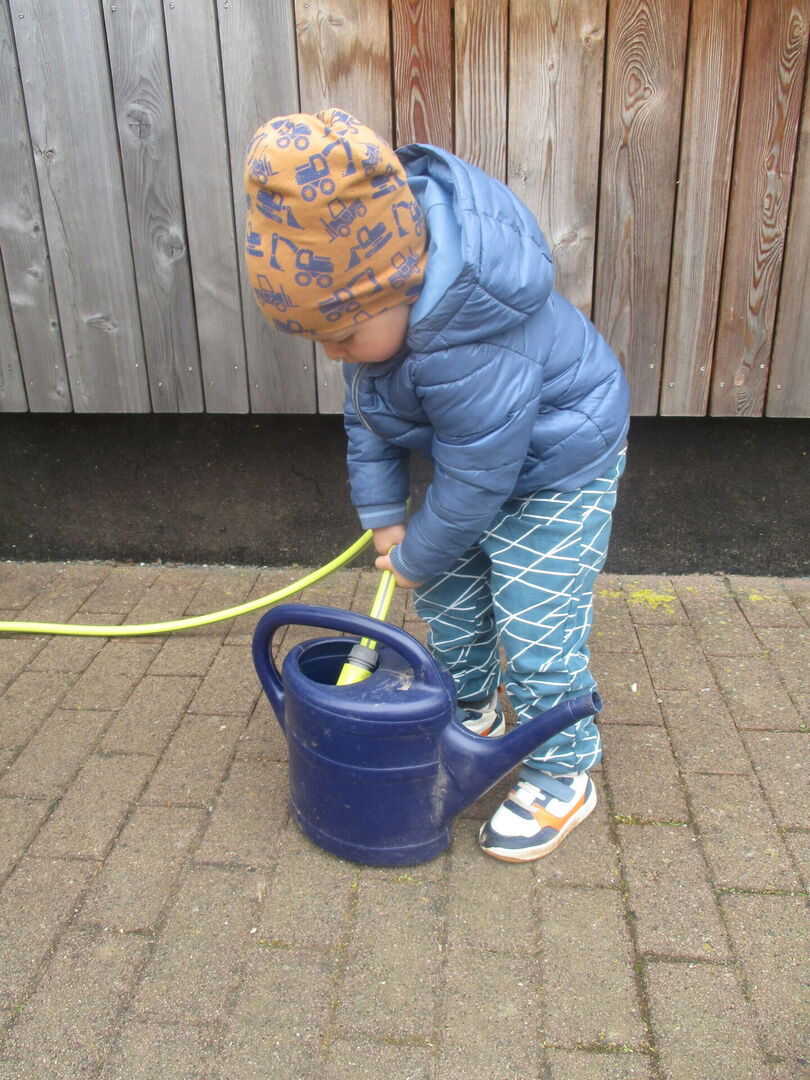 Die Kinder hatten große Freude daran, Löcher zu formen und die Samen darin einzubuddeln. Mit der Gießkanne noch Wasser holen und nun heißt es abwarten!