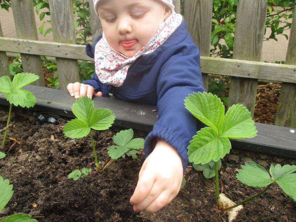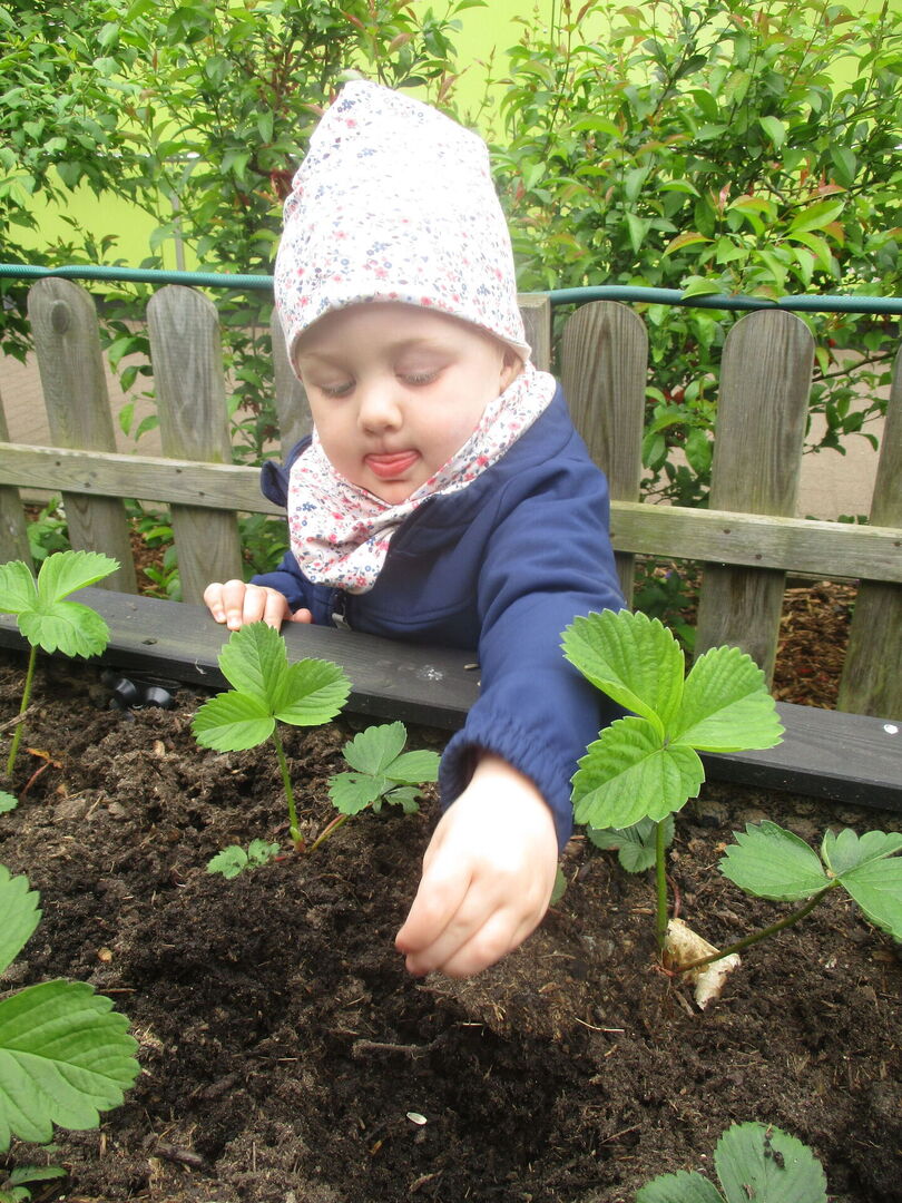 Nun ließ sich die letzten Tage wunderbar beobachten, wie die kleinen Erdbeerpflanzen vom vergangenen Jahr an Größe gewinnen und die Kinder mit Sicherheit in wenigen Wochen frische Erdbeeren davon naschen können.