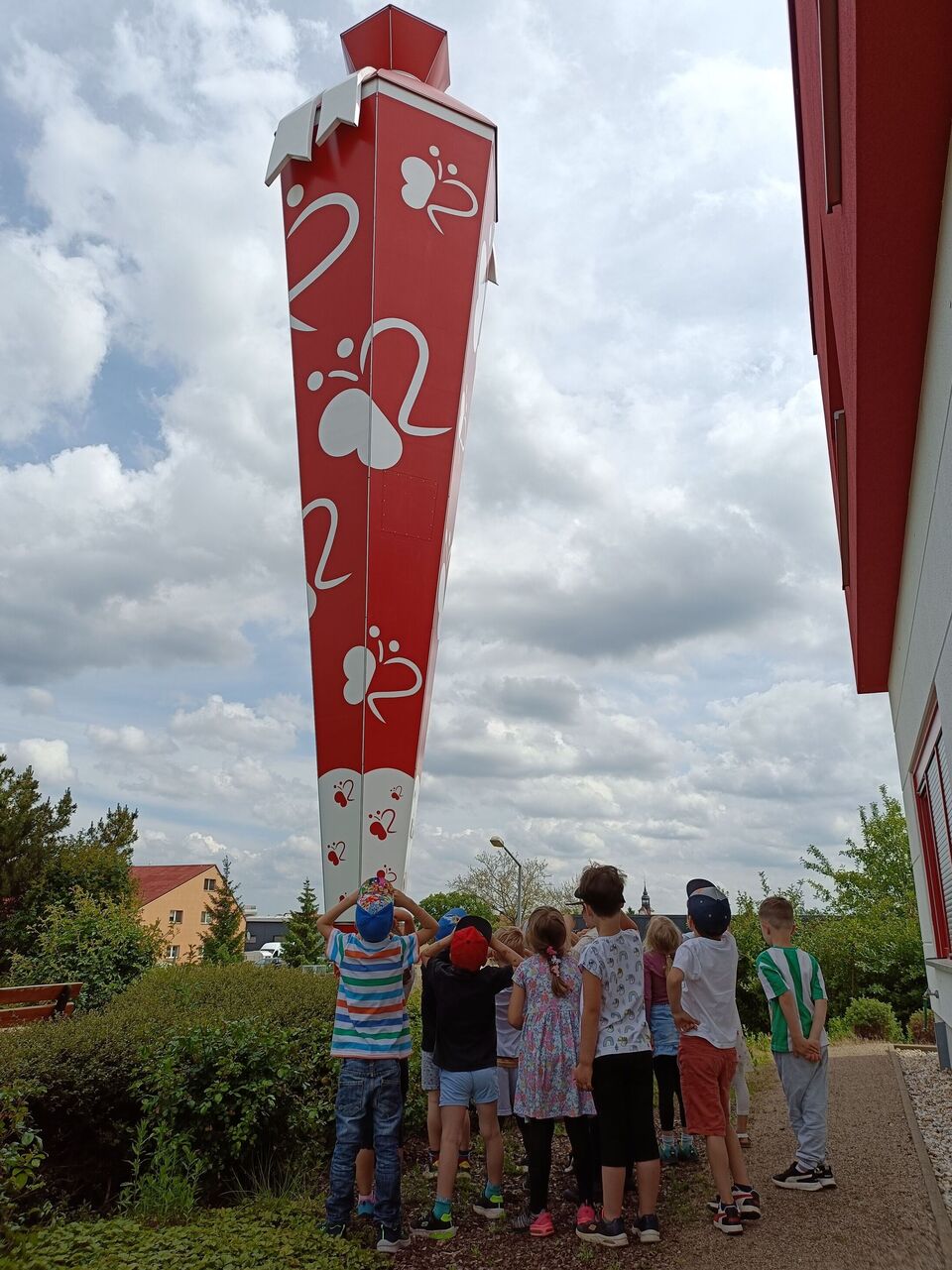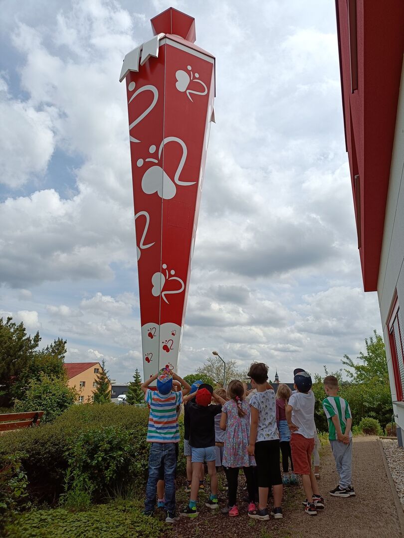 Diese Fragen wurden uns zu unserem Ausflug, am 21.5.24, in die Zuckertütenfabrik Roth erklärt. Als Detektive verkleidet und mit Lupe ausgestattet begaben sich unsere Vorschüler auf die große Entdeckungstour. Wir beobachteten jeden Schritt der Herstellung. Von der leeren Tüte, über die Beklebung, bis zum Anbringen des Tülls. 1 Millionen Zuckertüten, ganz unterschiedlich groß und mit ganz verschiedenen Motiven, werden bei Roth hergestellt. Ganz besonders beeindruckend für unsere Kinder war die riesige Zuckertüte vor der Fabrikhalle. Diese misst 16 Meter - das sind 12 Vorschüler übereinander.