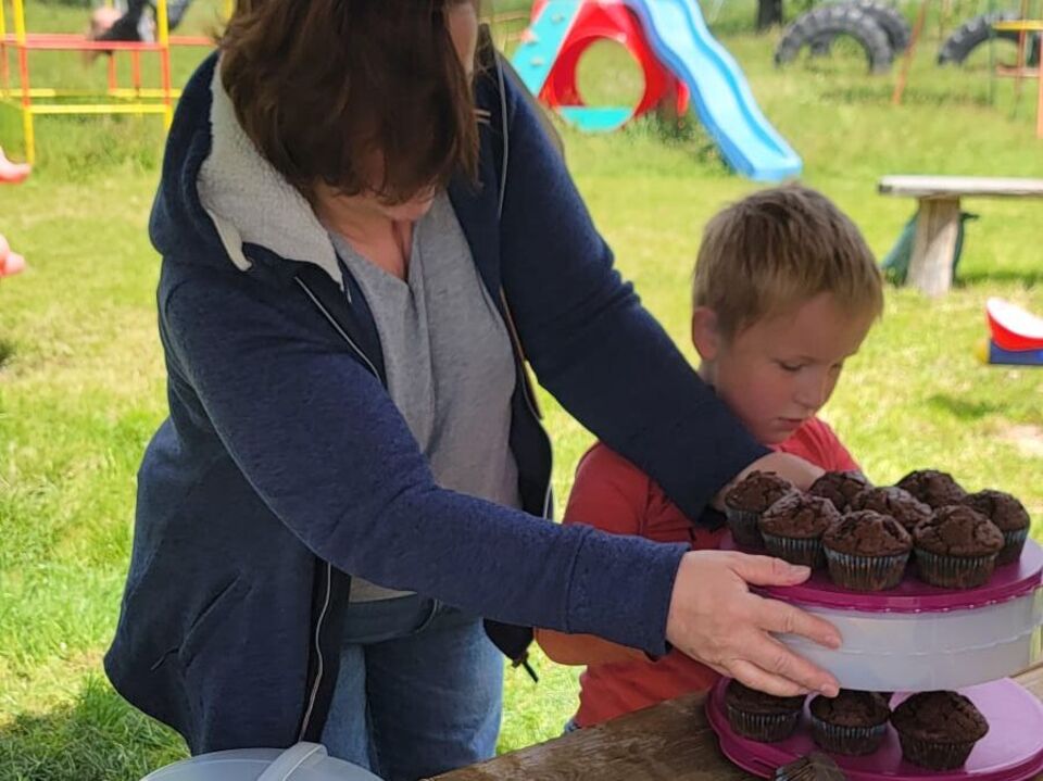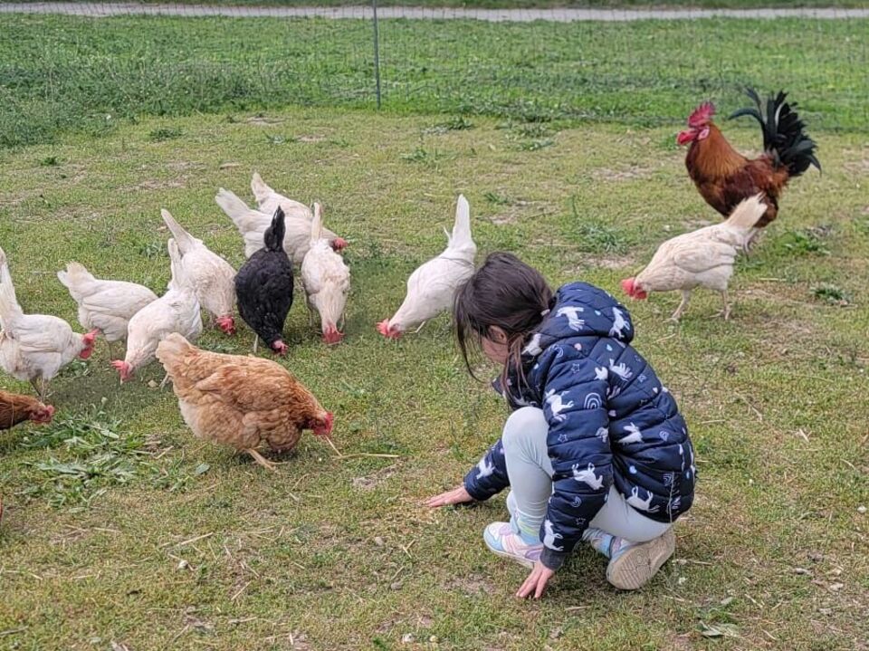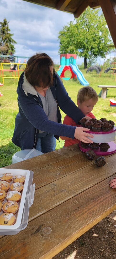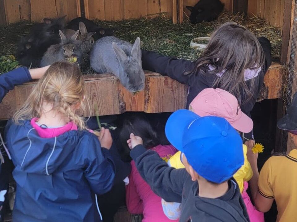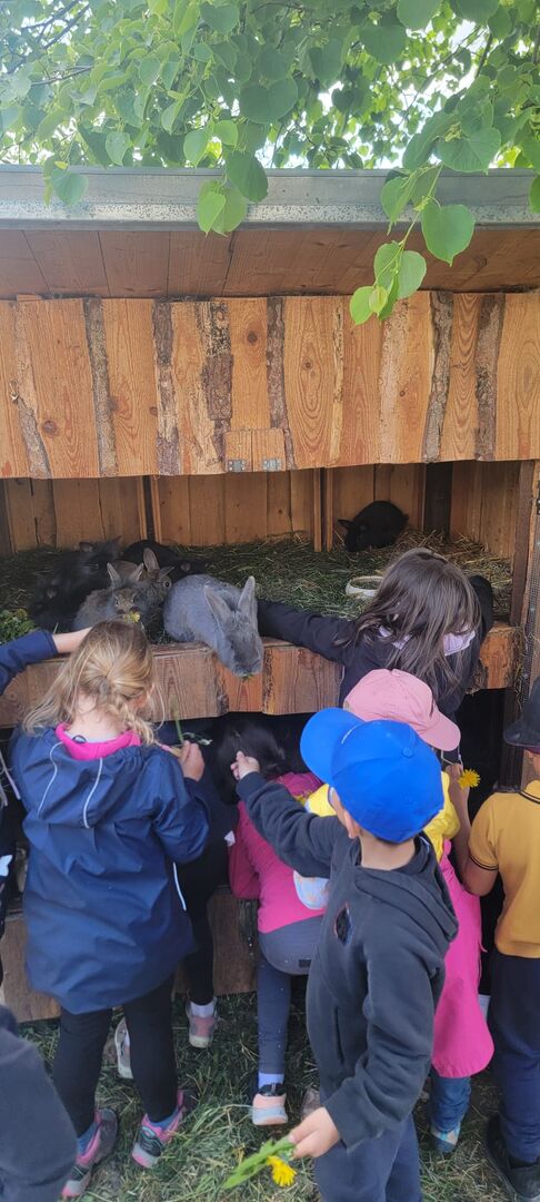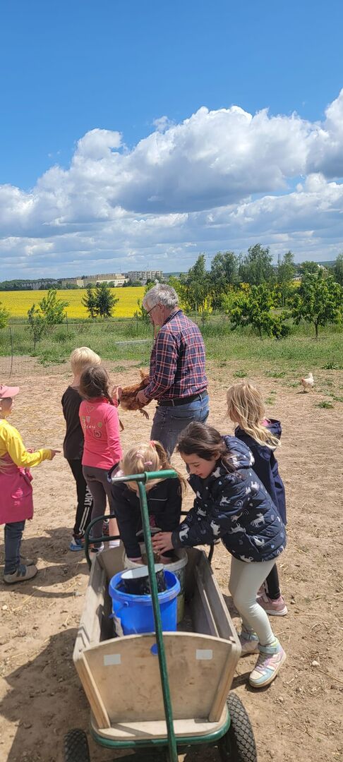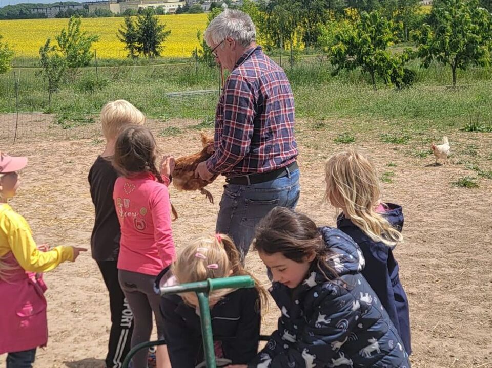 Geschafft und hungrig waren alle am Ziel angekommen. Dort wartete schon ein großer Nudeltopf auf die Kinder. Nach dieser Stärkung waren dann alle bereit für eine Führung über das Gelände. Die Hasen freuten sich über den Löwenzahn und die Hühner über das Weizenfutter. Nachdem alle Eier eingesammelt waren, ging es auf den Spielplatz. Dort angekommen, wurden alle Kinder noch mit einem leckeren Muffin von Leo´s Mama überrascht.